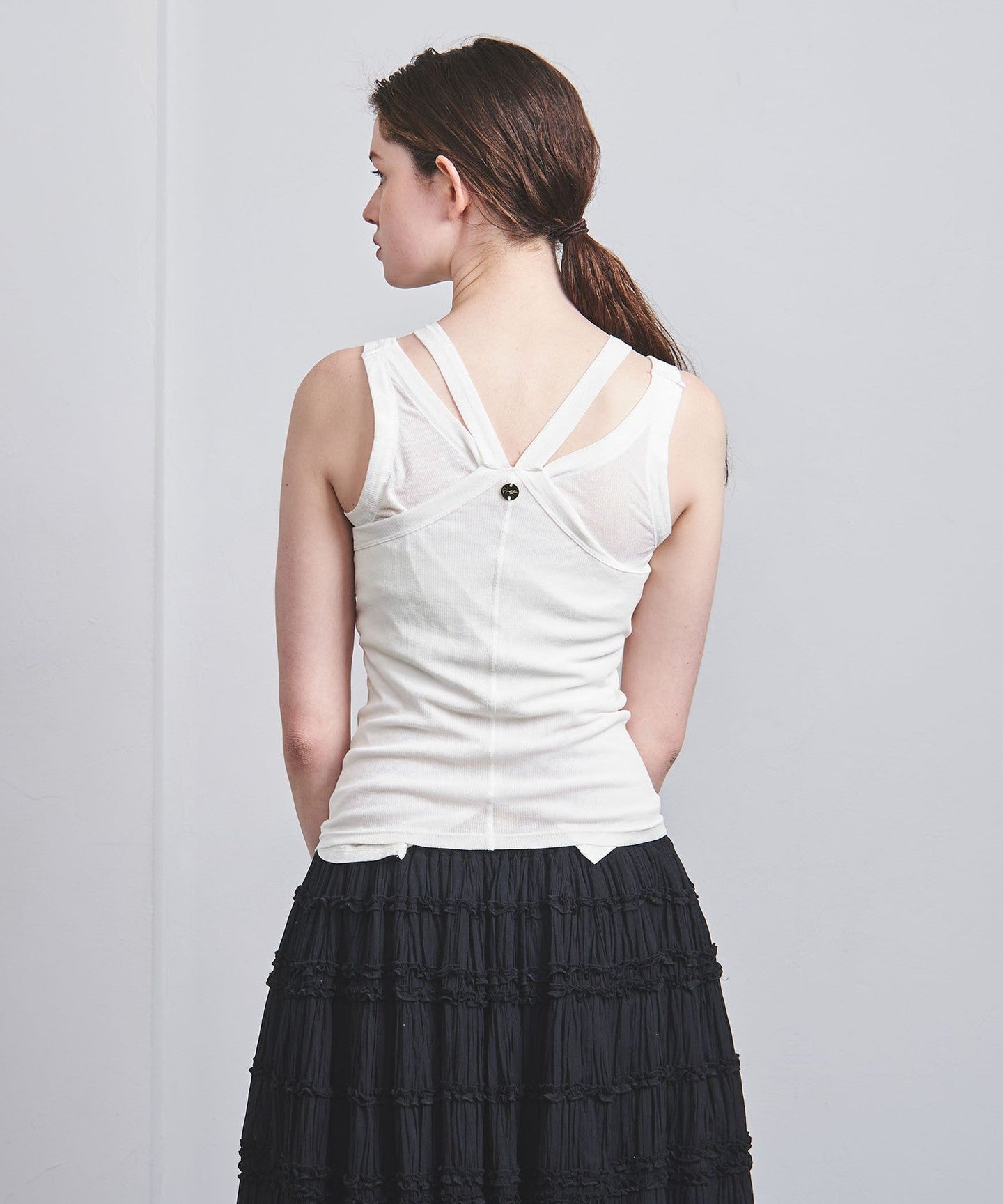 A layered tank top that combines different U-shaped and Y-shaped neck designs.