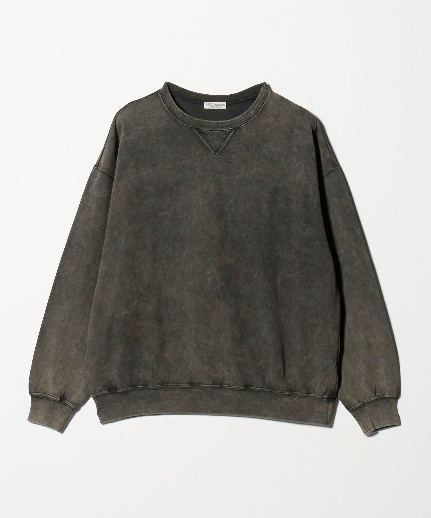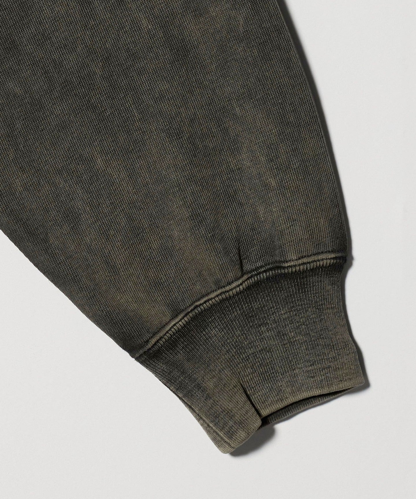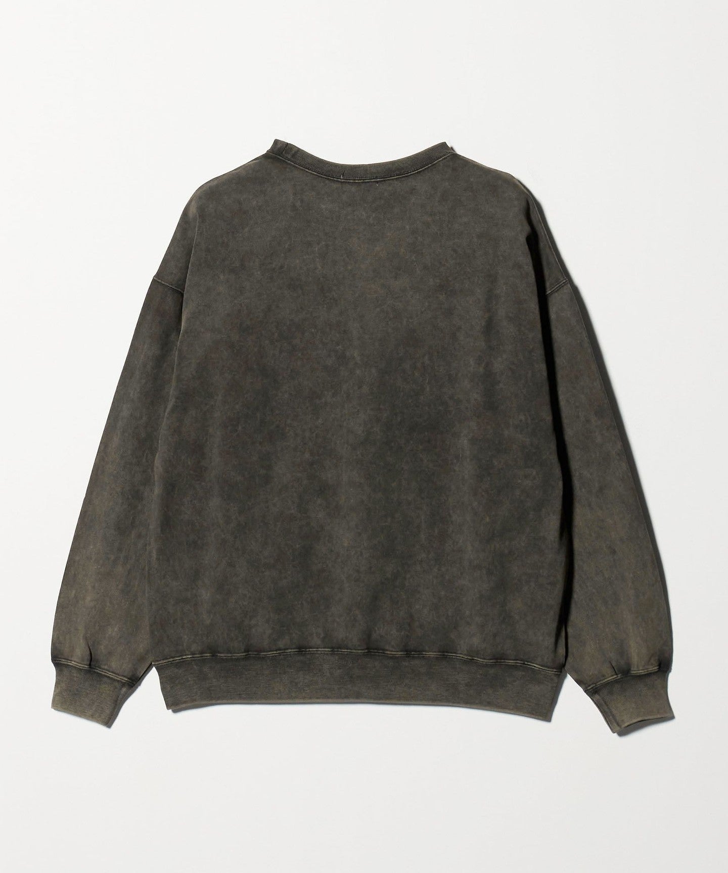This sweatshirt has an attractive uneven faded look created by using special dyes and powder bleaching.