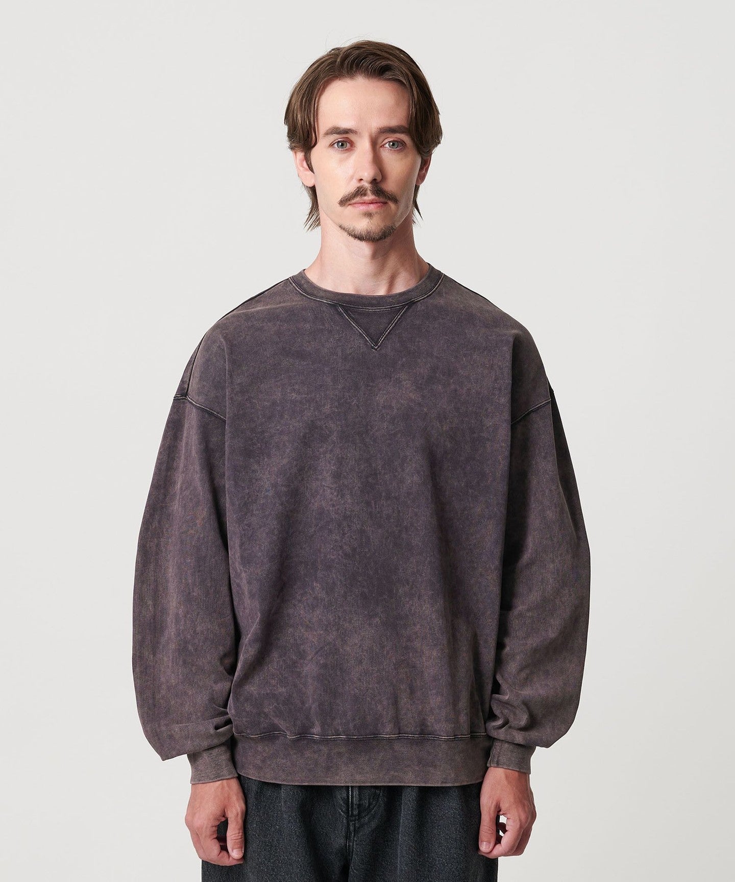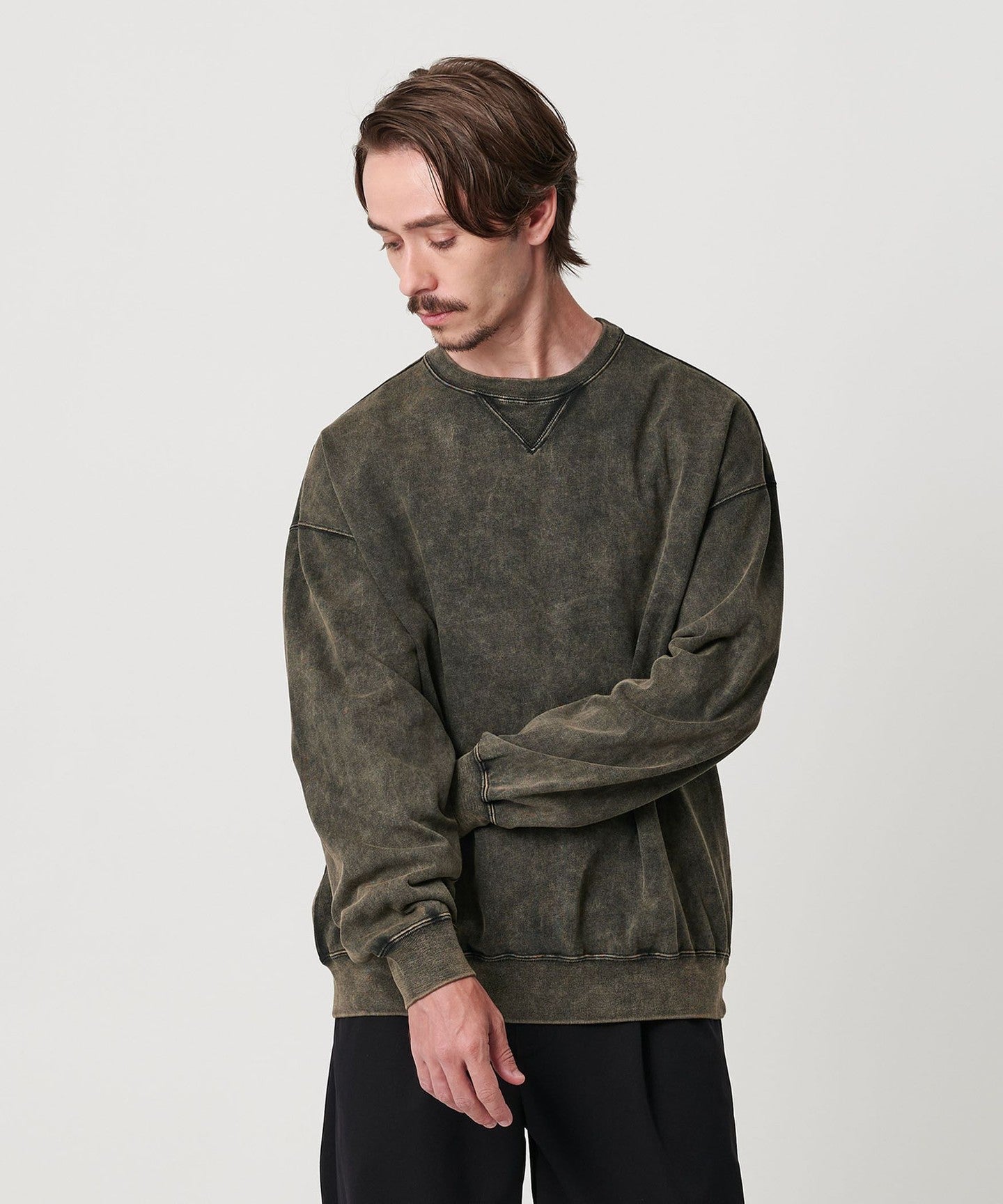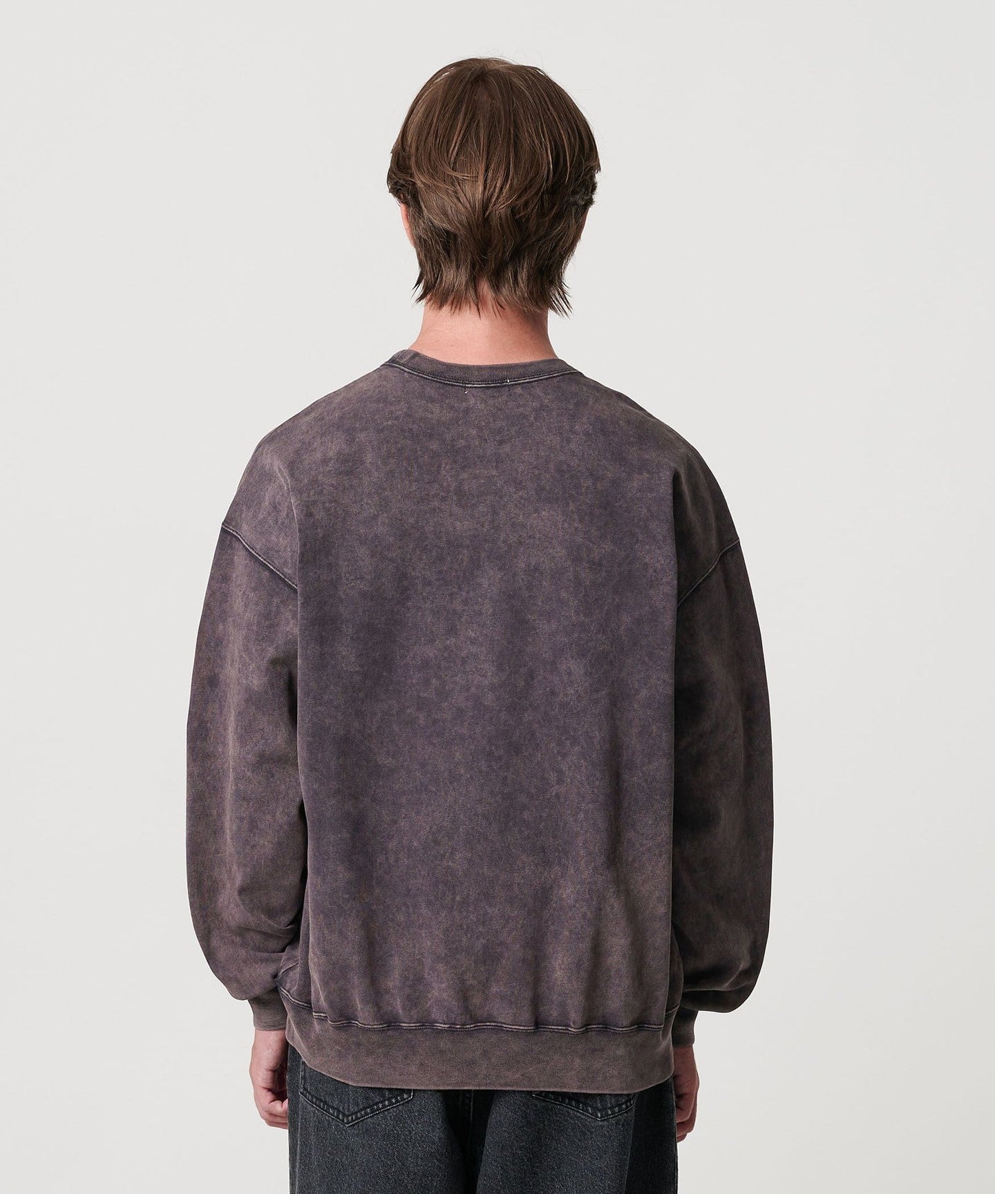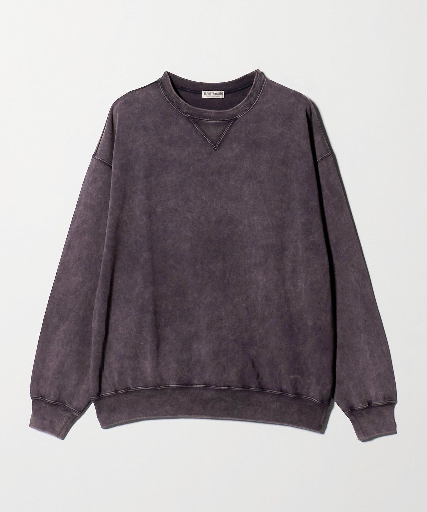 This sweatshirt has an attractive uneven faded look created by using special dyes and powder bleaching.