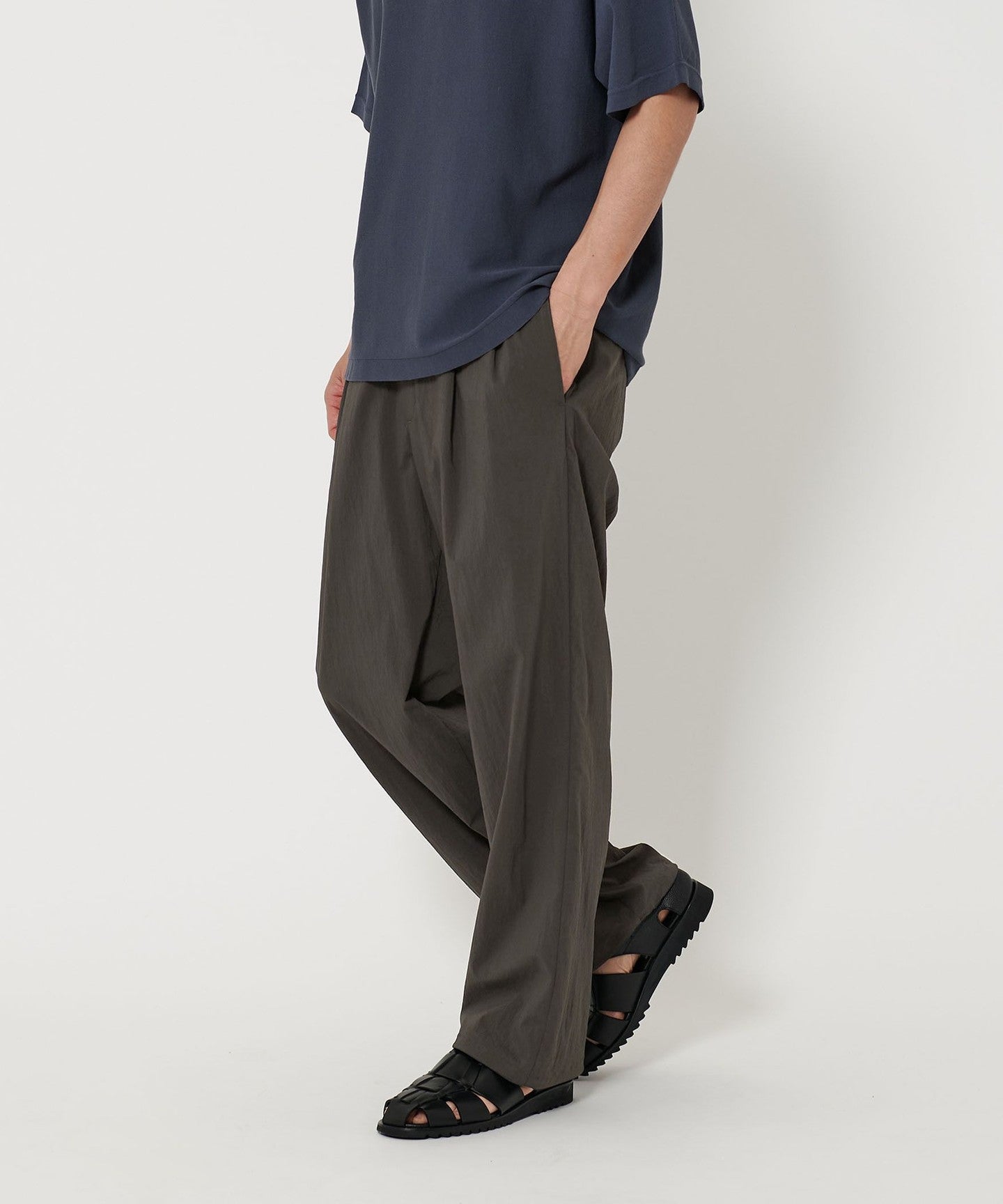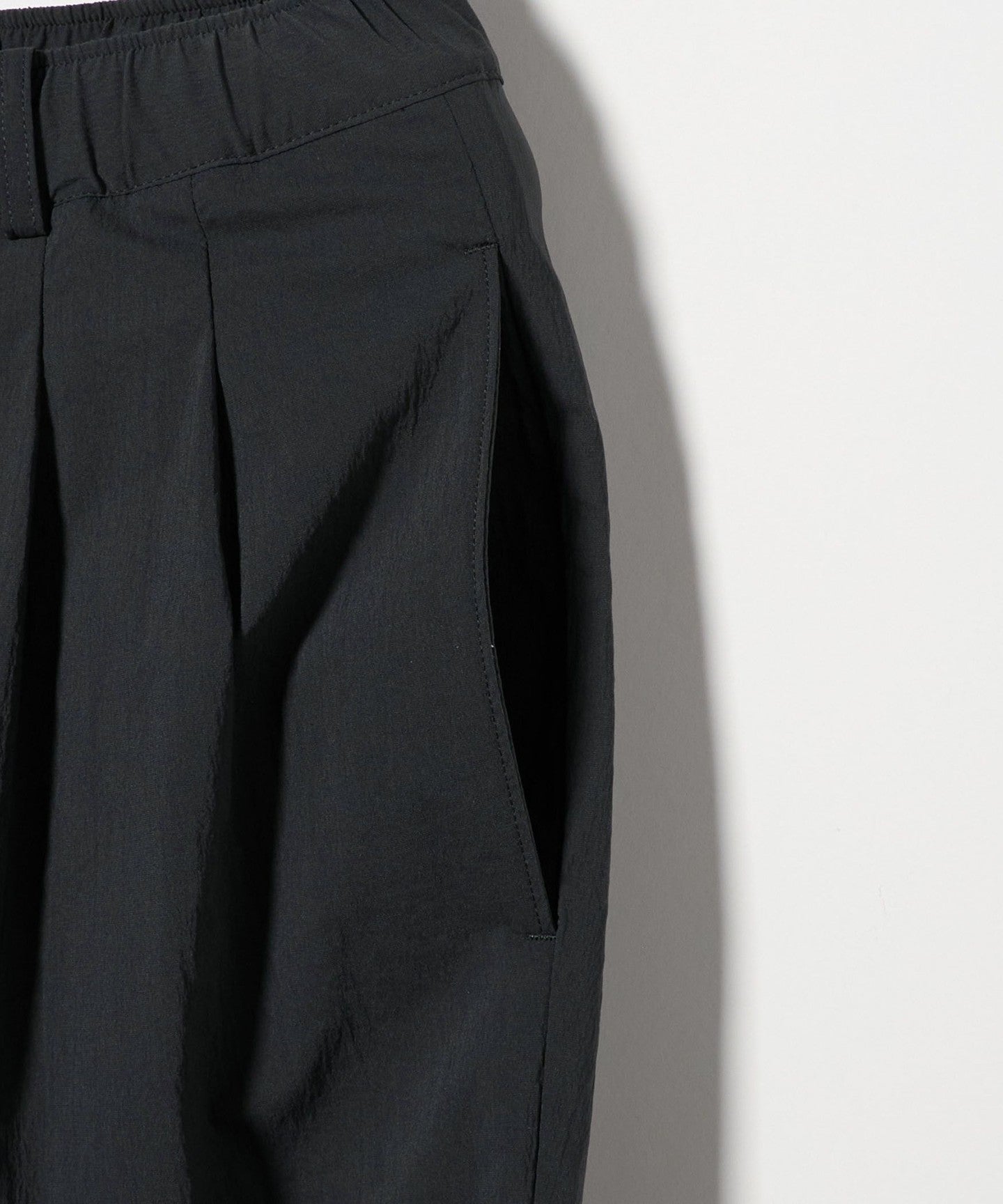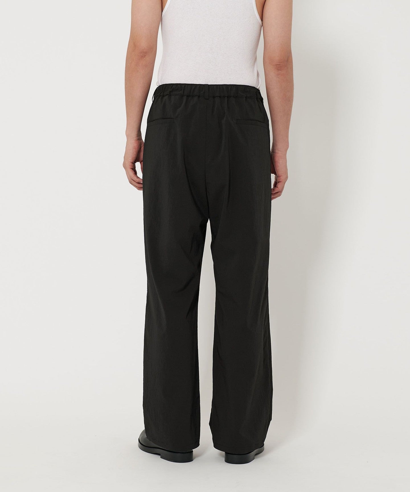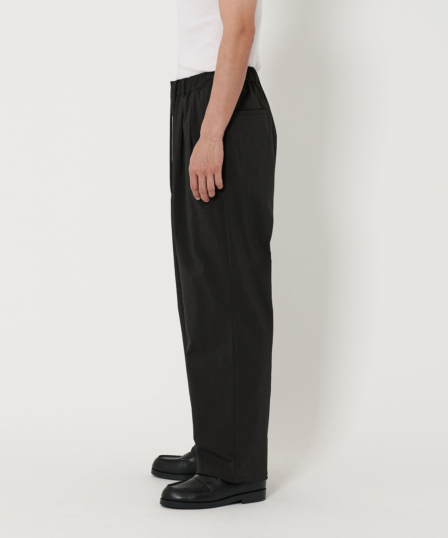 The waist area is made fluffy with two tucks, and there is almost no tapering from the knee to the hem, so it fits nicely without clinging to the leg lines too much.