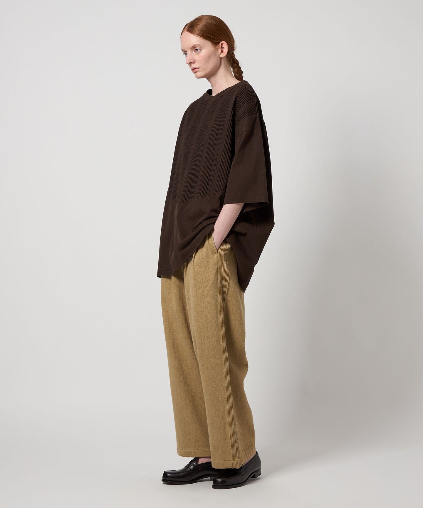 It features pin tucks on the sides and a relaxed silhouette that brings out the texture of the softly woven handwoven fabric.