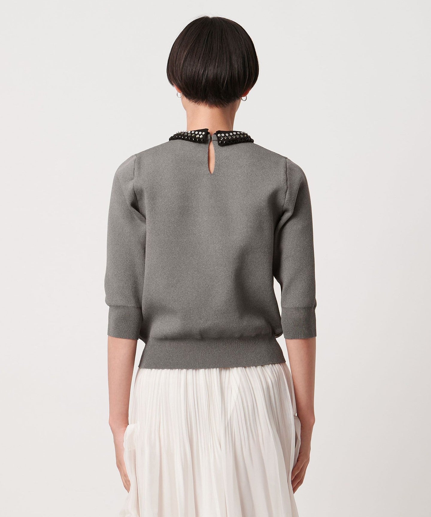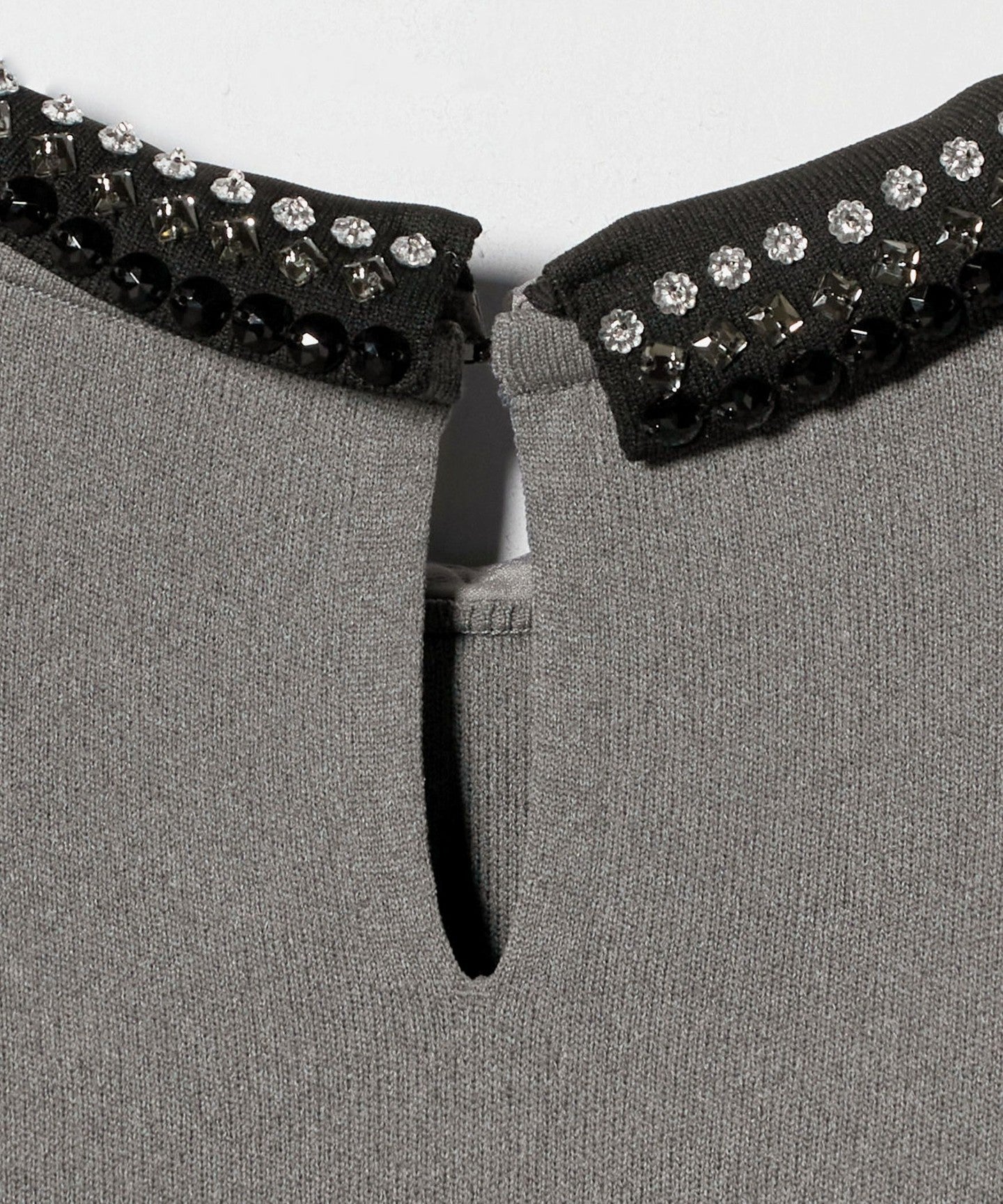 A 2-way knit with a gorgeous jeweled collar that catches the eye