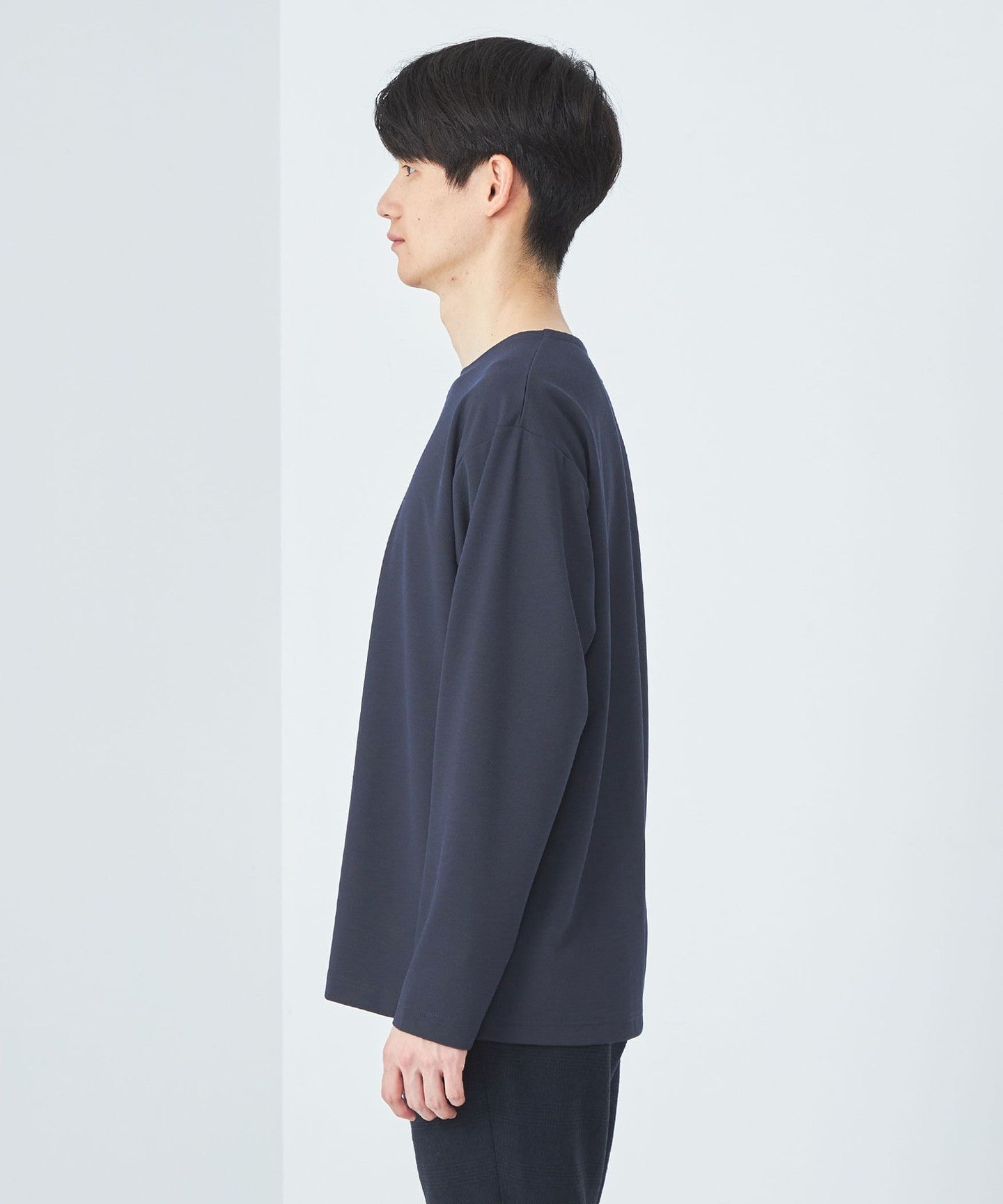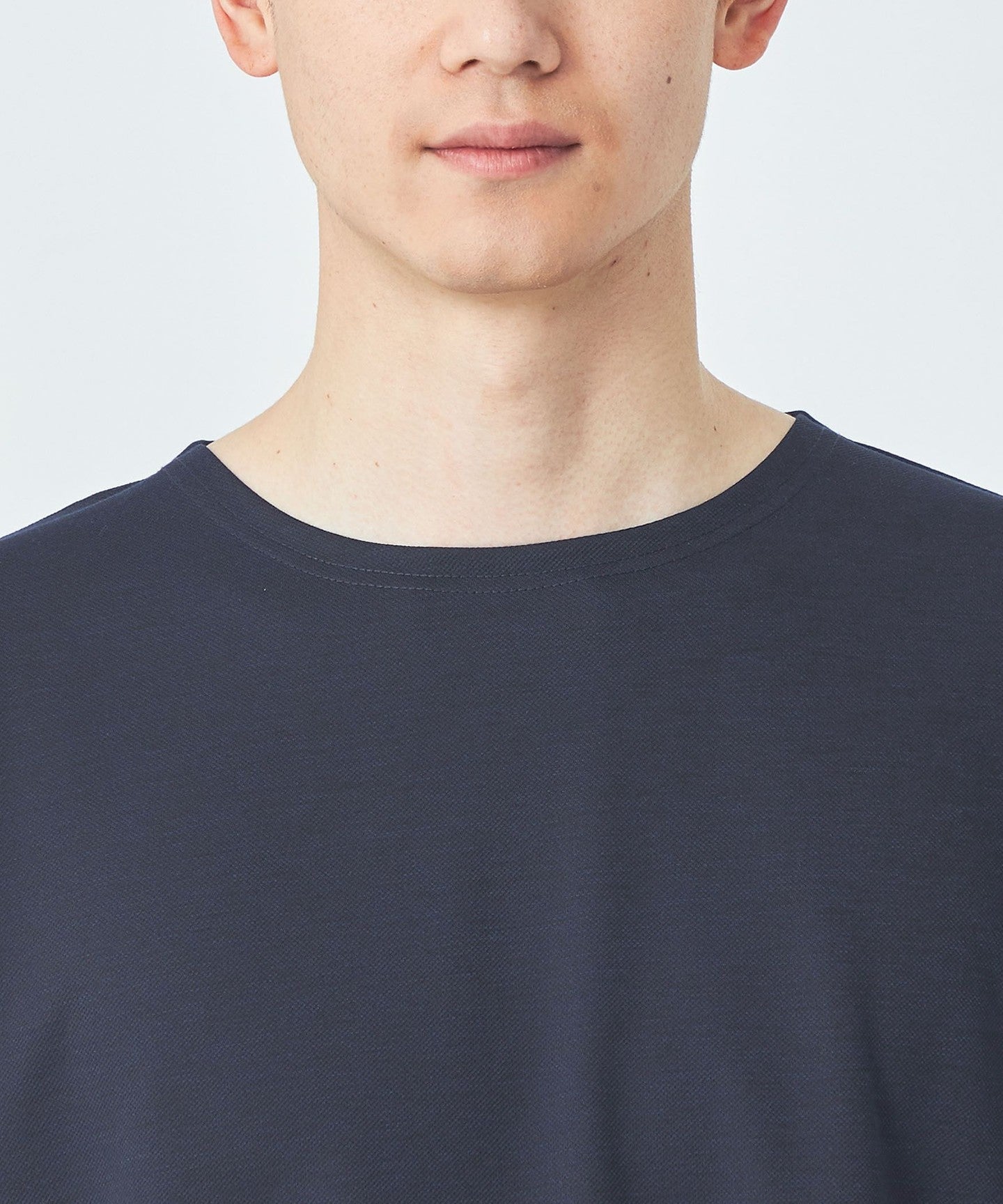 This is a slightly loose-fitting collarless T-shirt.