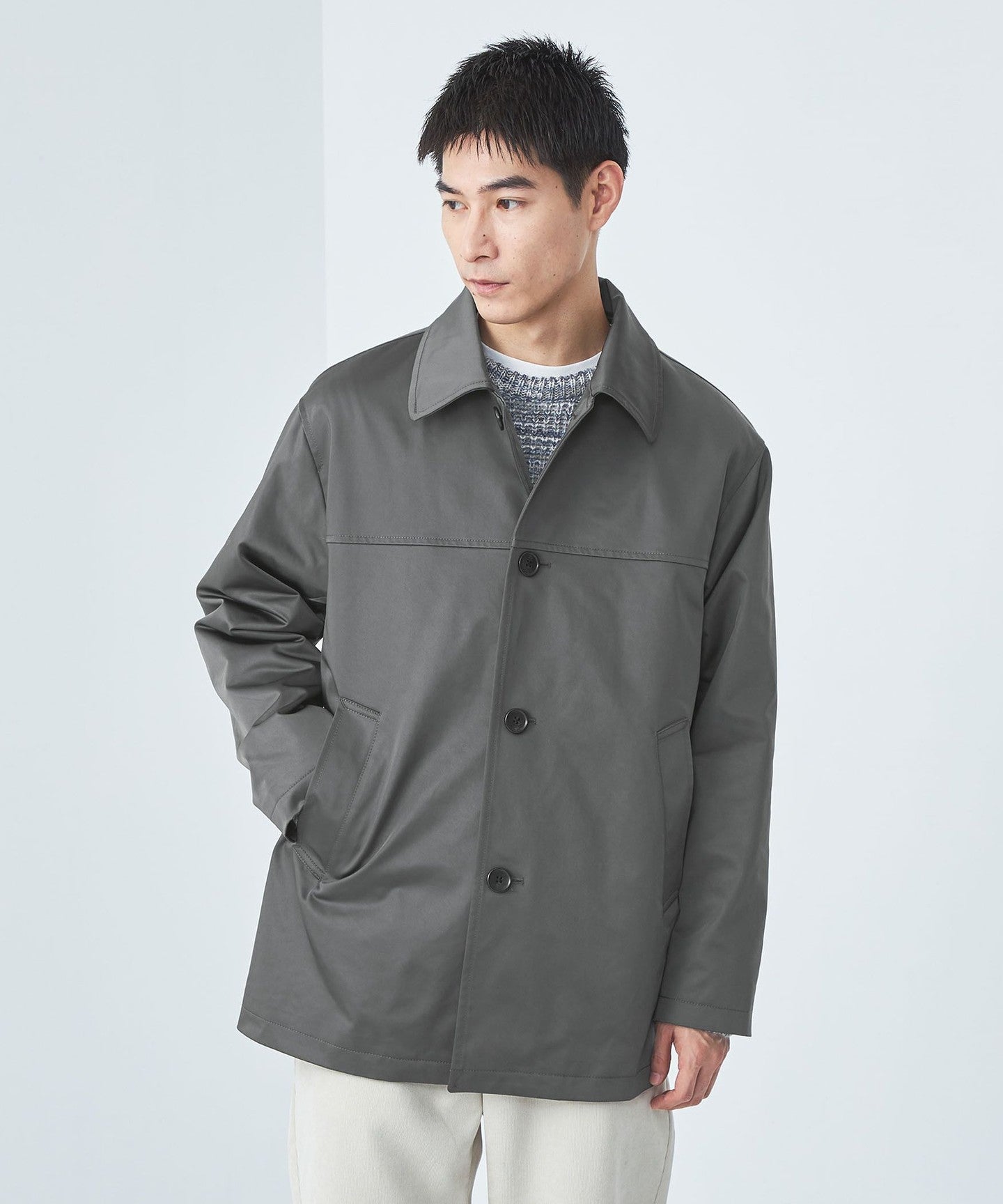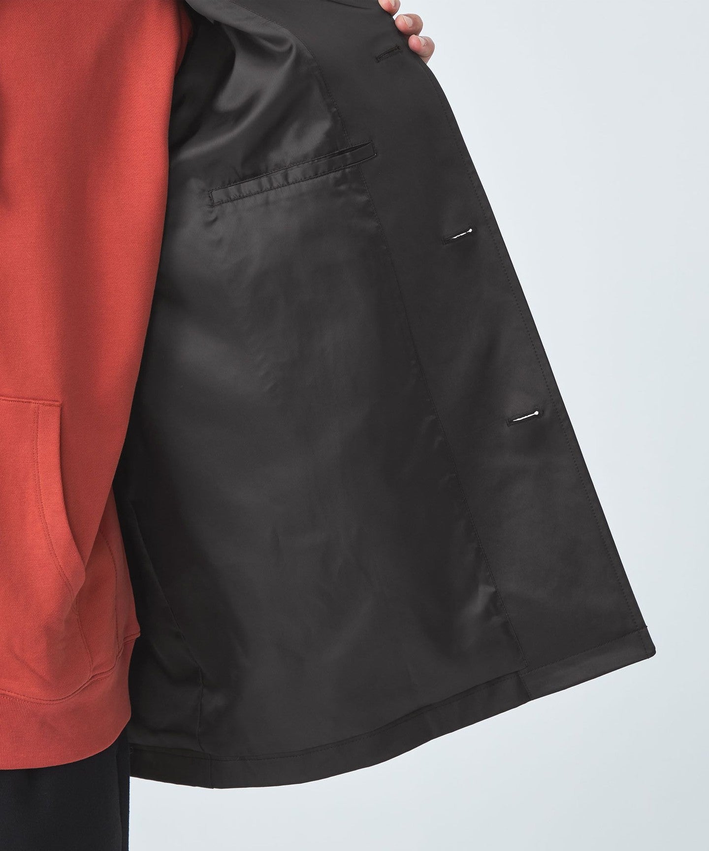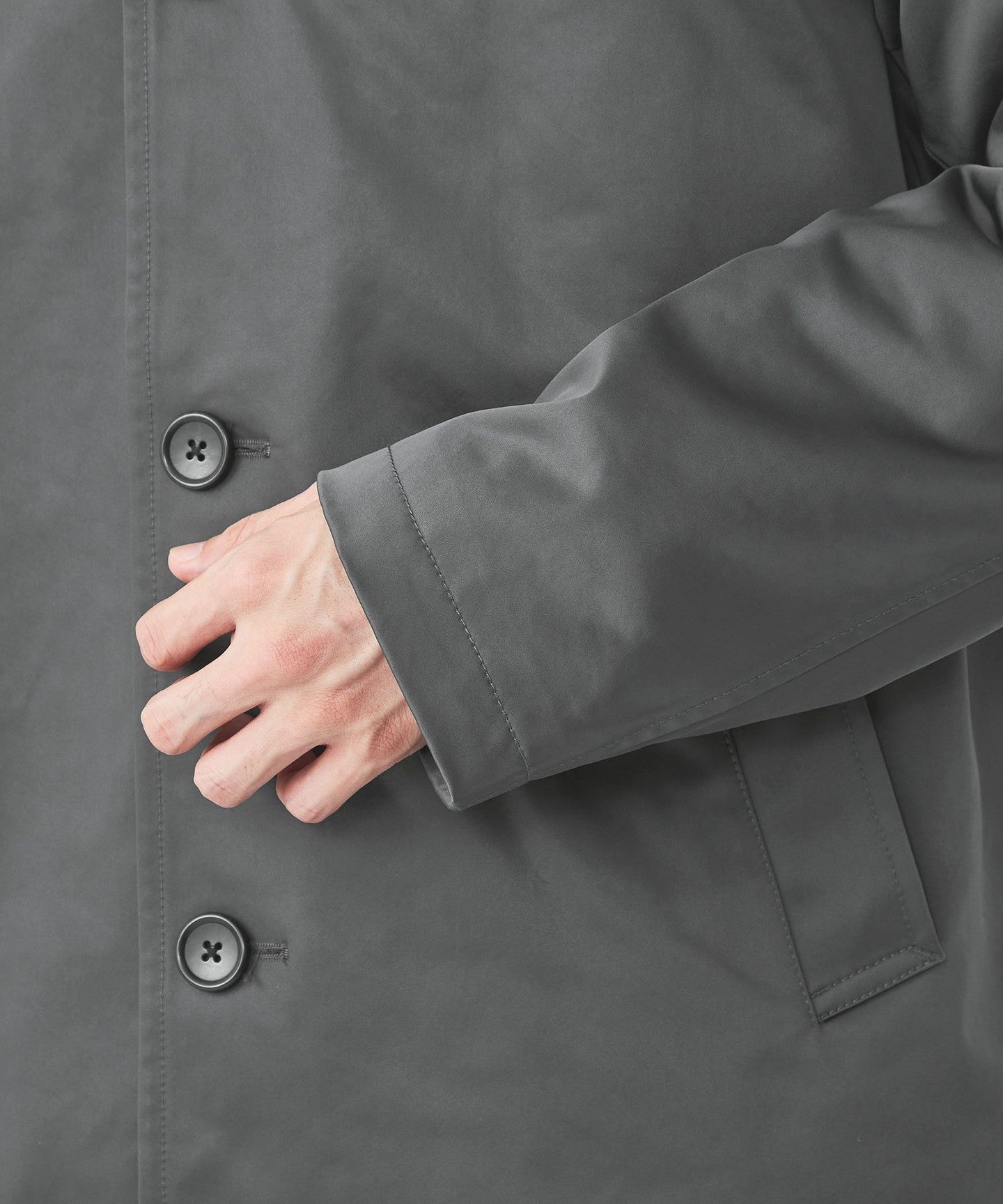 There are slant pockets at the waist and one inner pocket on each side, making it convenient for storage.