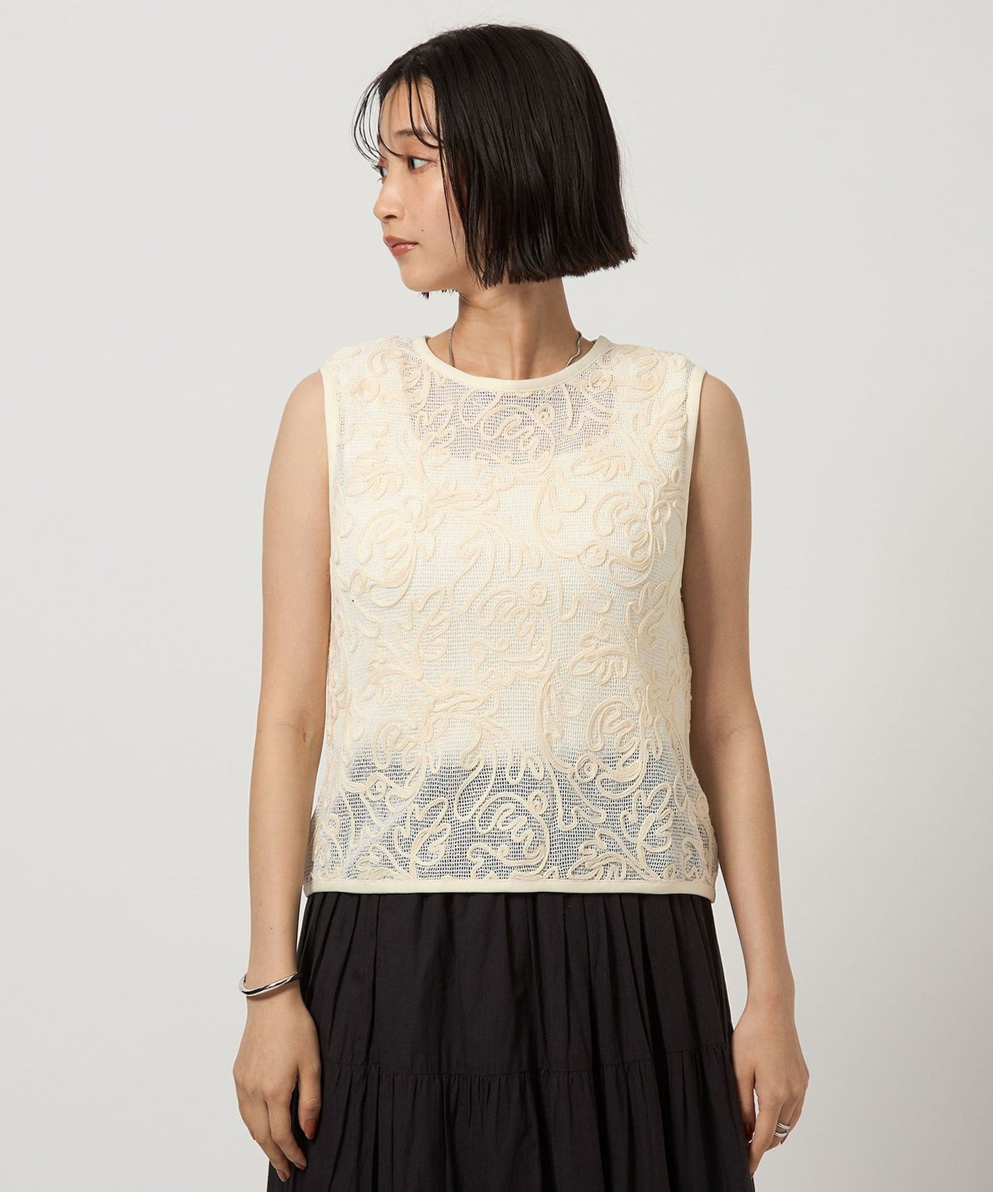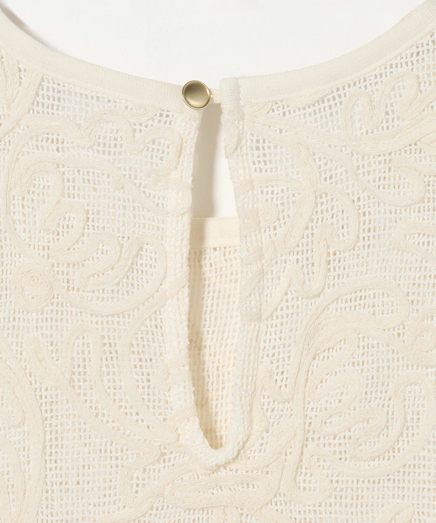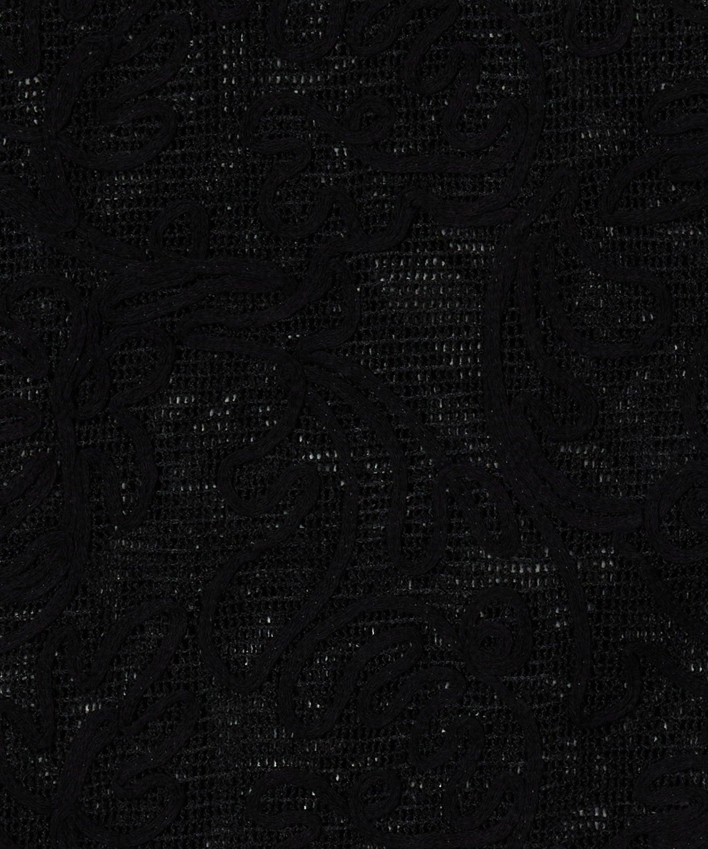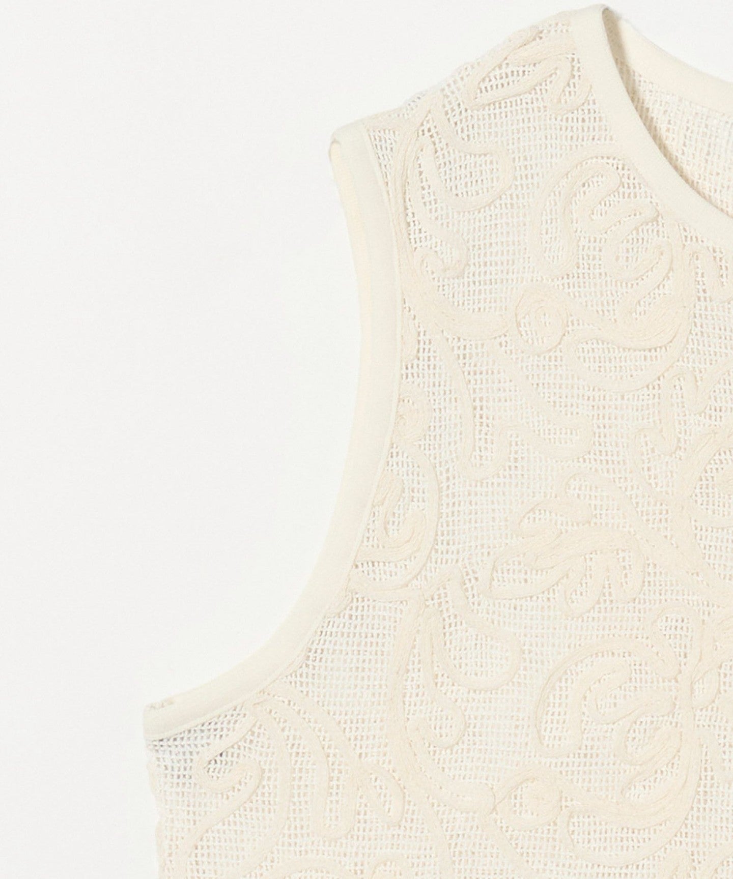 A material with a craft feel, made from mesh fabric with cord embroidery.