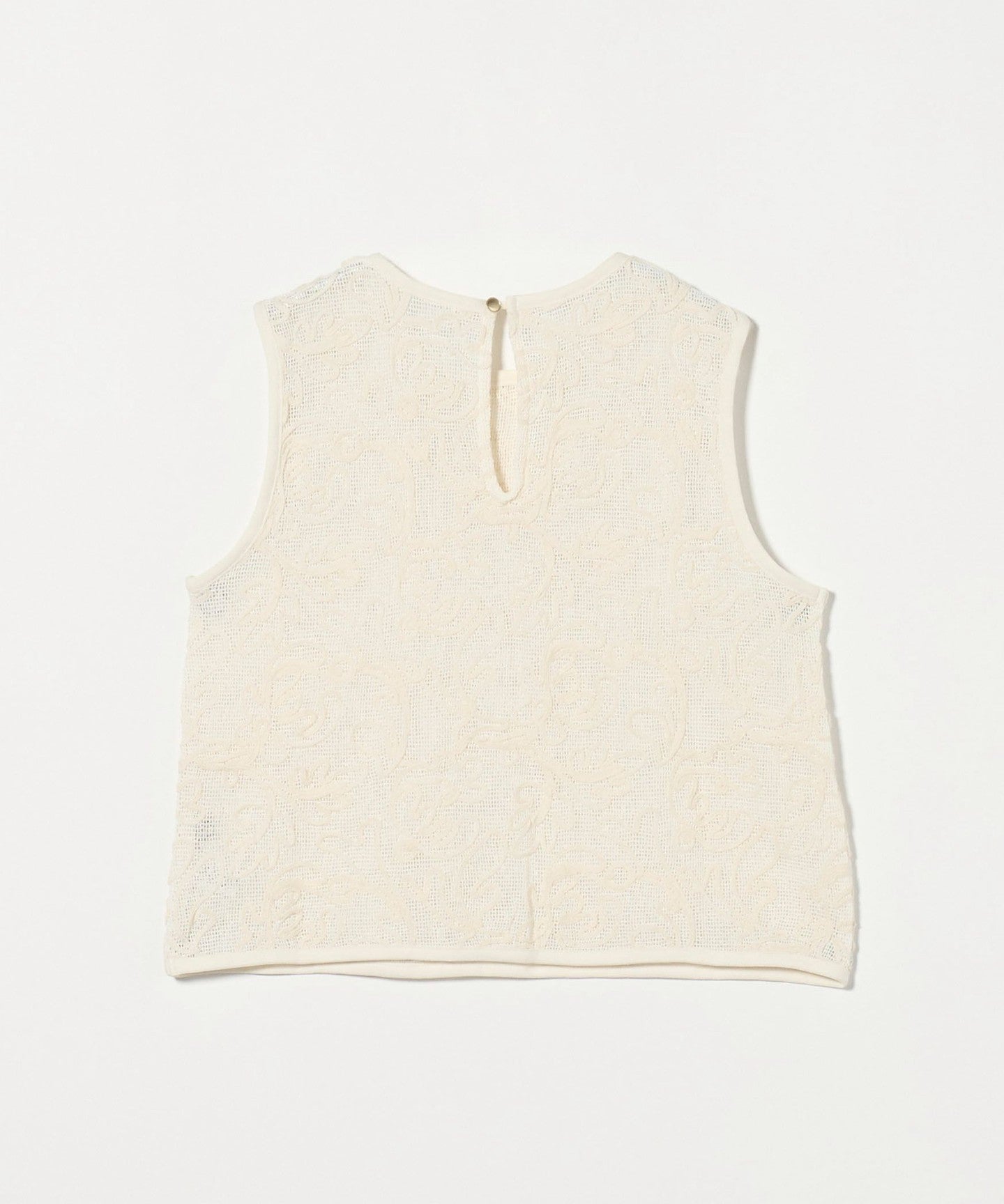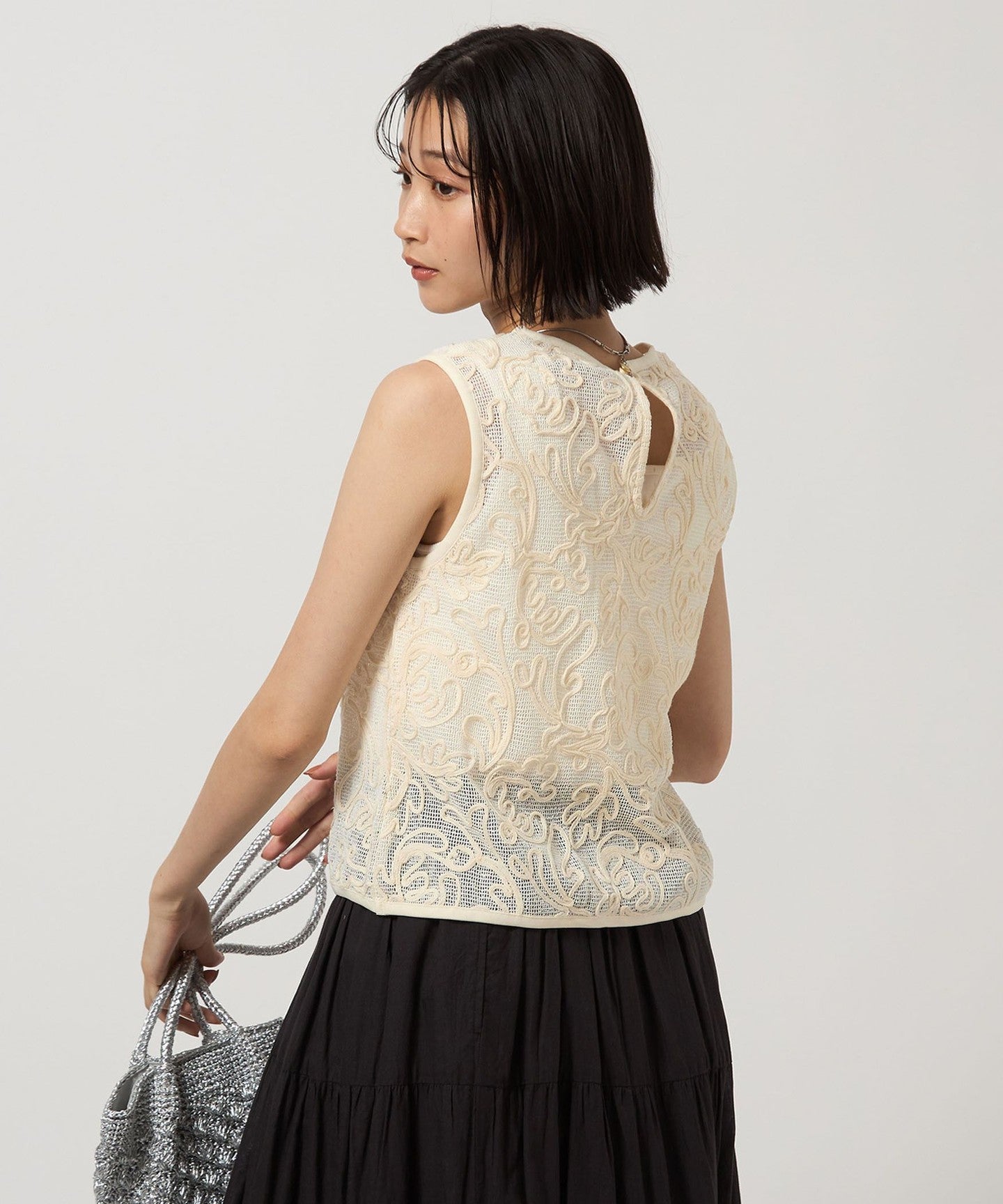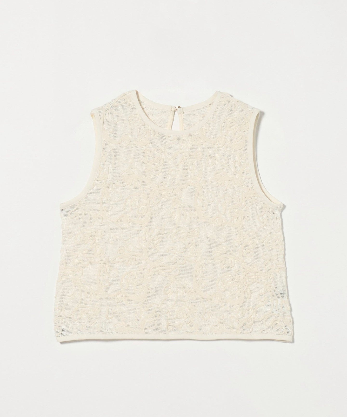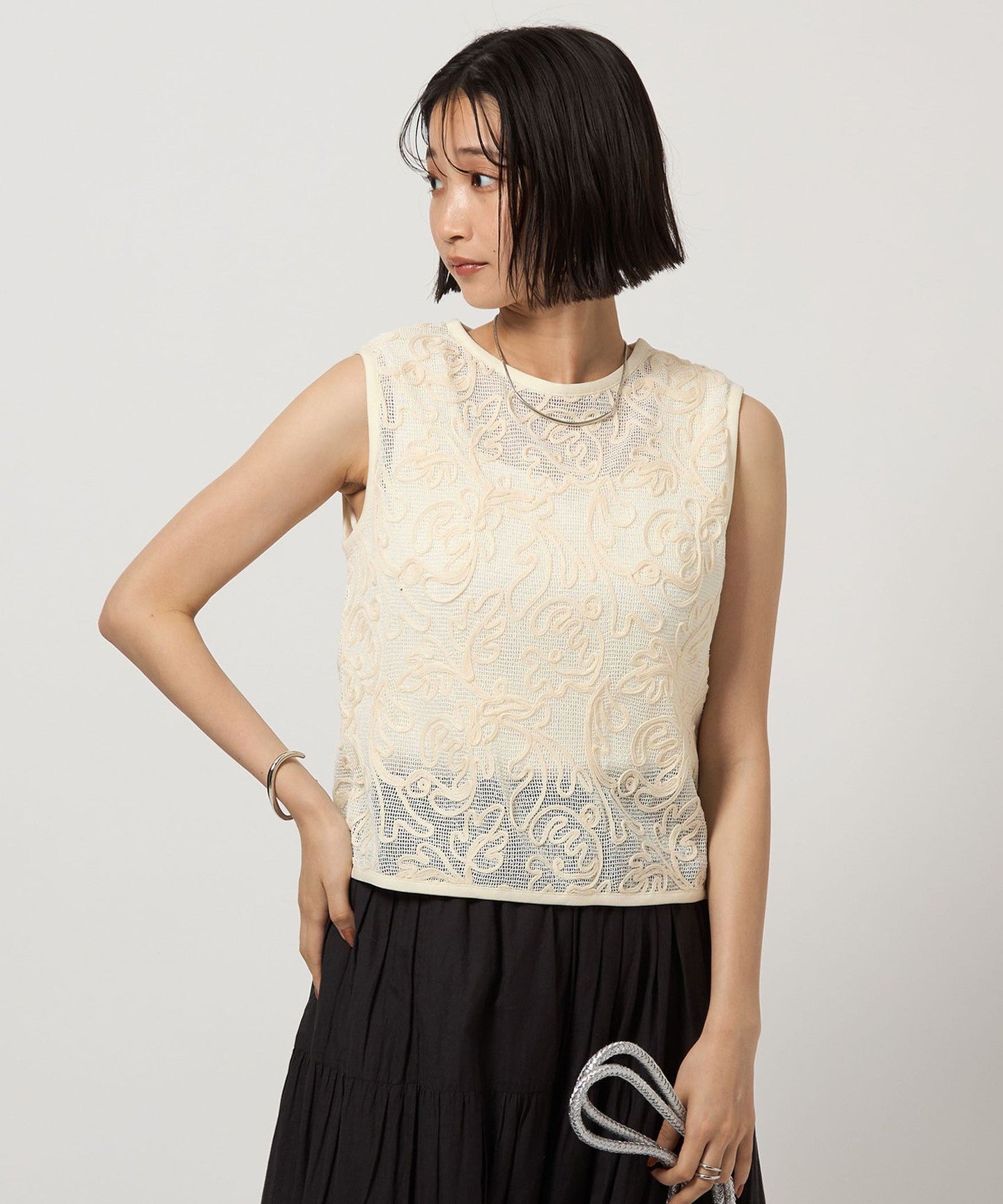 A material with a craft feel, made from mesh fabric with cord embroidery.