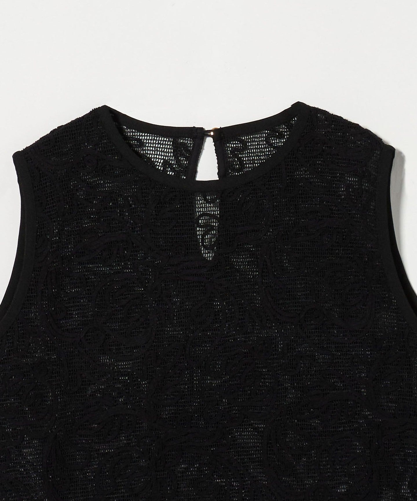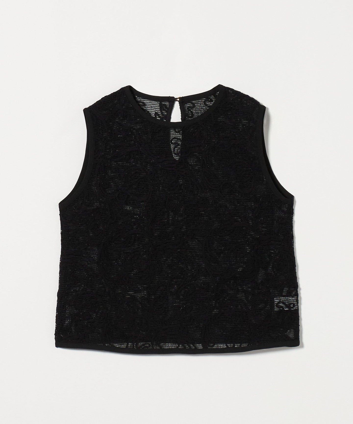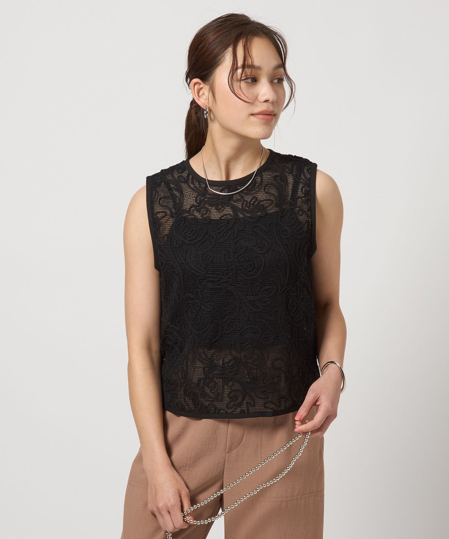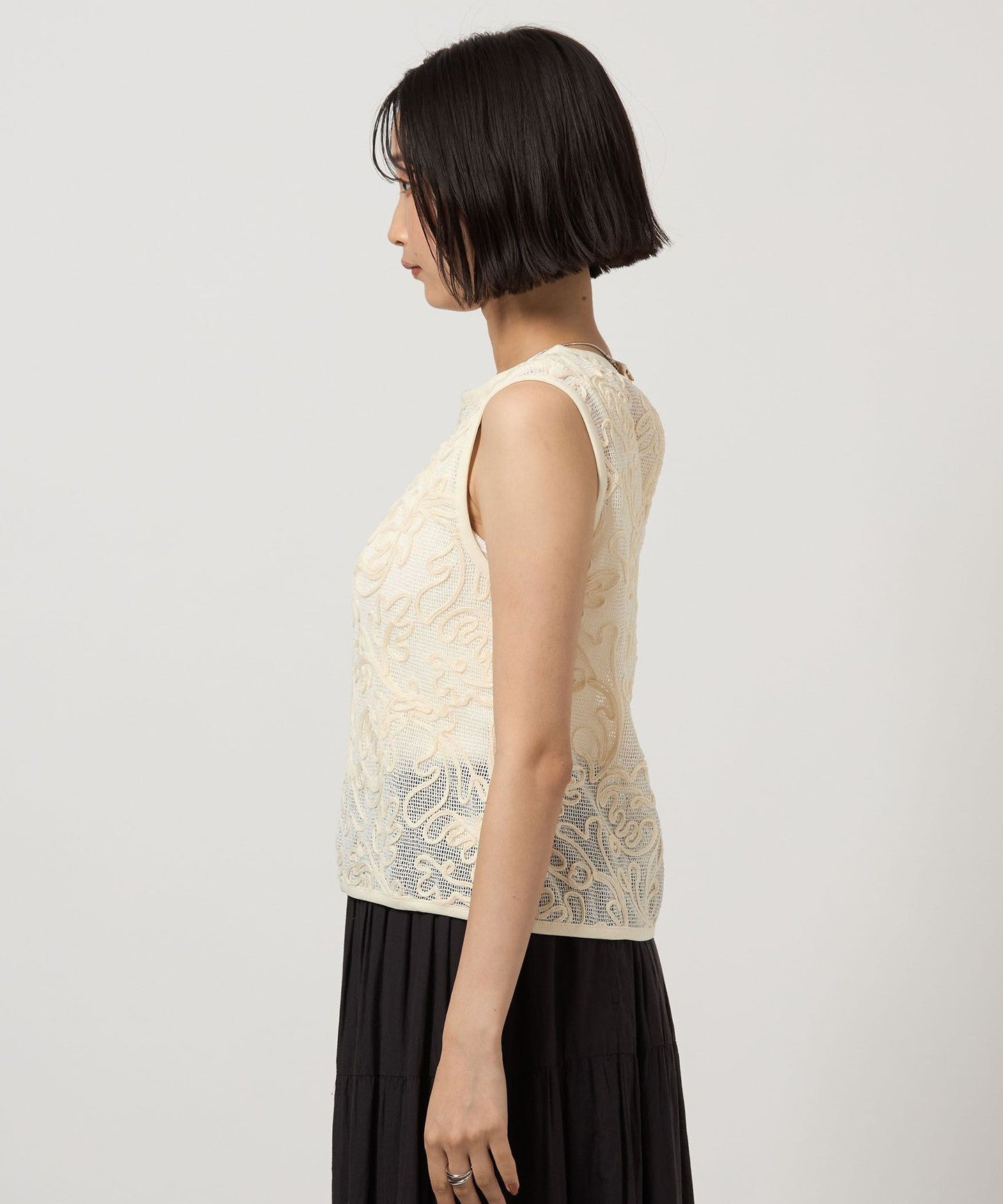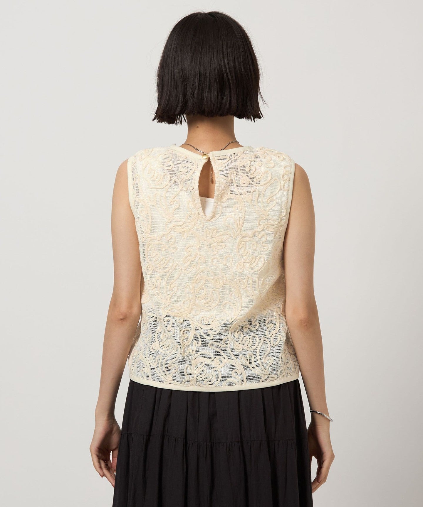 A material with a craft feel, made from mesh fabric with cord embroidery.