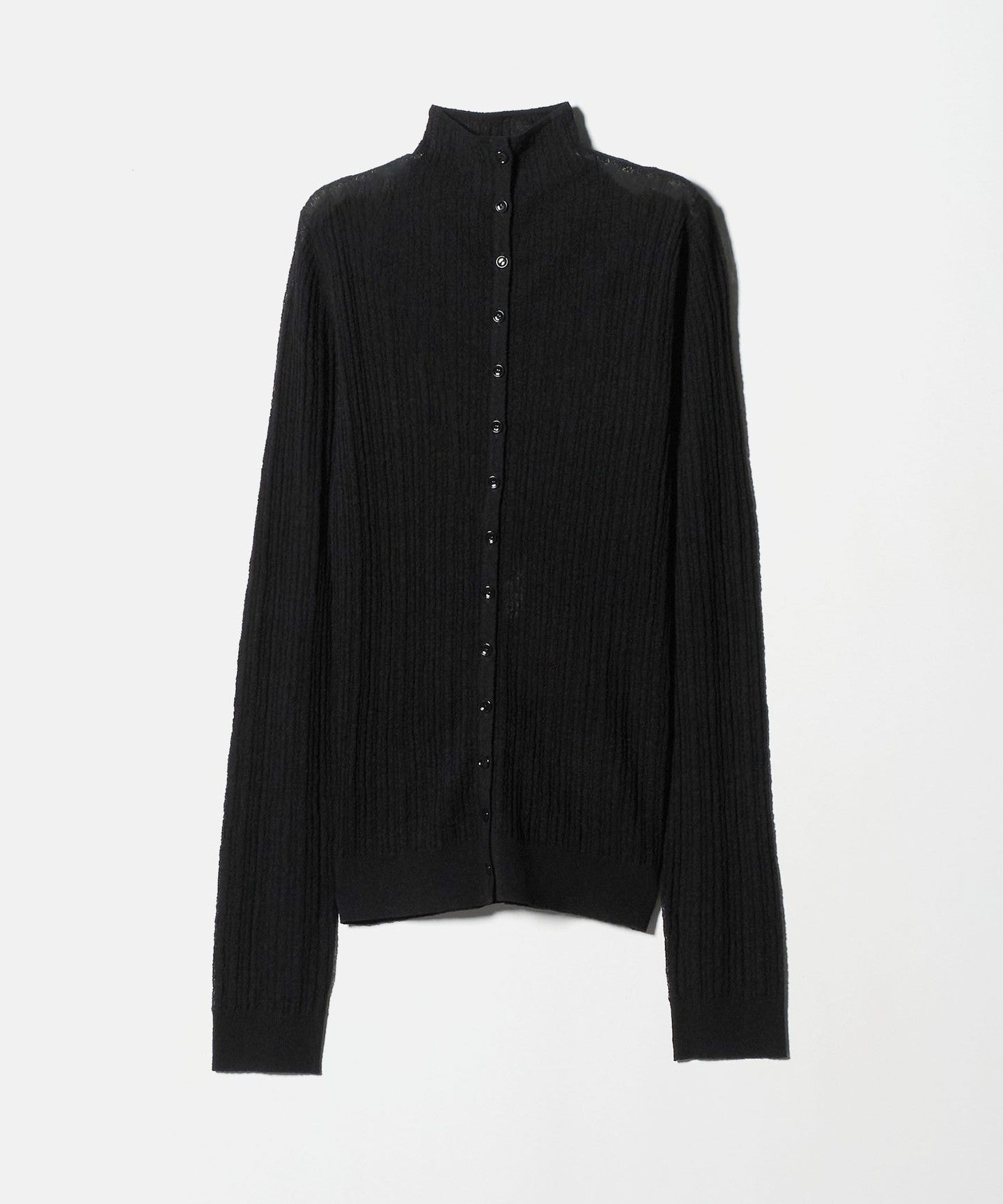 This bottle-neck cardigan features ample buttons for a glamorous look. Crafted from wool denite yarn with a distinctively textured texture, the tightly twisted fabric feels comfortable against the skin. The long sleeves add a touch of nuance, and the clean, sleek body makes it versatile enough to wear on its own or as an inner layer under a jacket. The sheer texture adds a touch of airiness to the conservative design, creating a casual yet modern style.