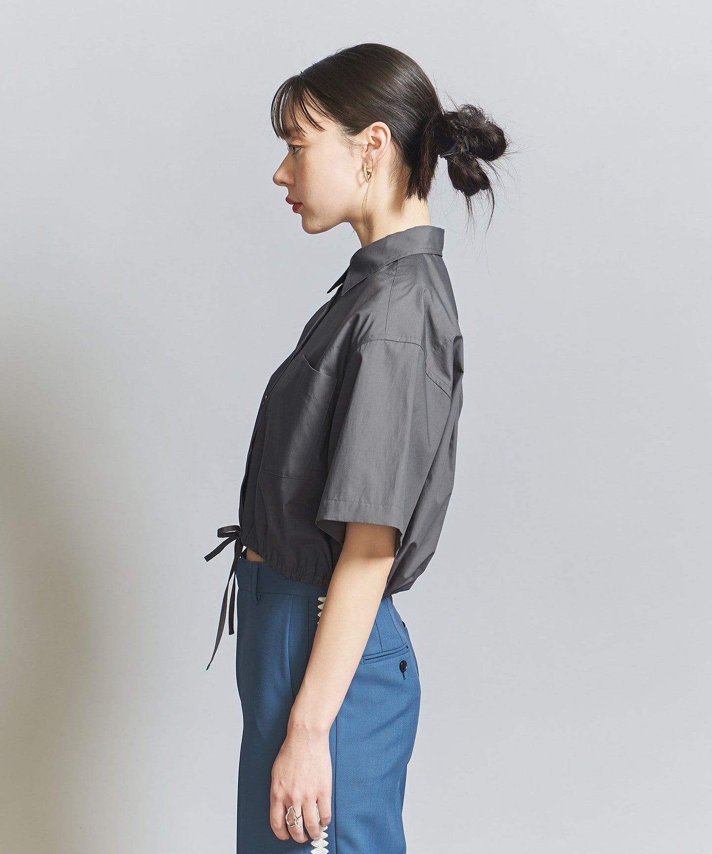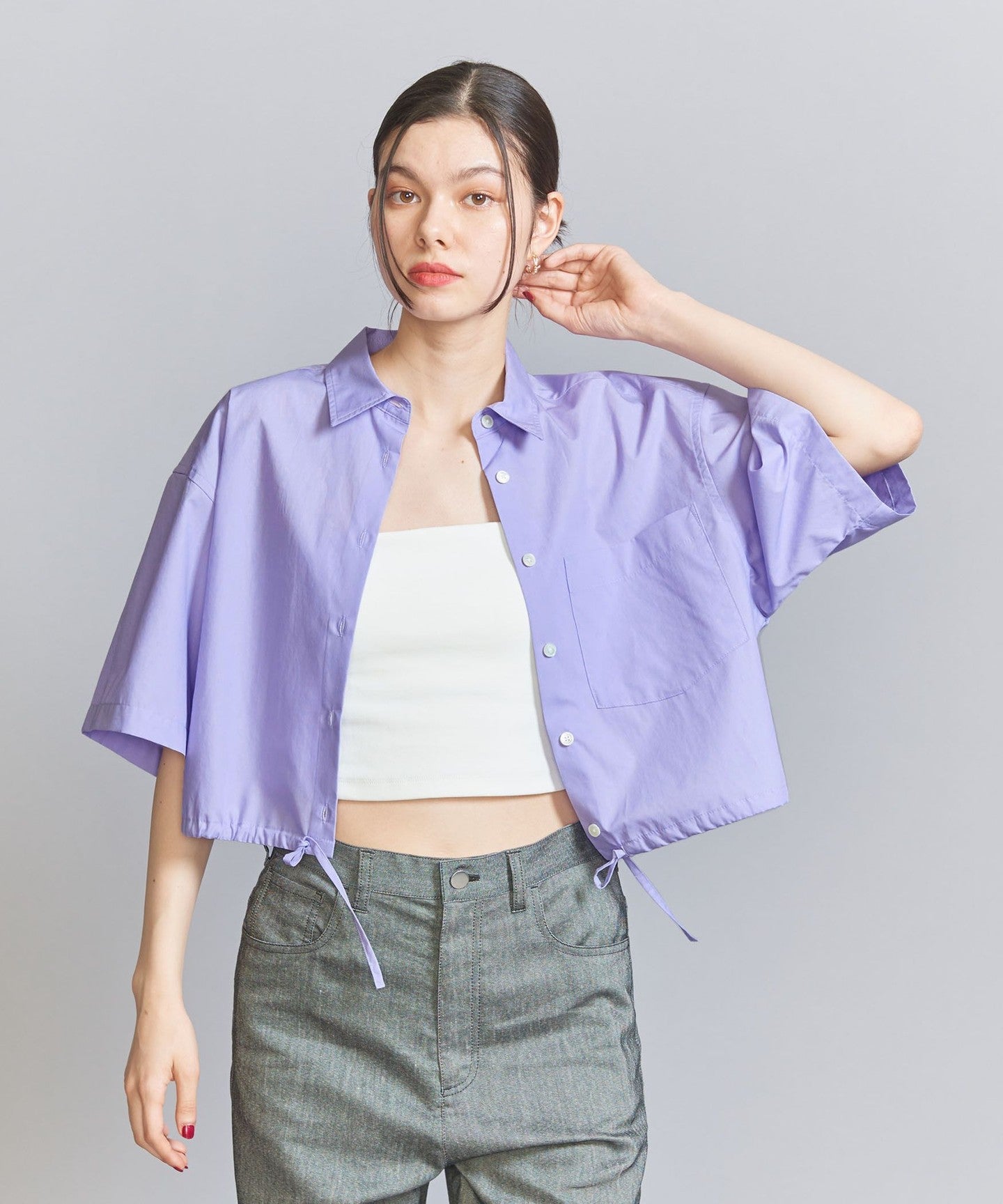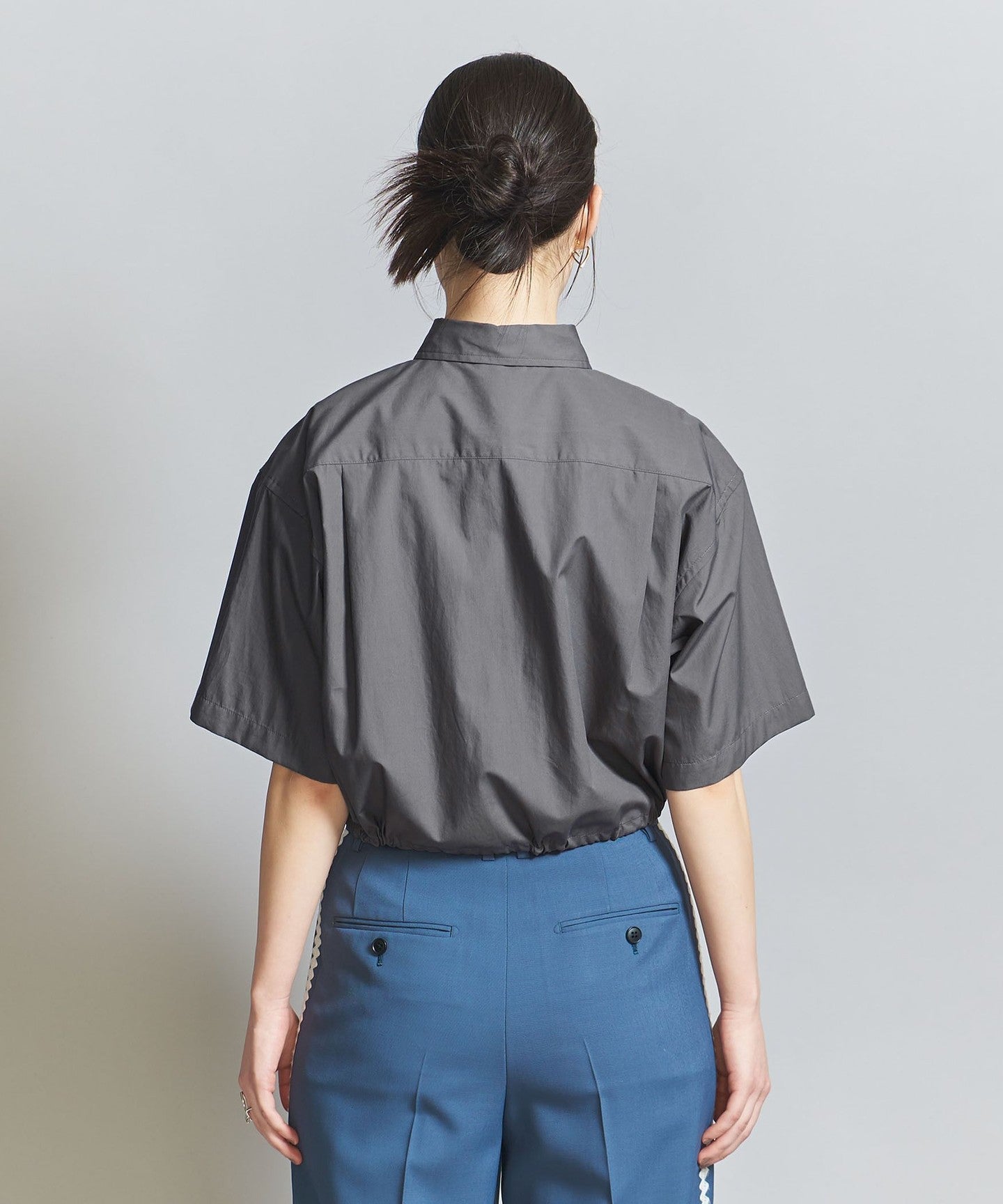 A short regular shirt with drawstring details at the hem.