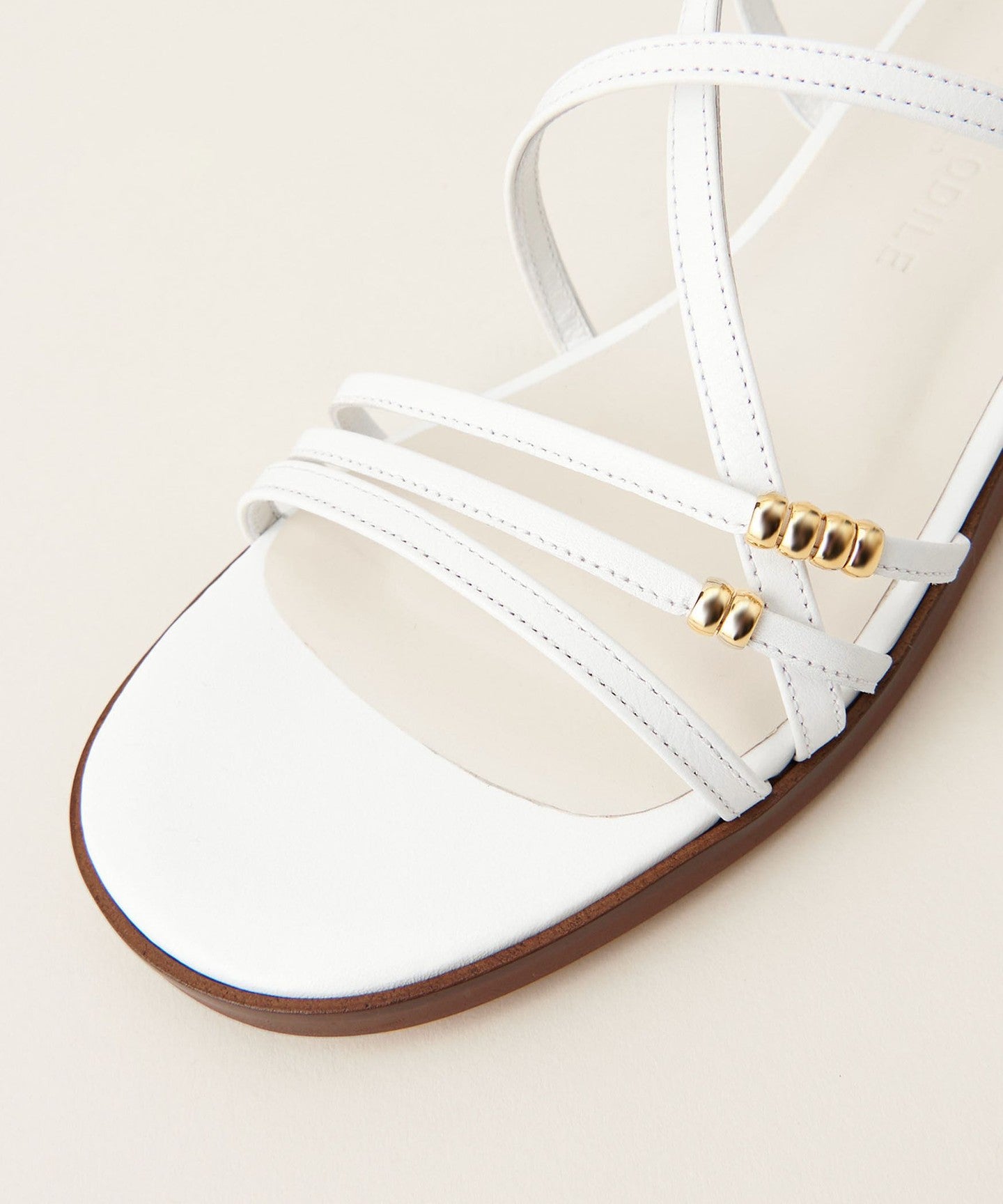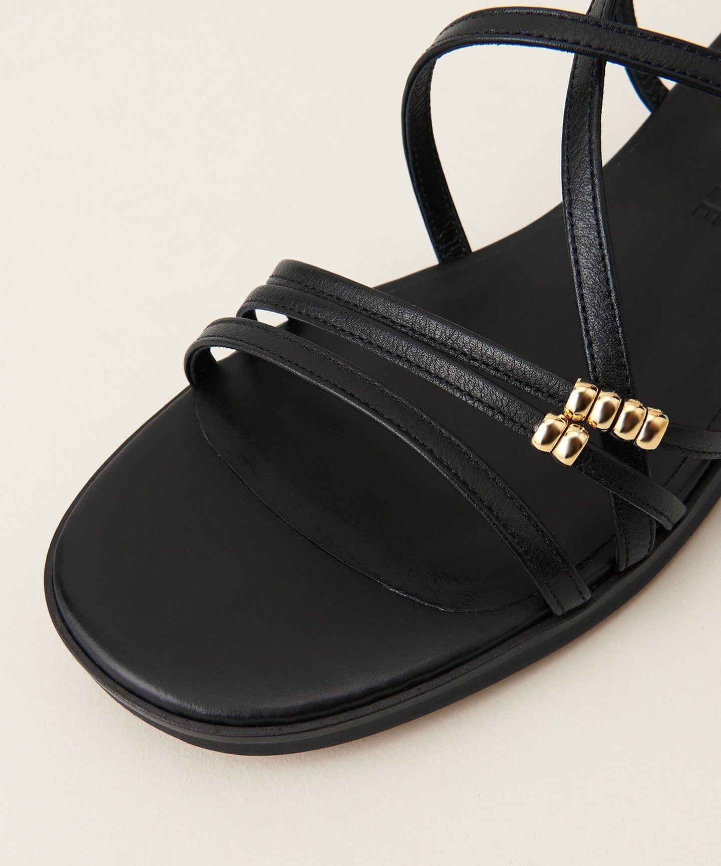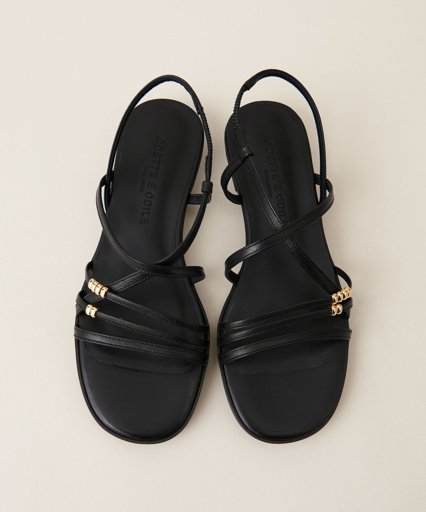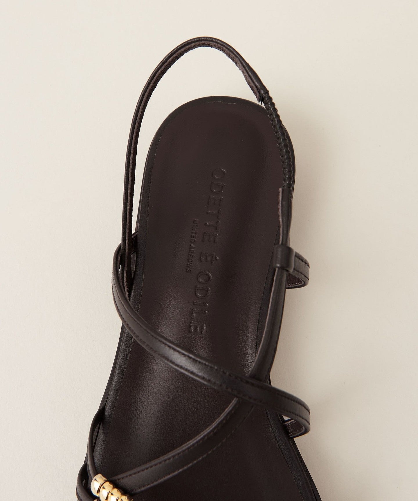 These sandals feature a thin leather cord adorned with small, rounded metal beads, adding a subtle, elegant sheen.