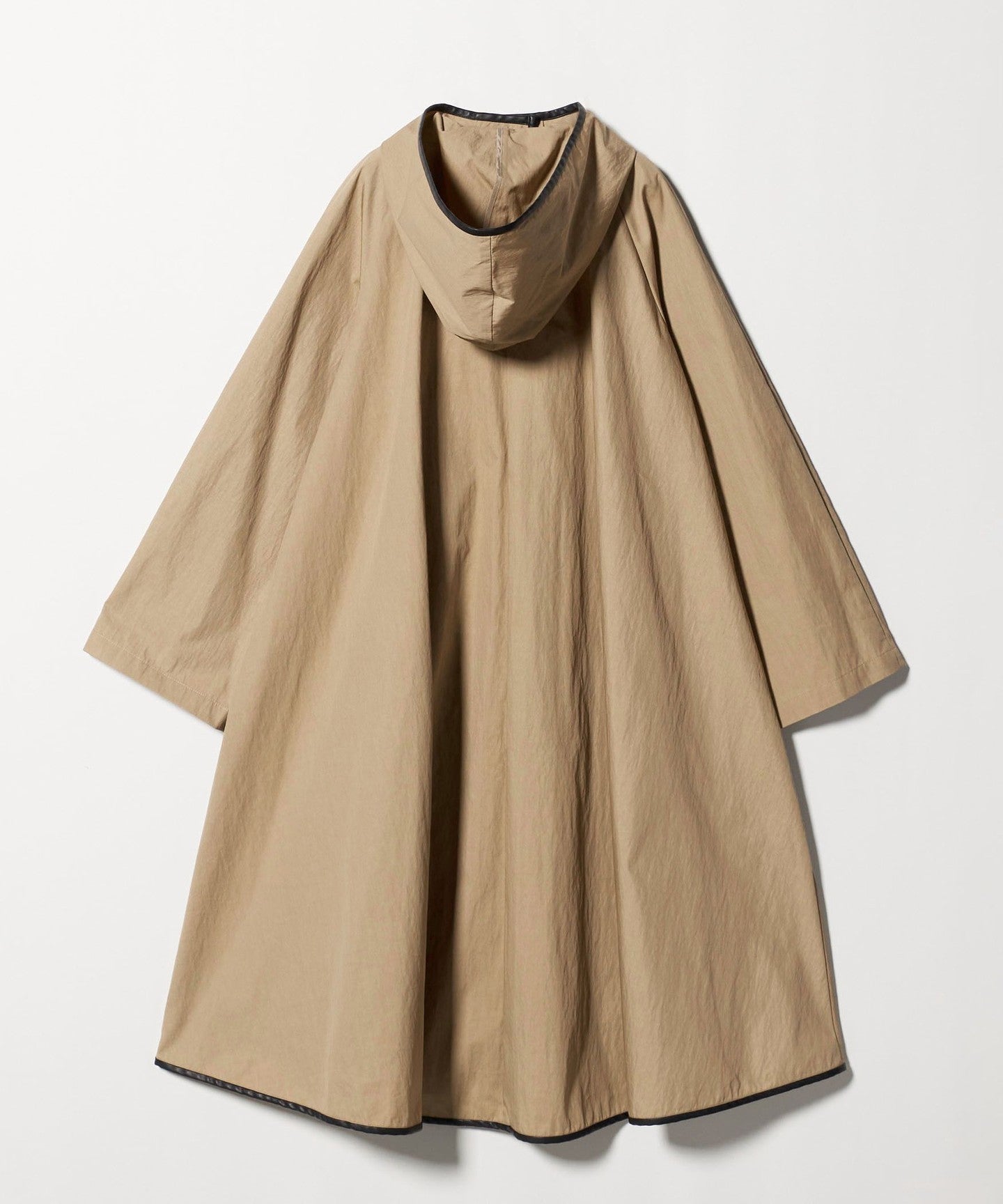 A hooded coat with a poncho-like silhouette, with roomy sleeves and body.