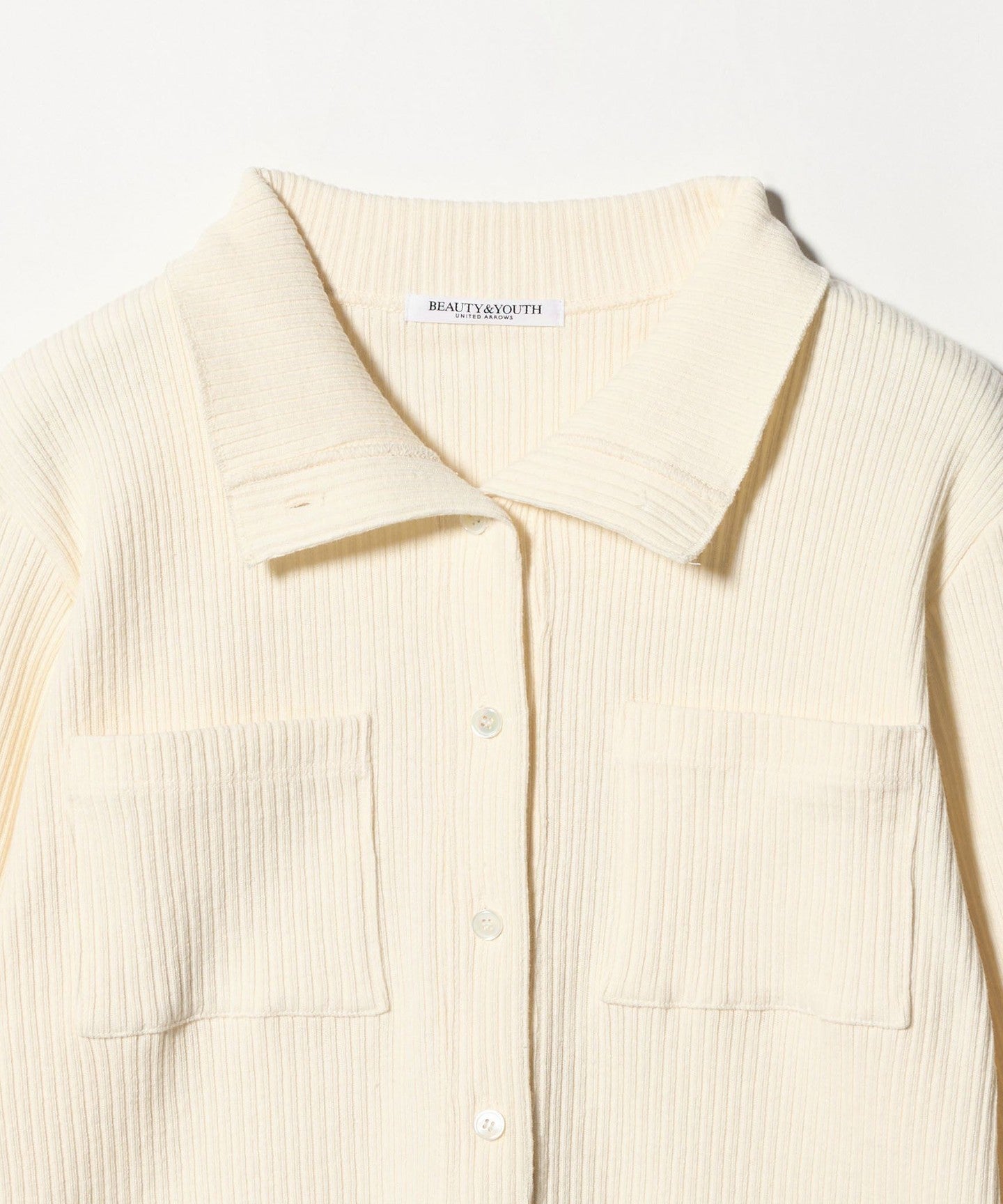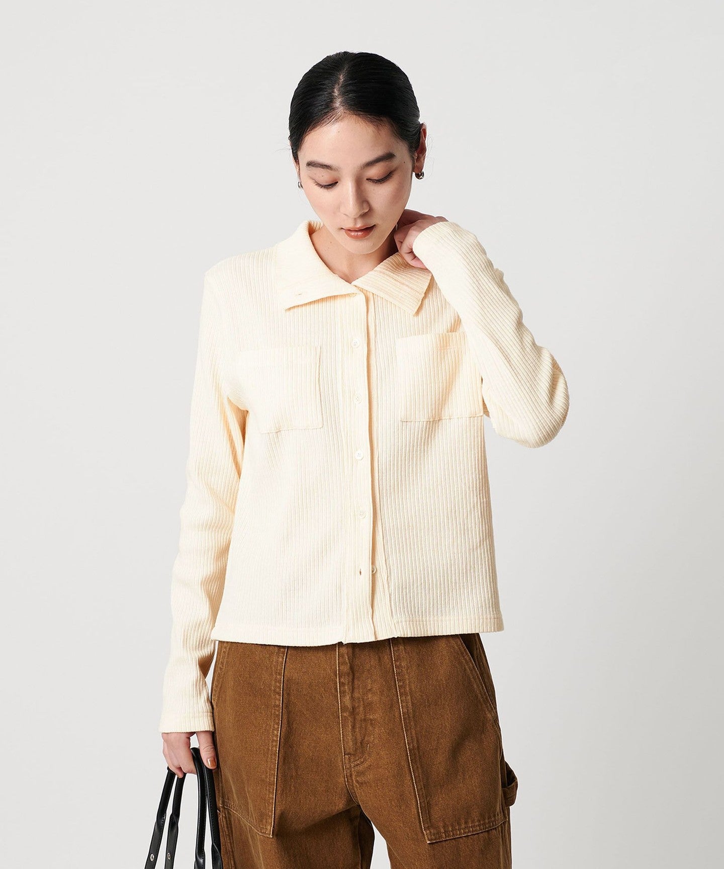 We have created a shirt-style cardigan using cotton rib fabric, with pockets on both sides as the highlight.