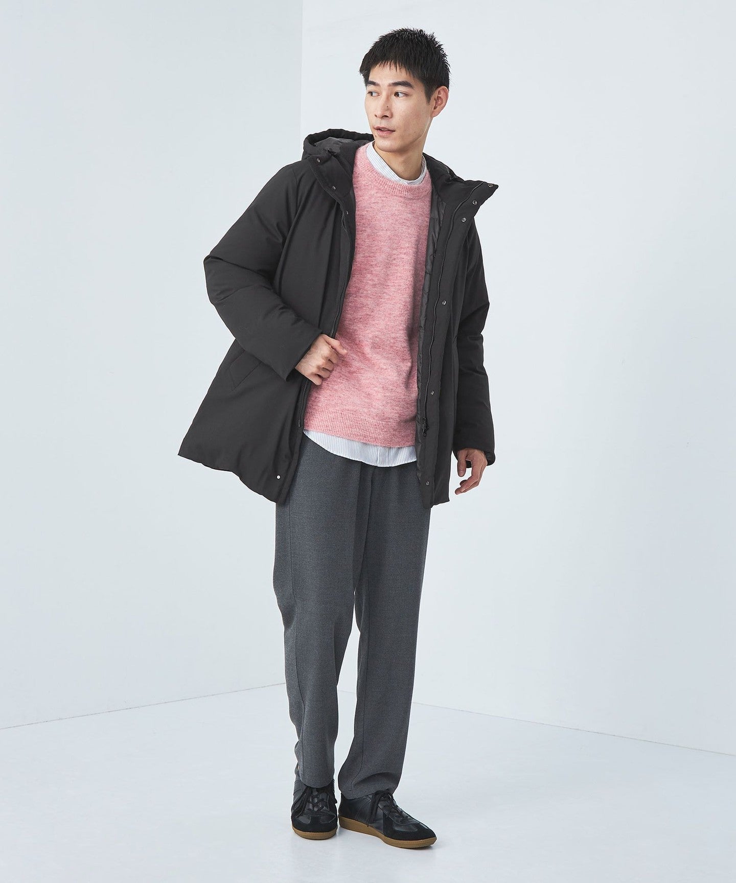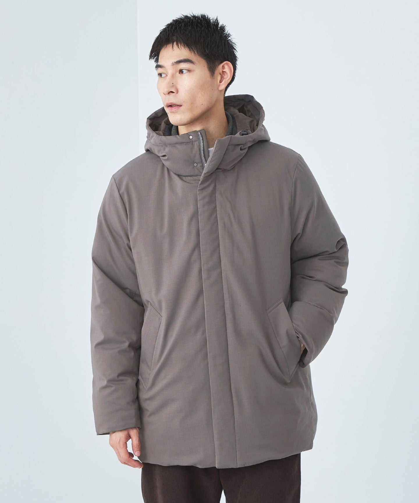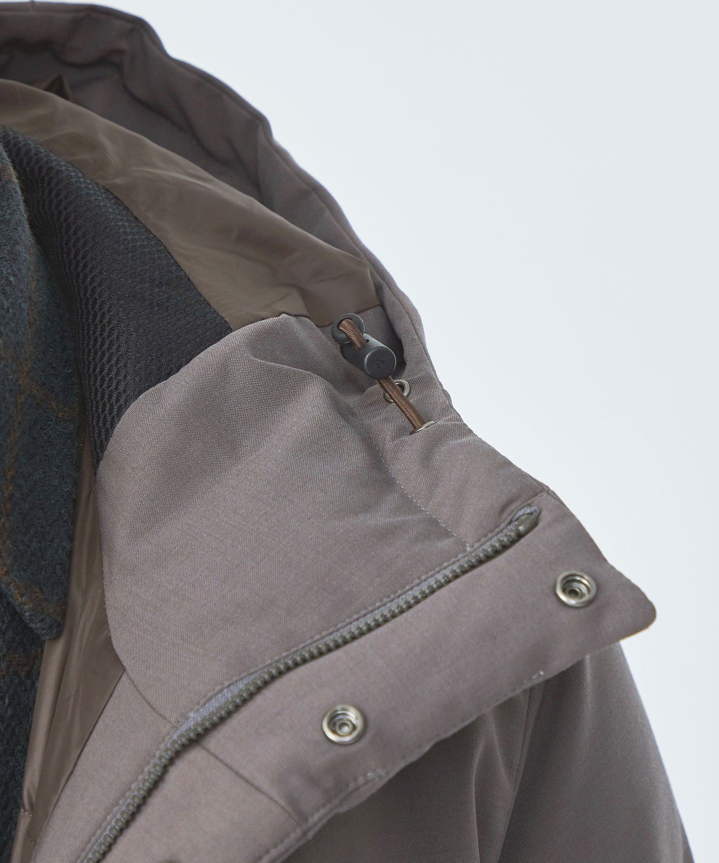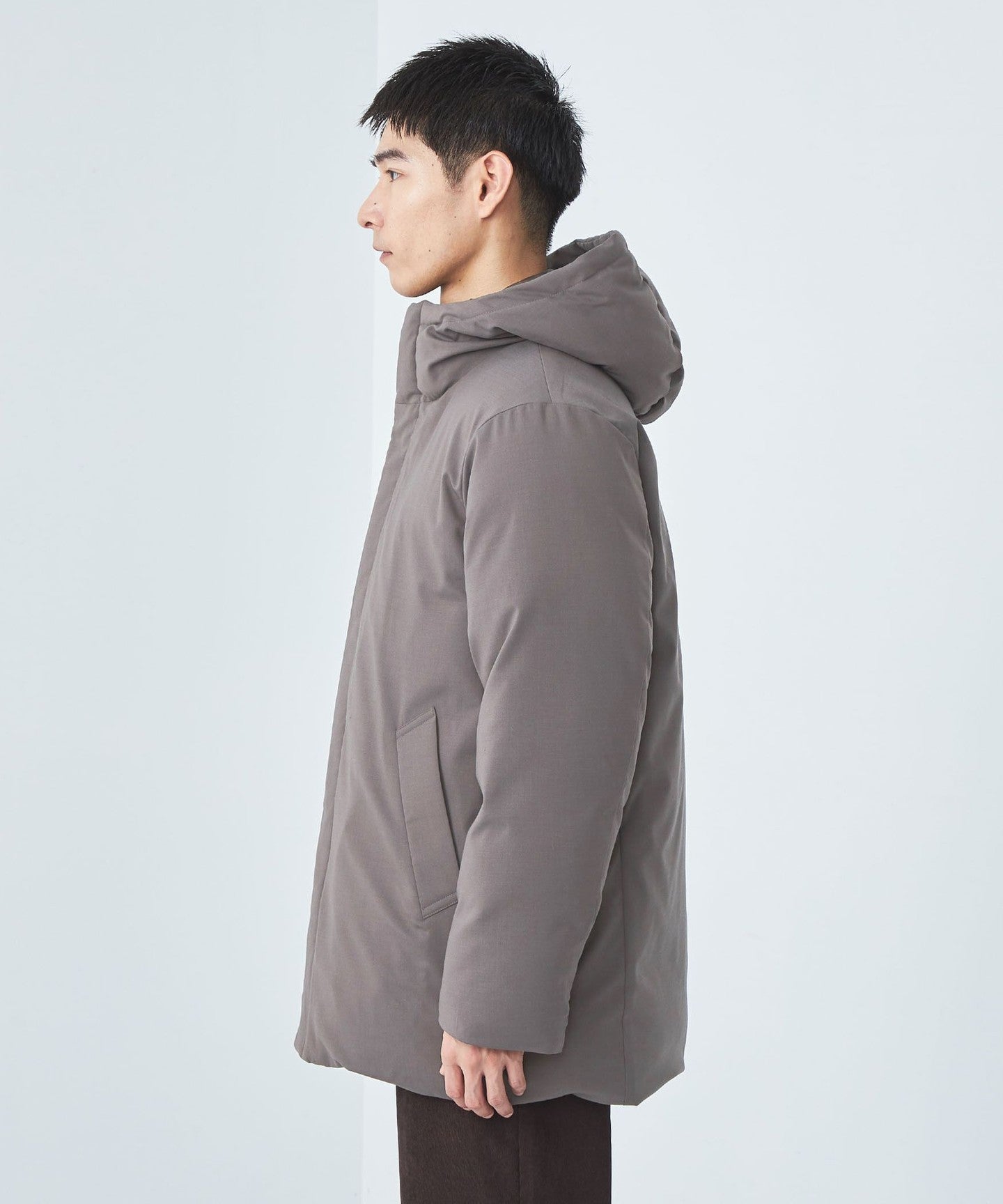 Although it is a hooded coat, the clean surface made from a blend of fur creates a relaxed, sophisticated style.