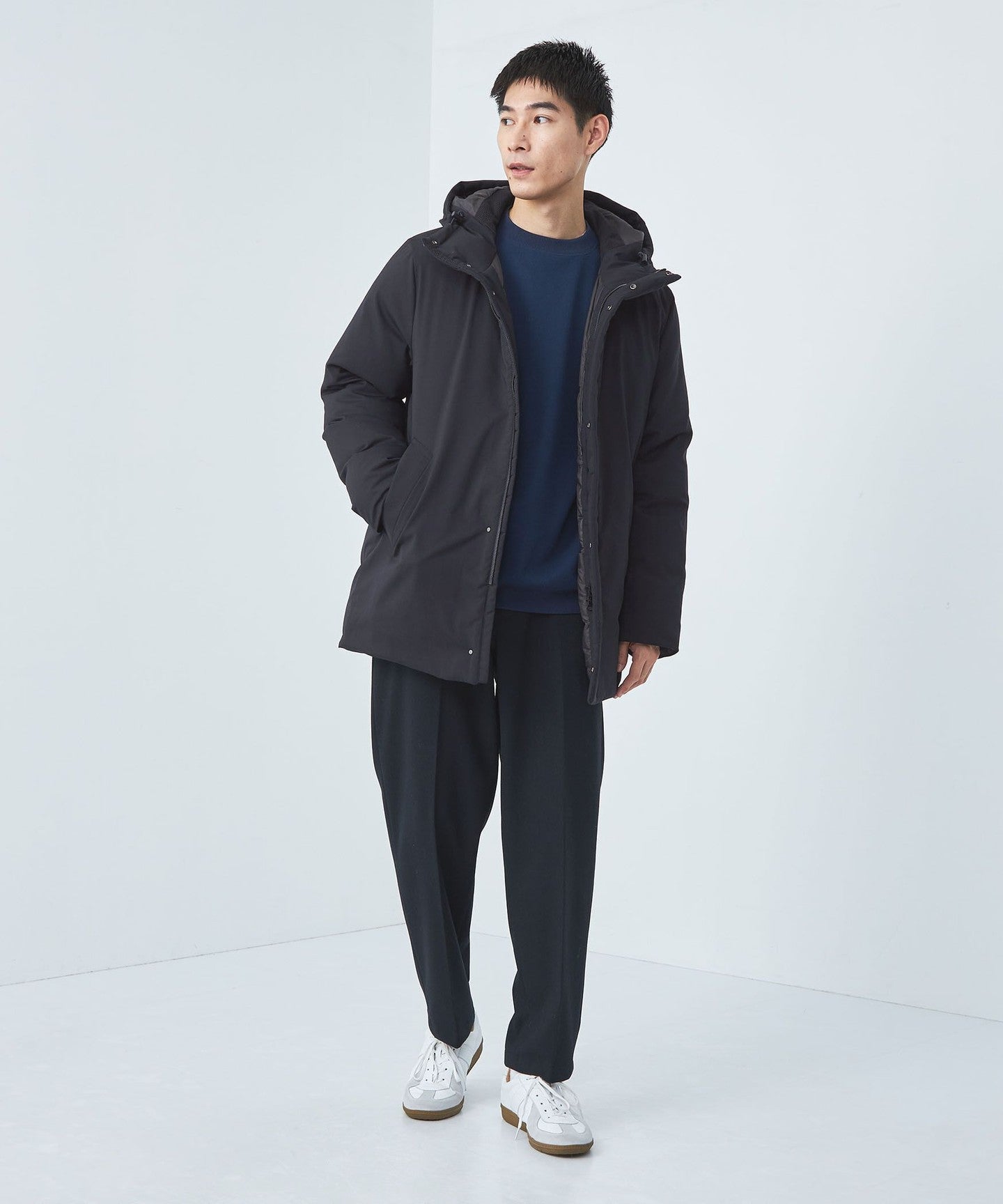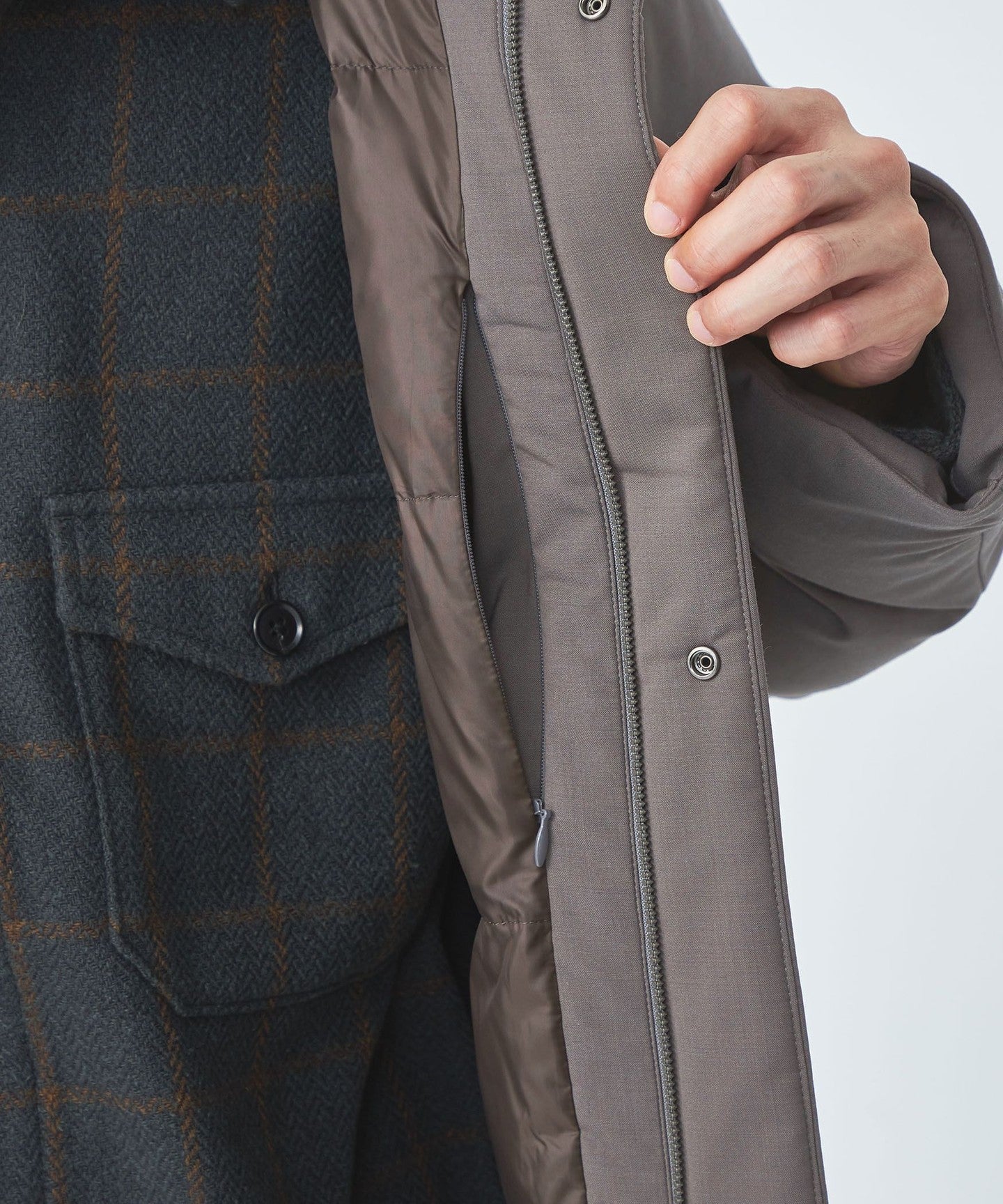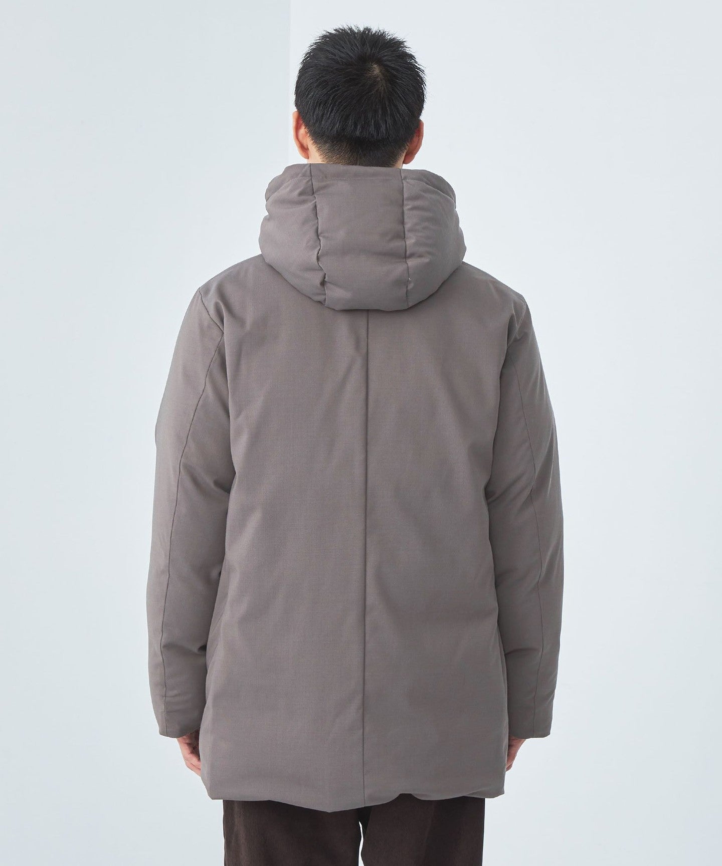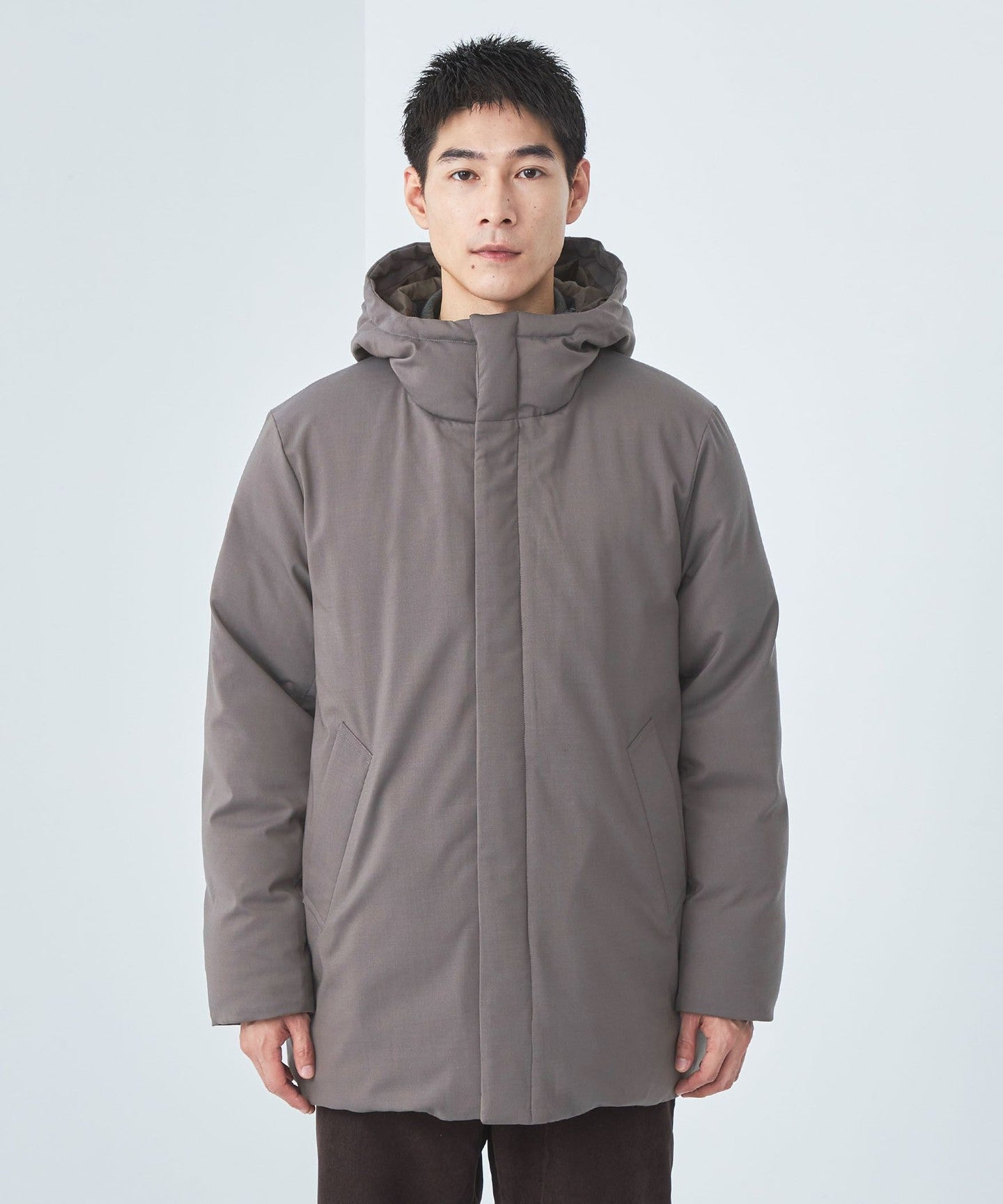 Although it is a hooded coat, the clean surface made from a blend of fur creates a relaxed, sophisticated style.