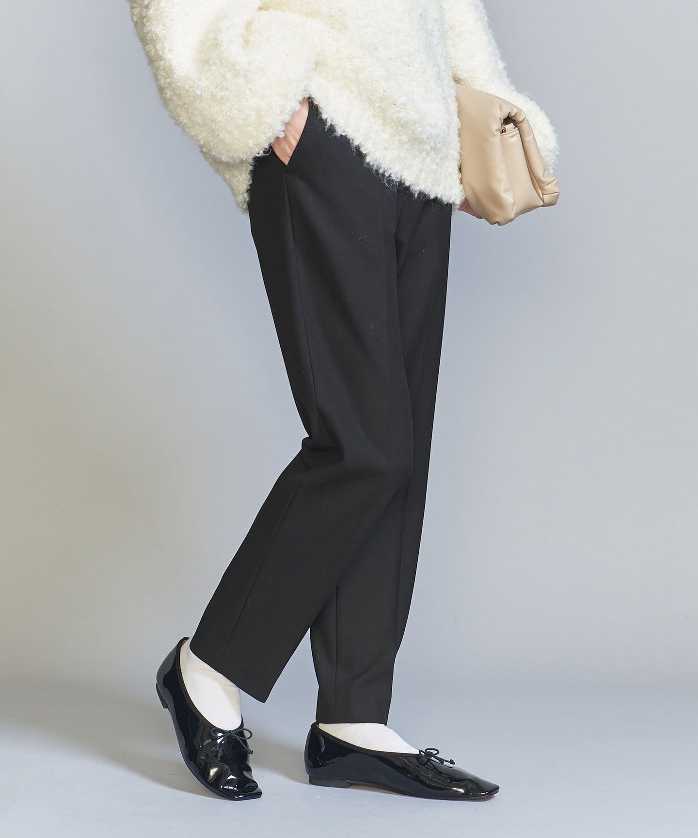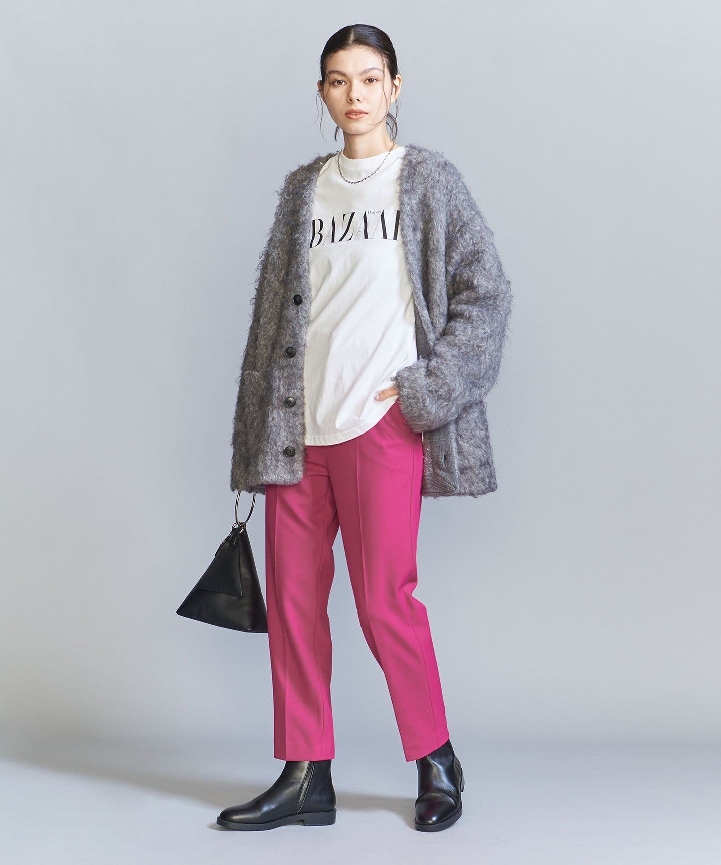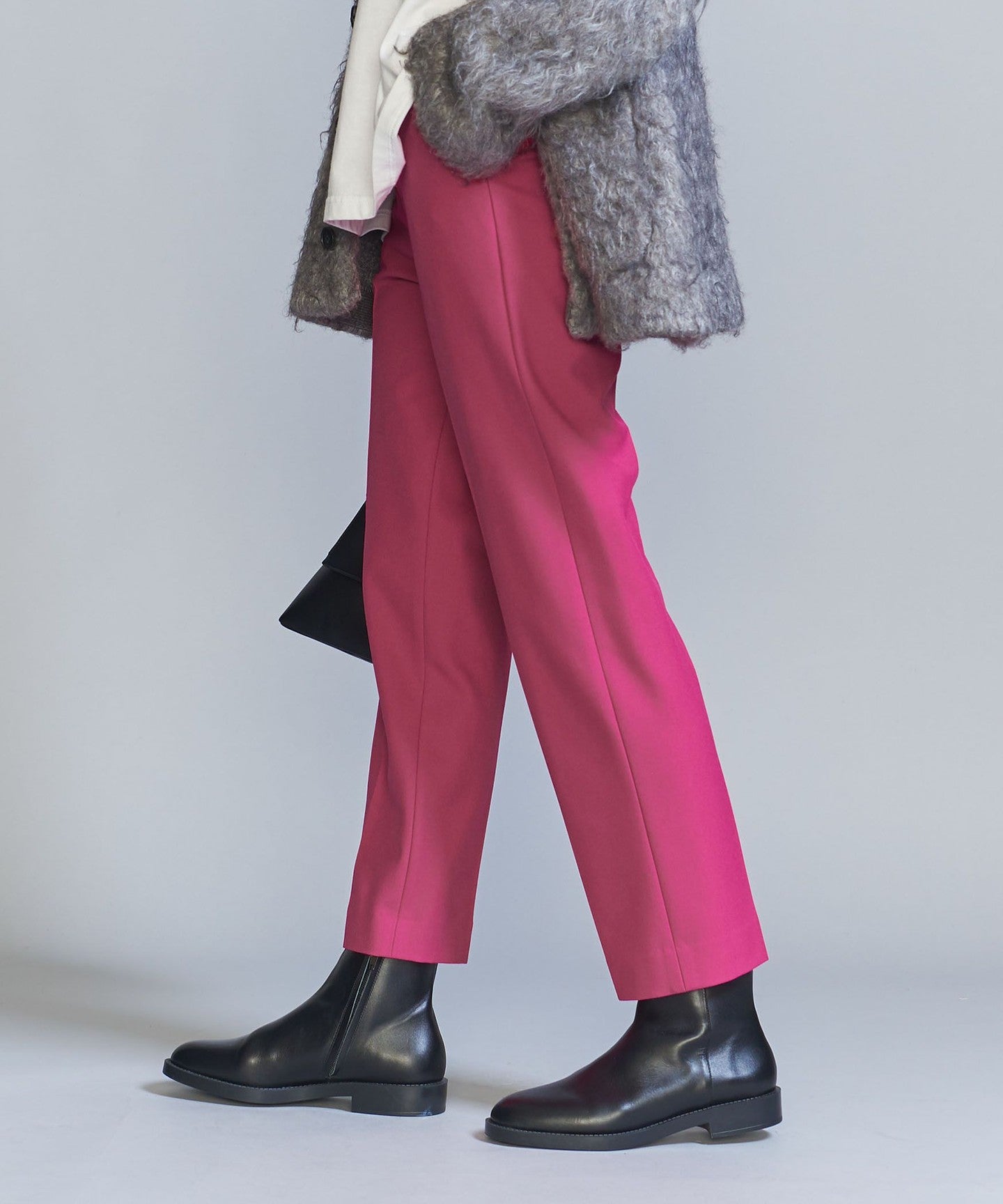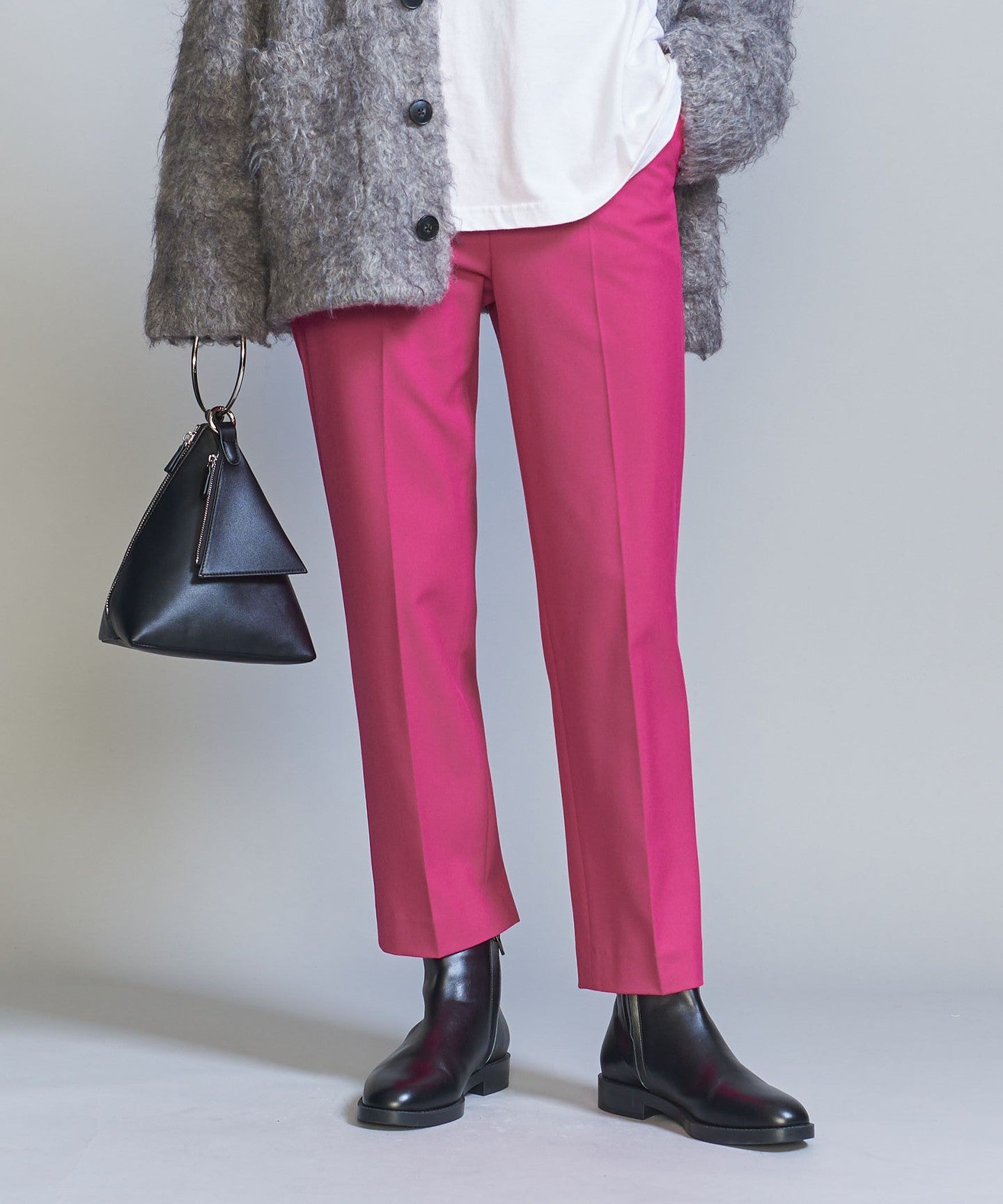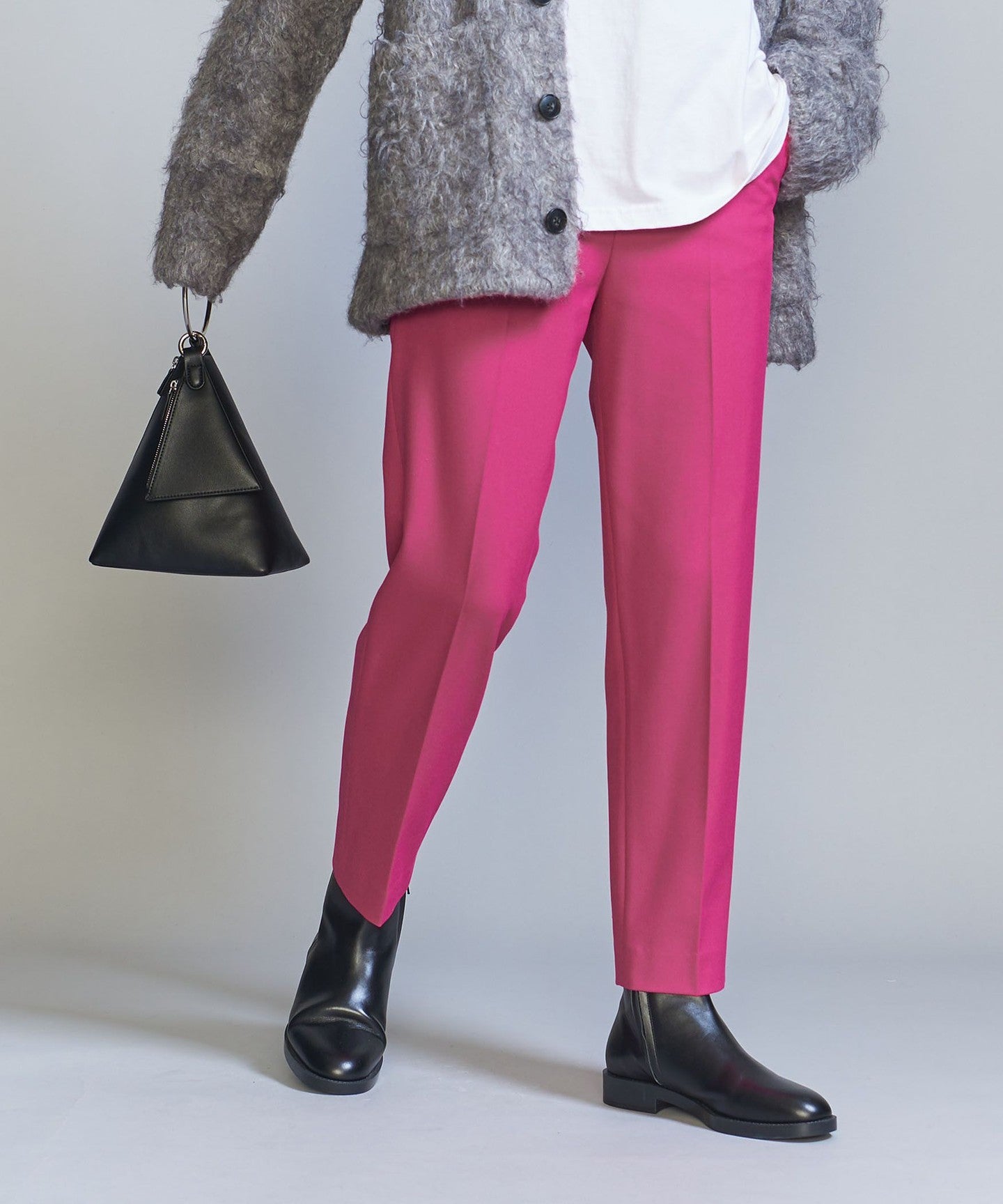 In addition to the versatile black that is perfect for daily use, there is also a dark gray with a subtle houndstooth pattern, and a vivid white that stands out in winter outfits that tend to be dark. PIN Available in three colors: black, red, and black.