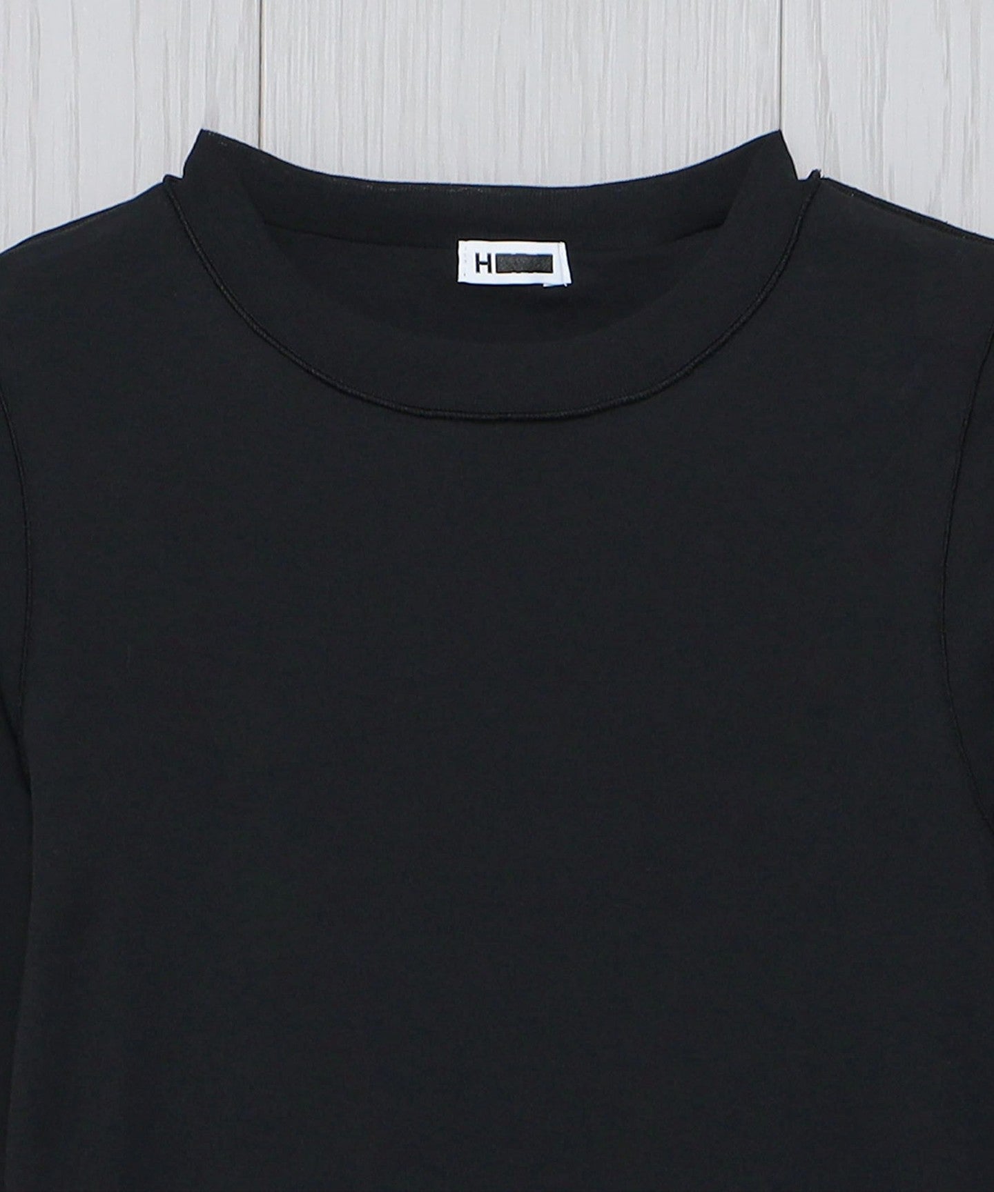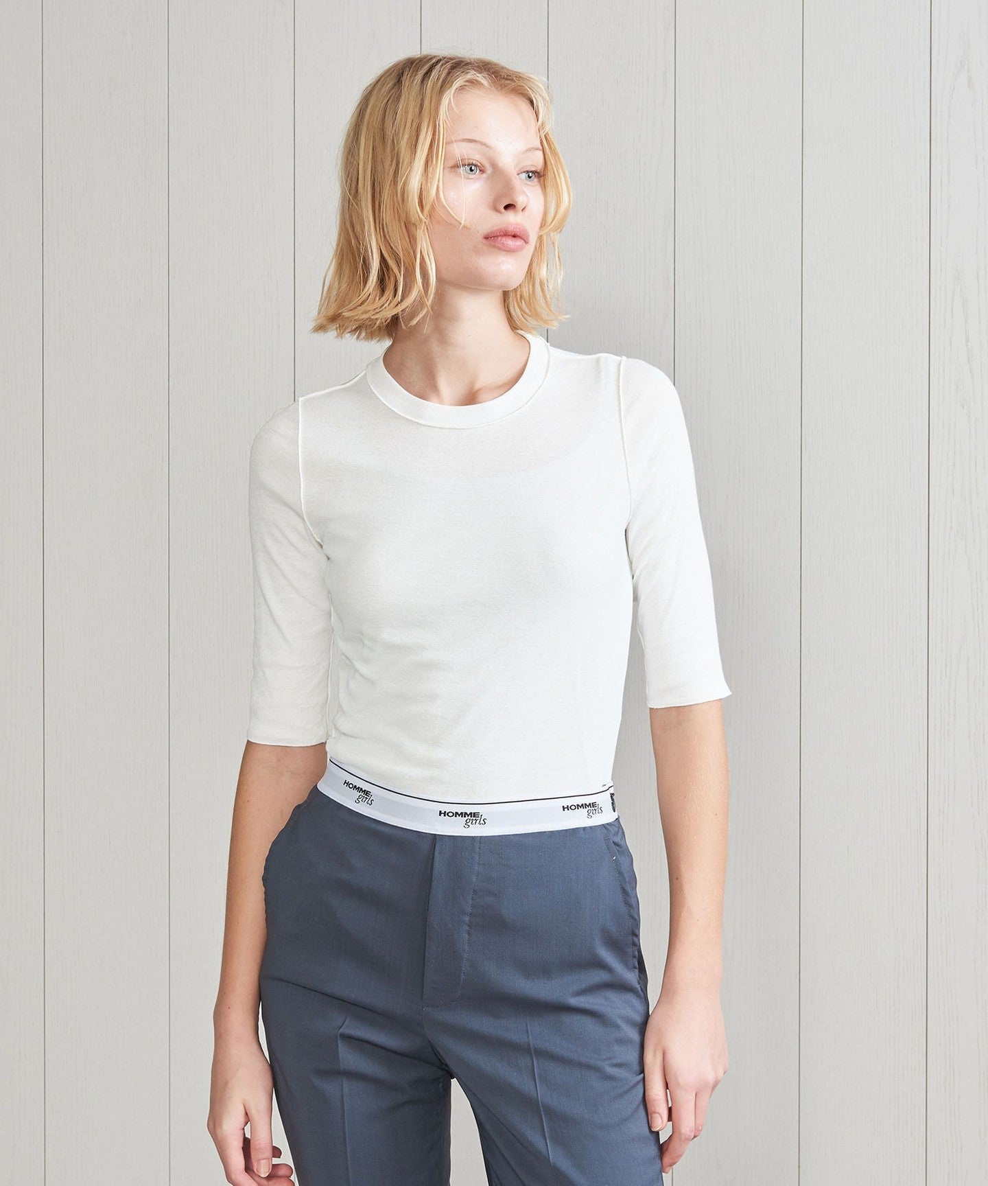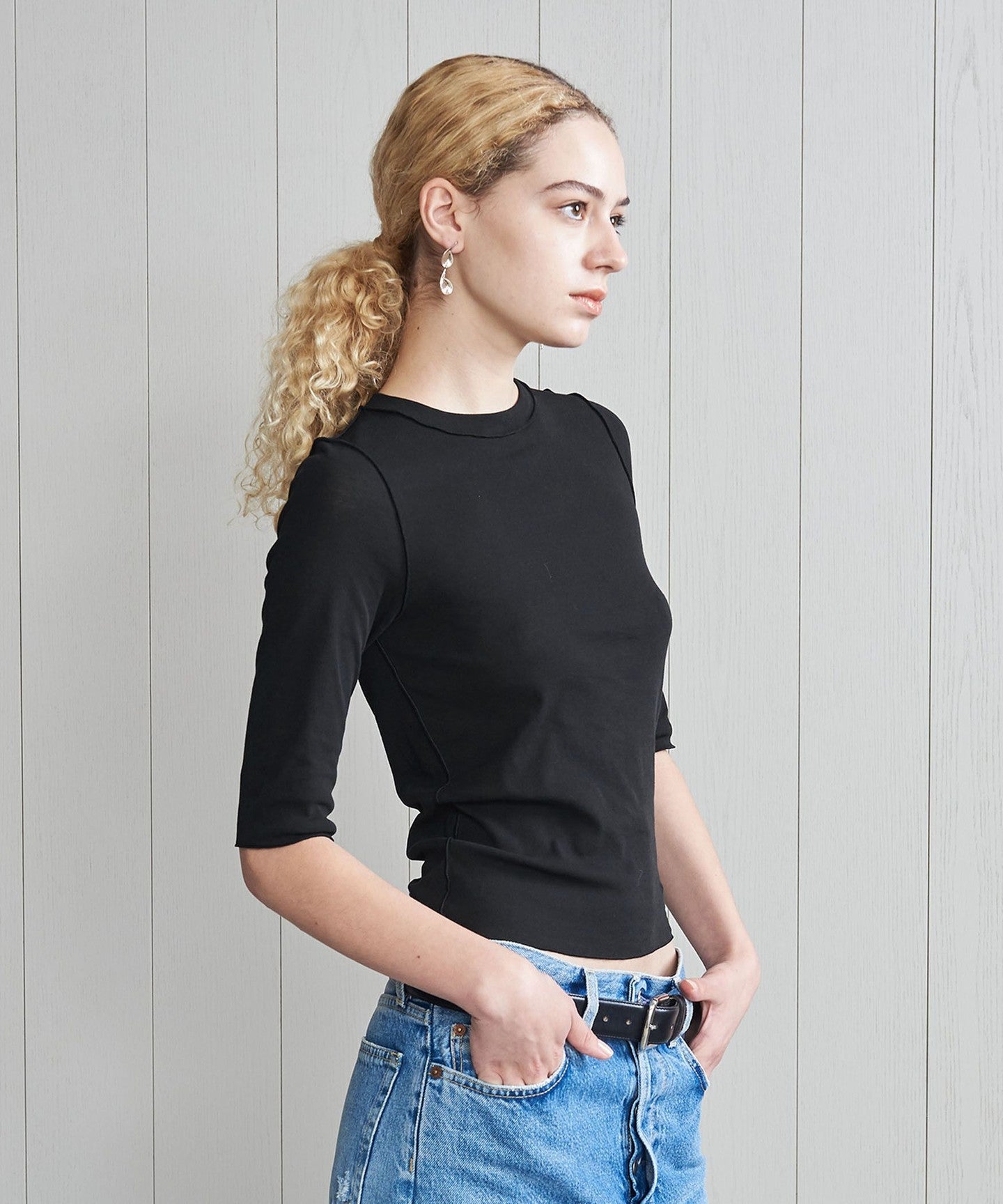 High gauge with a smooth touch Cotton This is a cut-and-sewn piece made of rib knit. The slightly sheer texture, the size balance that creates a comfortable fit, and the half sleeves that give off a conservative vibe make this a fresh piece. The delicate mellow lock finish that is exposed on the outside EXTERIOR The emotion creates a comfortable and nuanced impression. TIE This versatile item can be worn on its own or layered, making it a must-have in different colors.