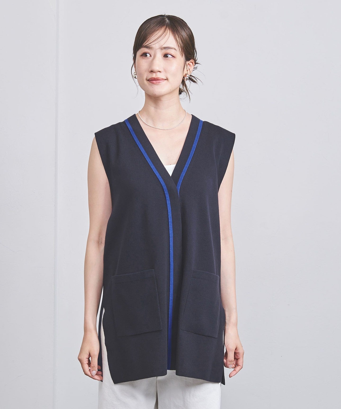 A long knit vest with a moderately loose fit.