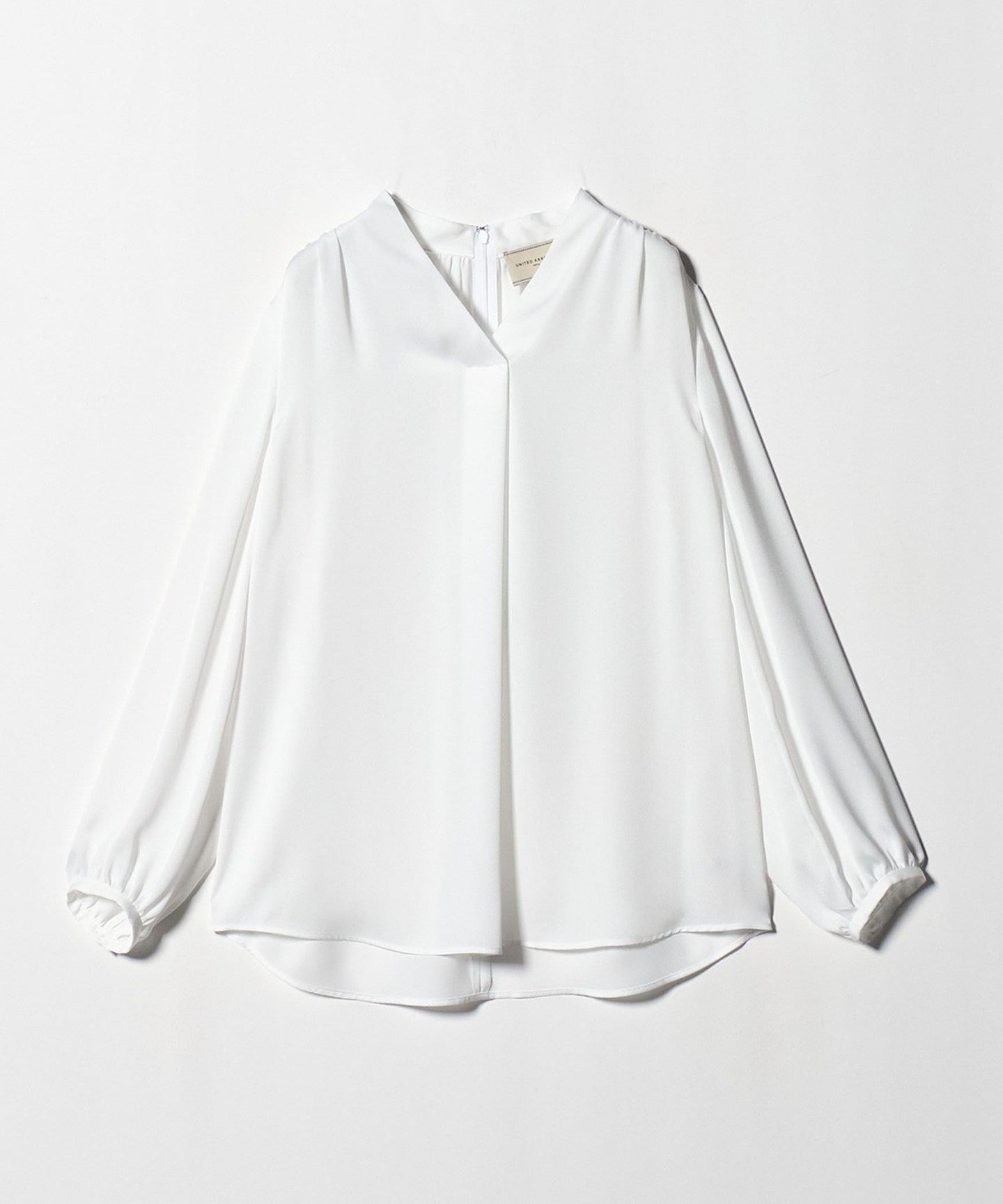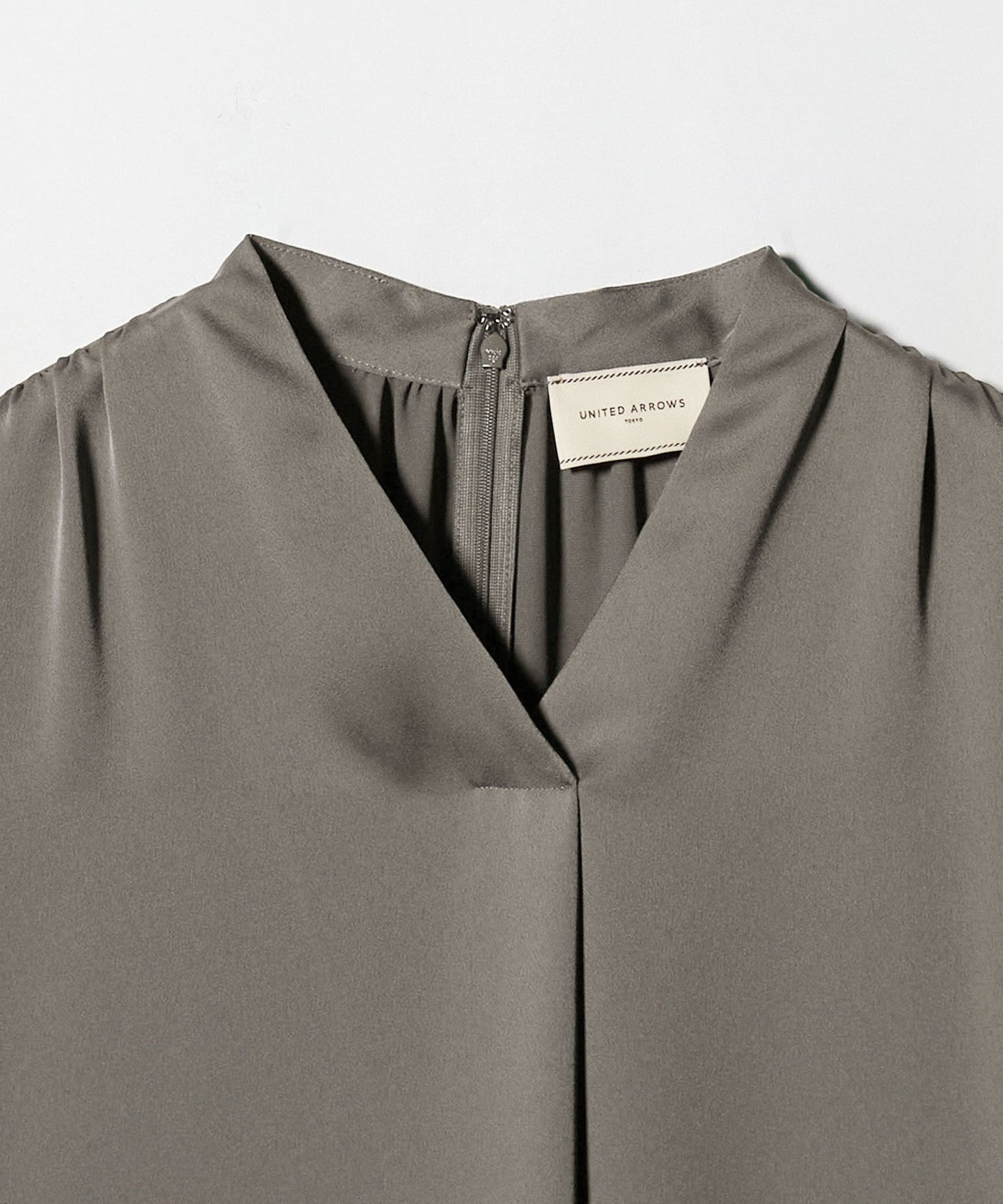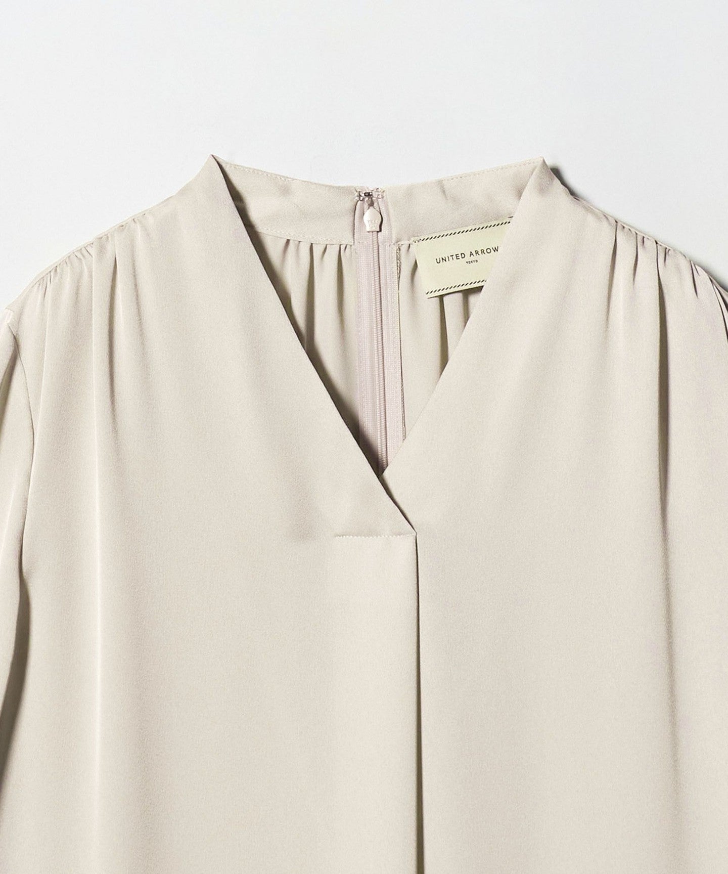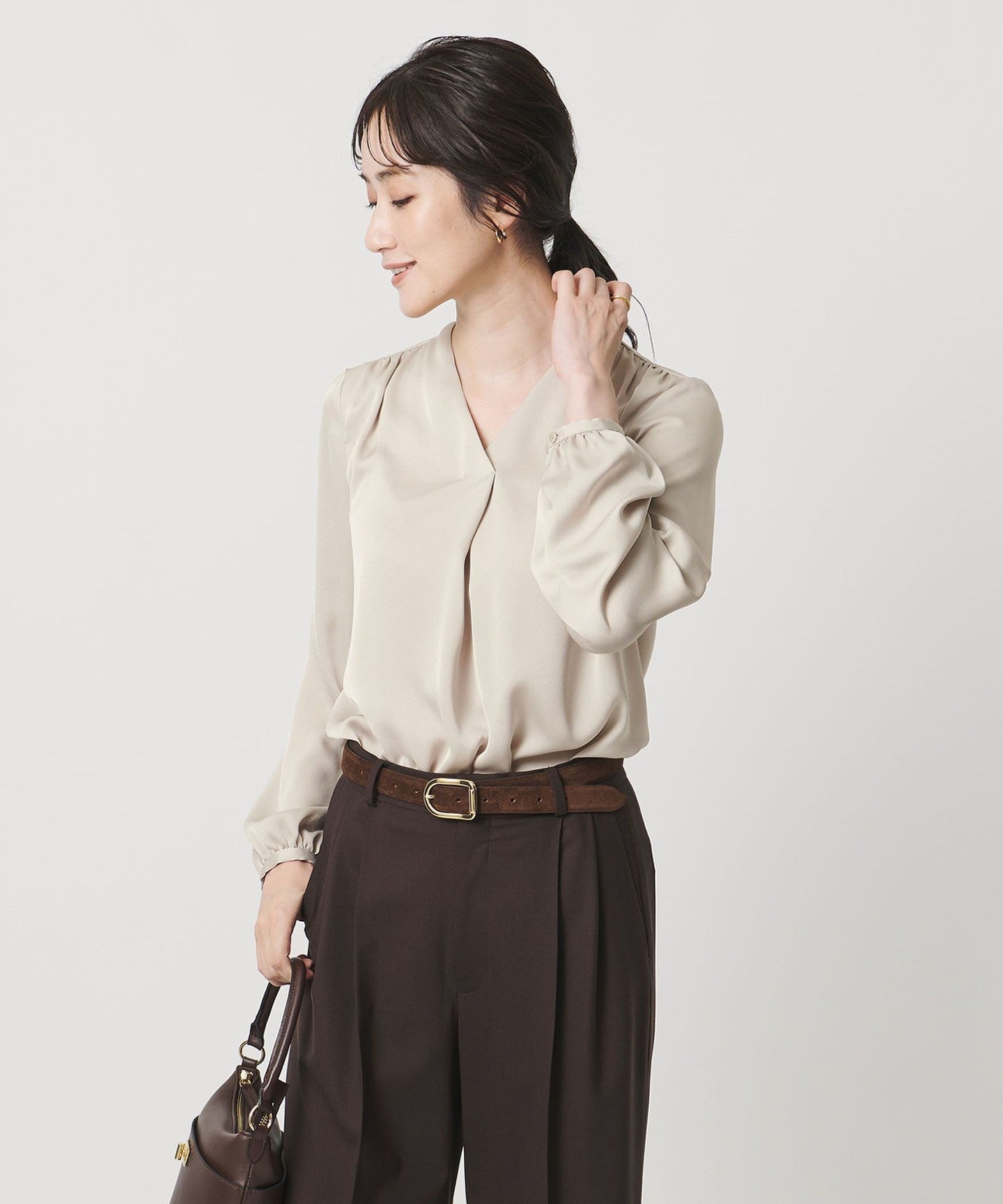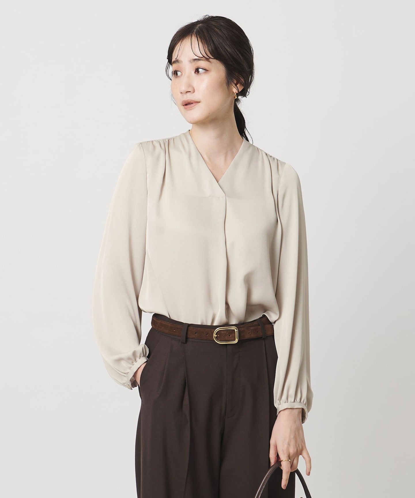 This blouse features a V-neck that beautifully accentuates the collarbone, creating a feminine impression.
