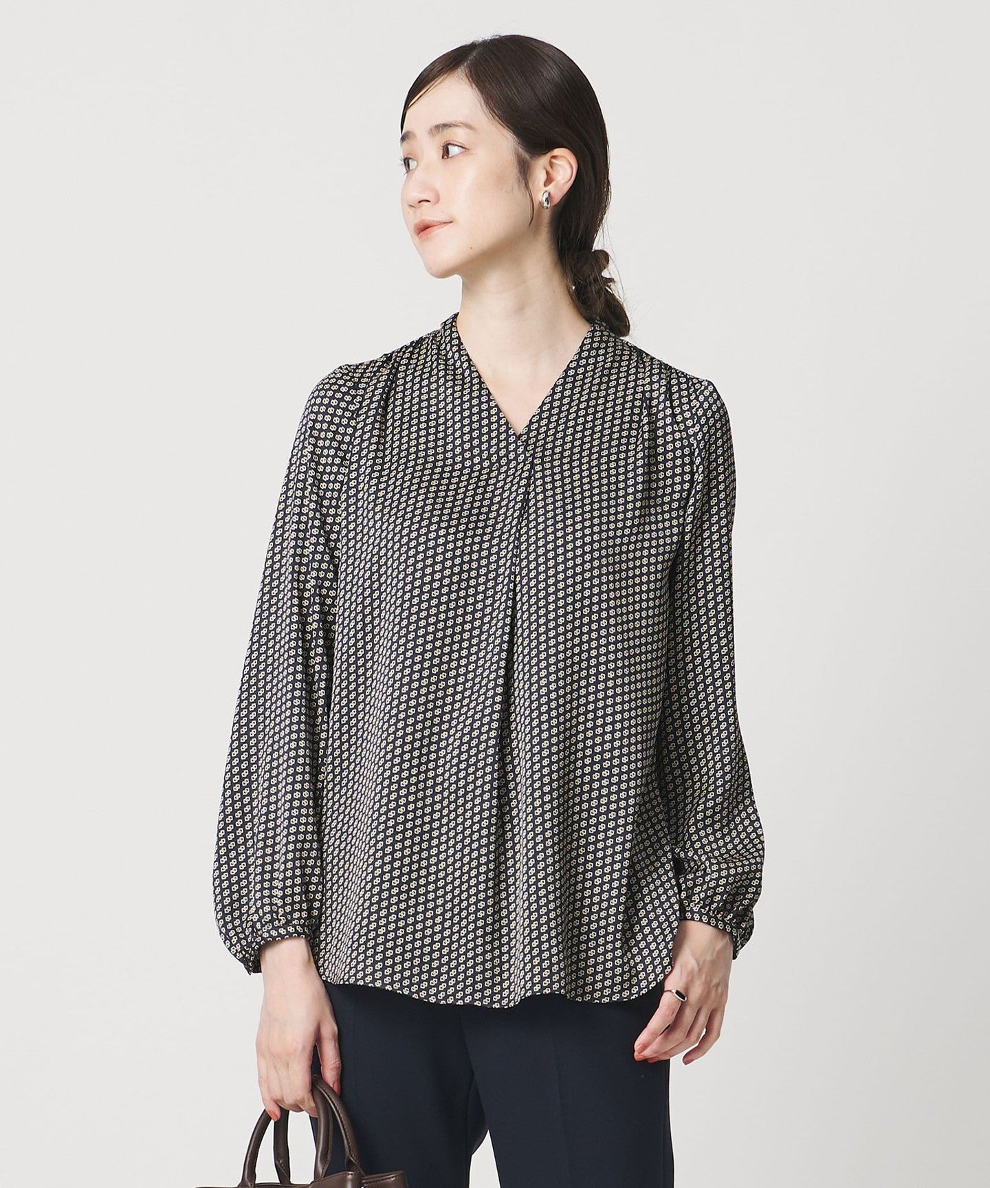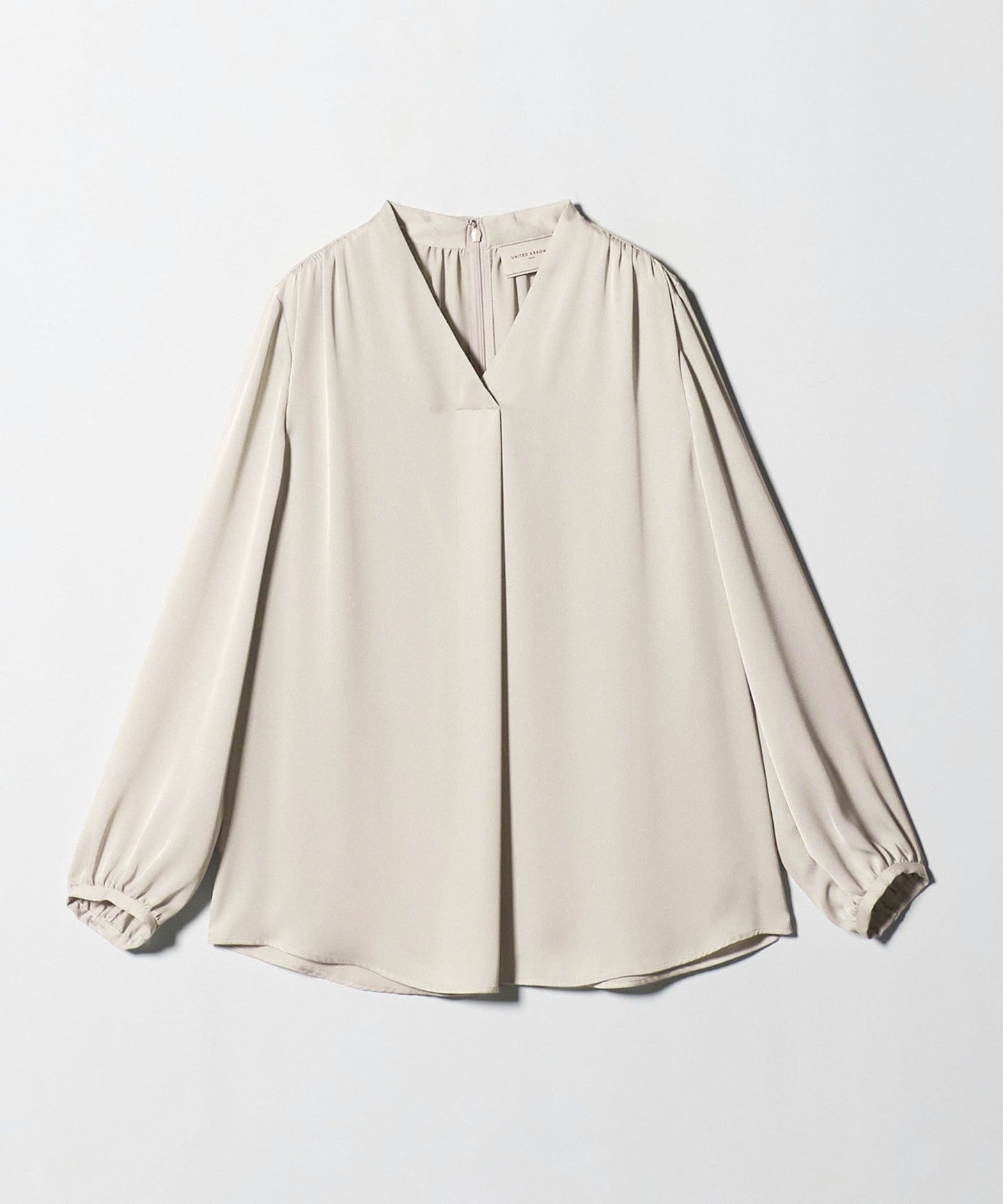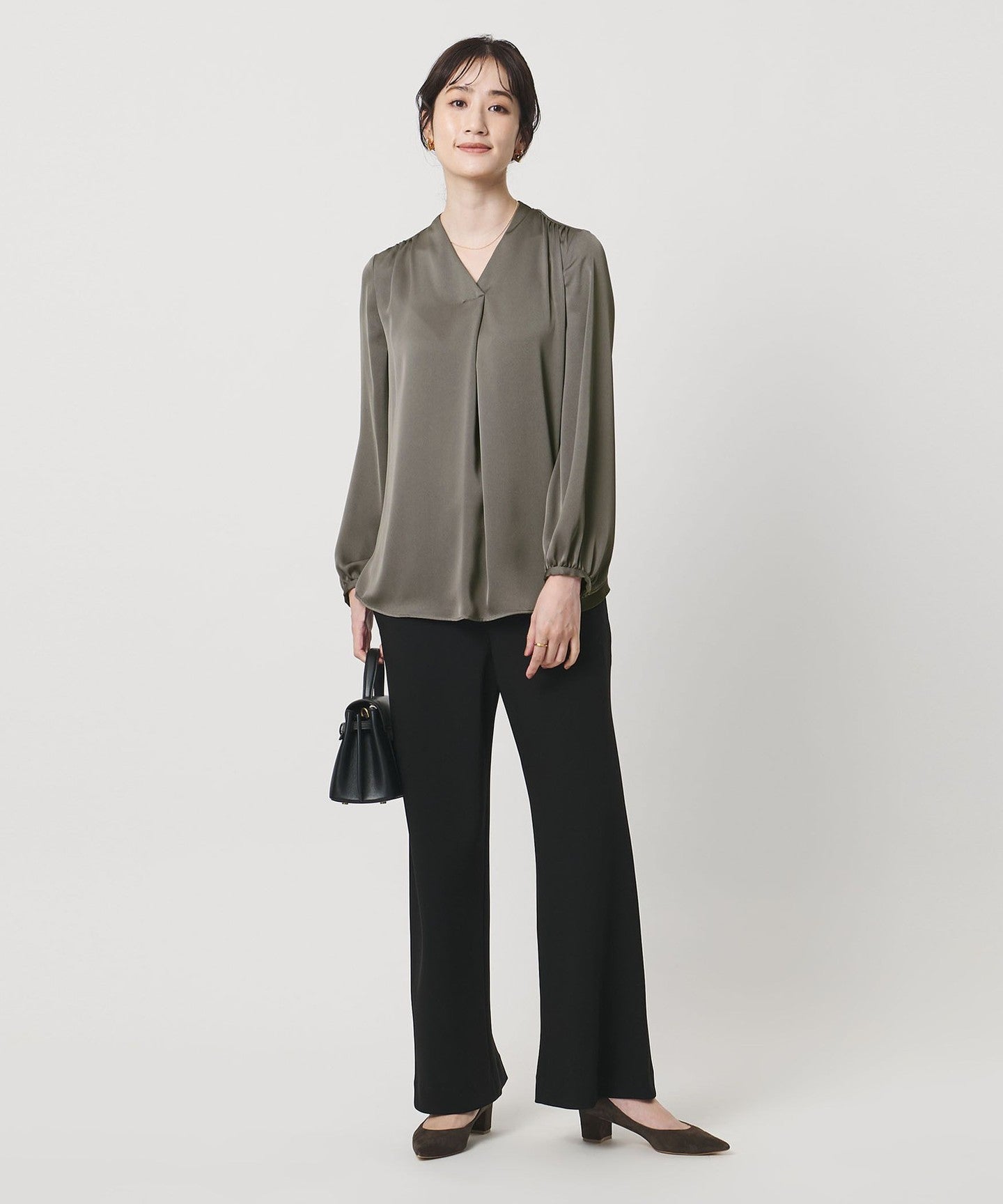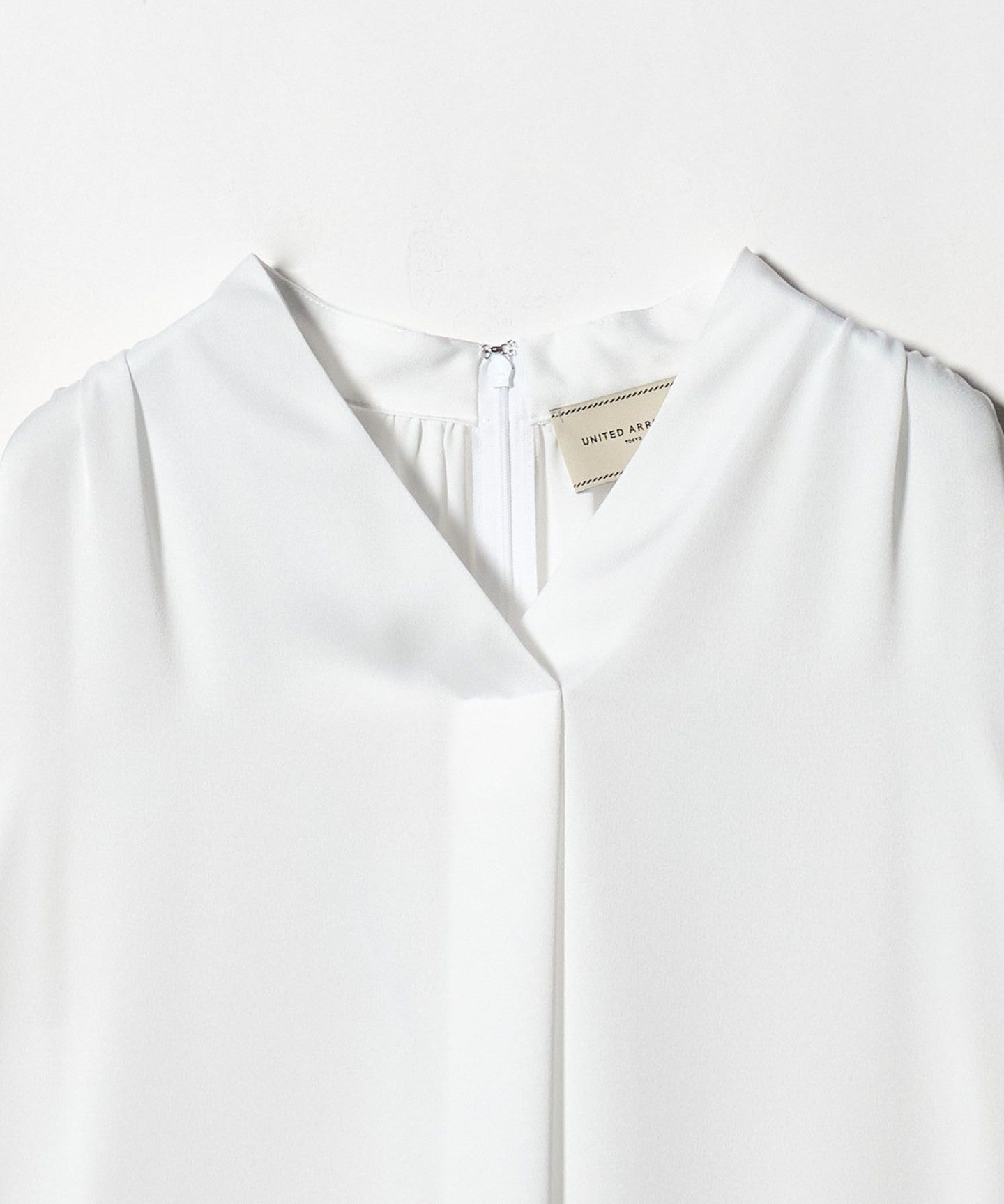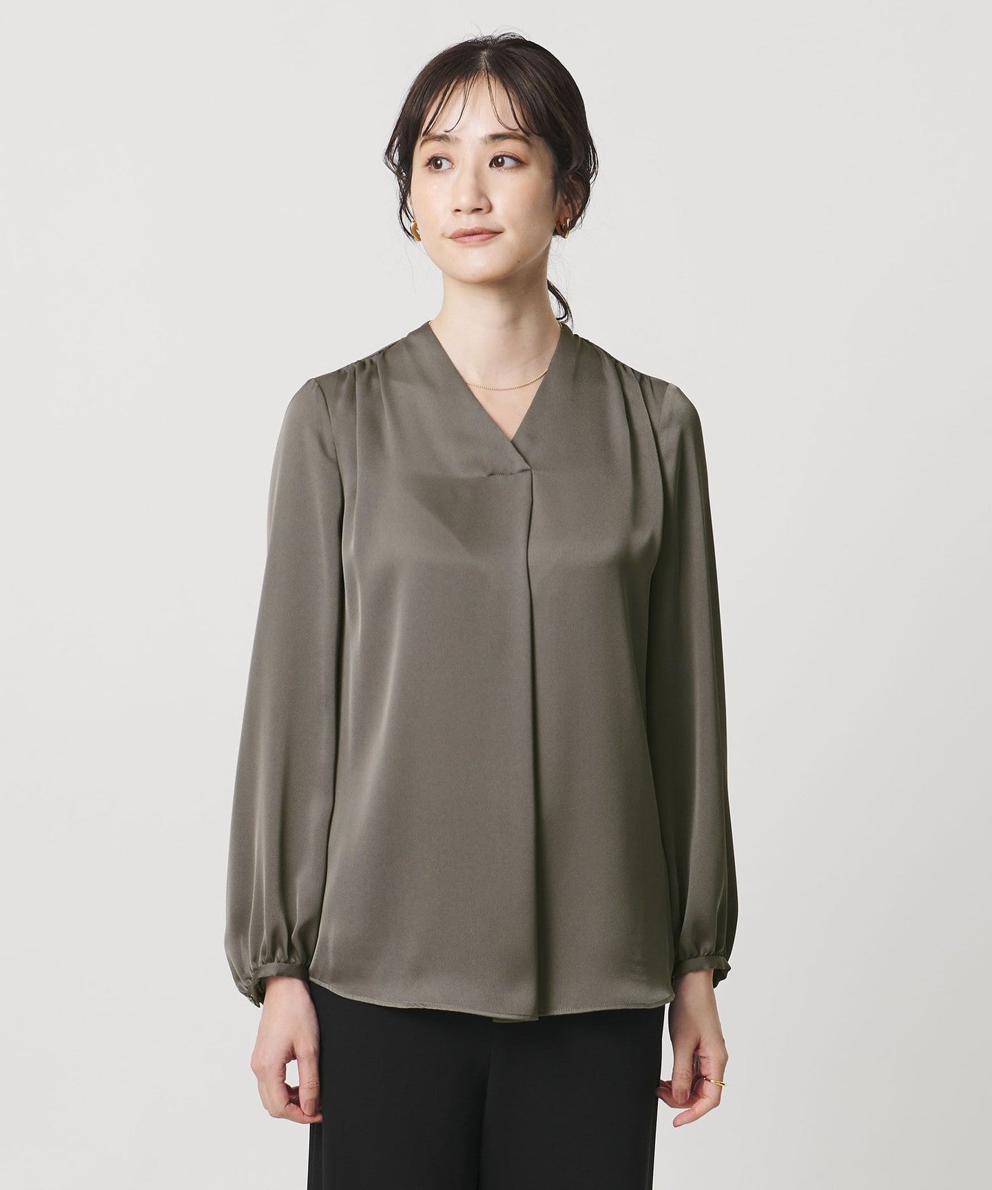 This blouse features a V-neck that beautifully accentuates the collarbone, creating a feminine impression.