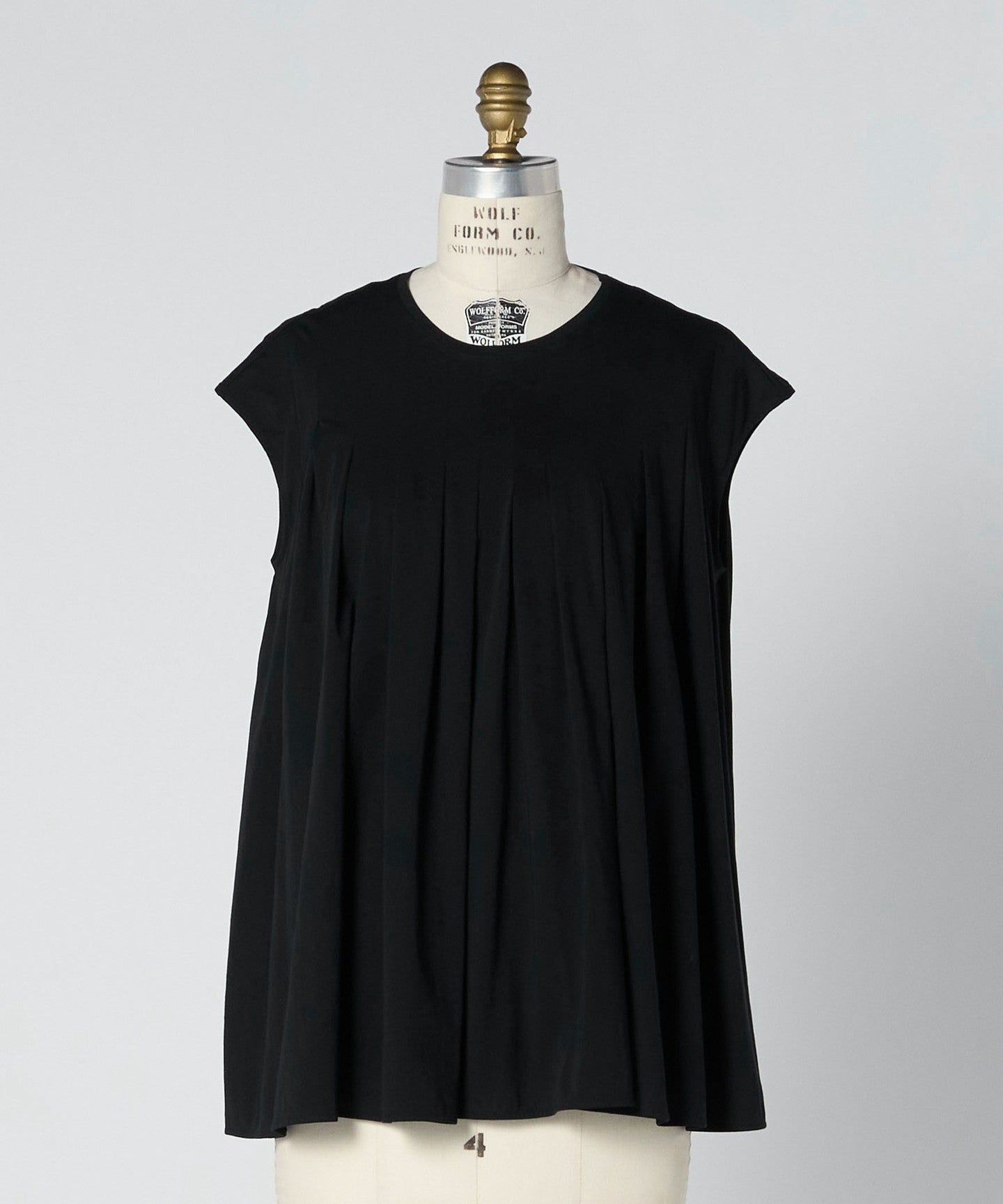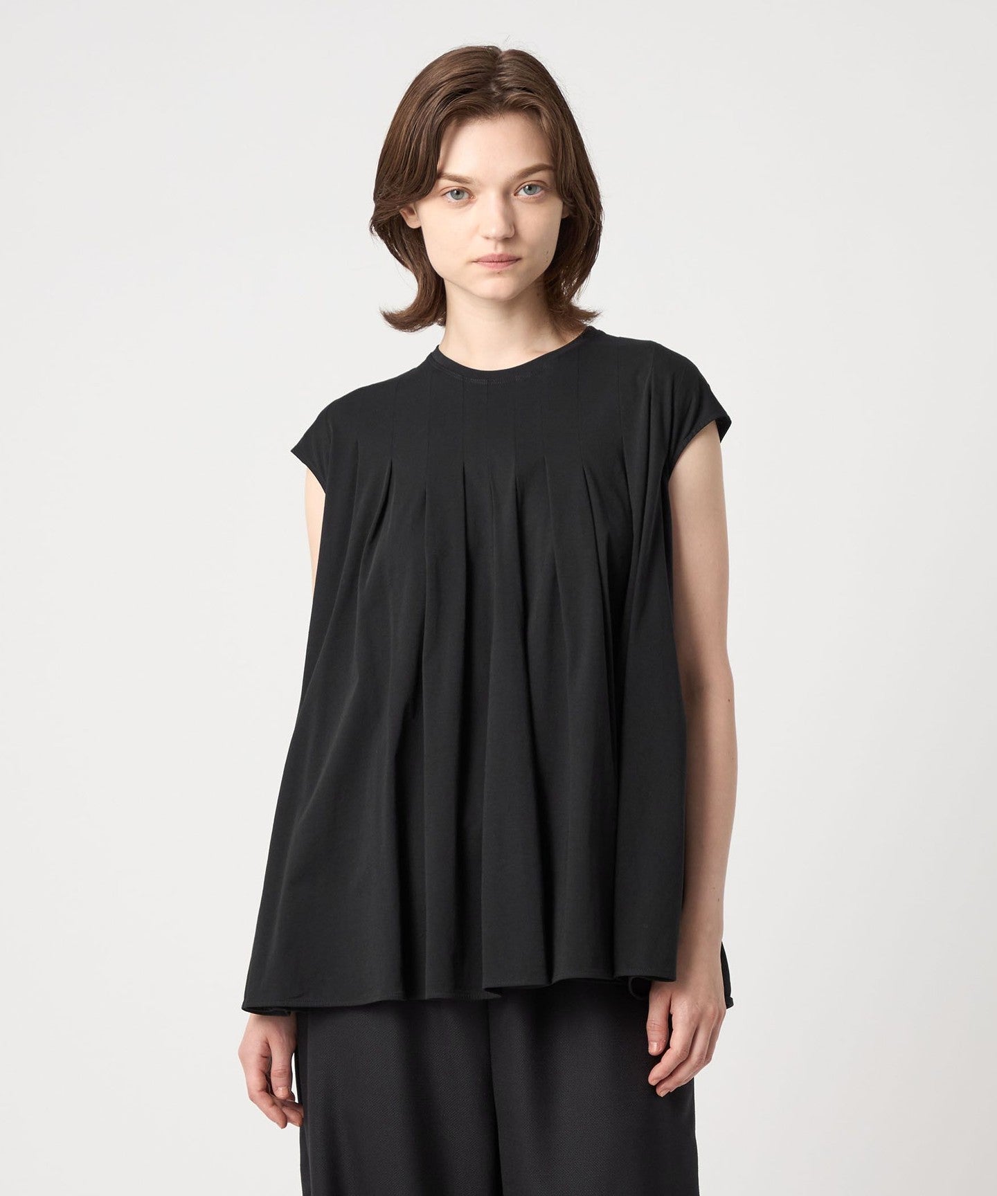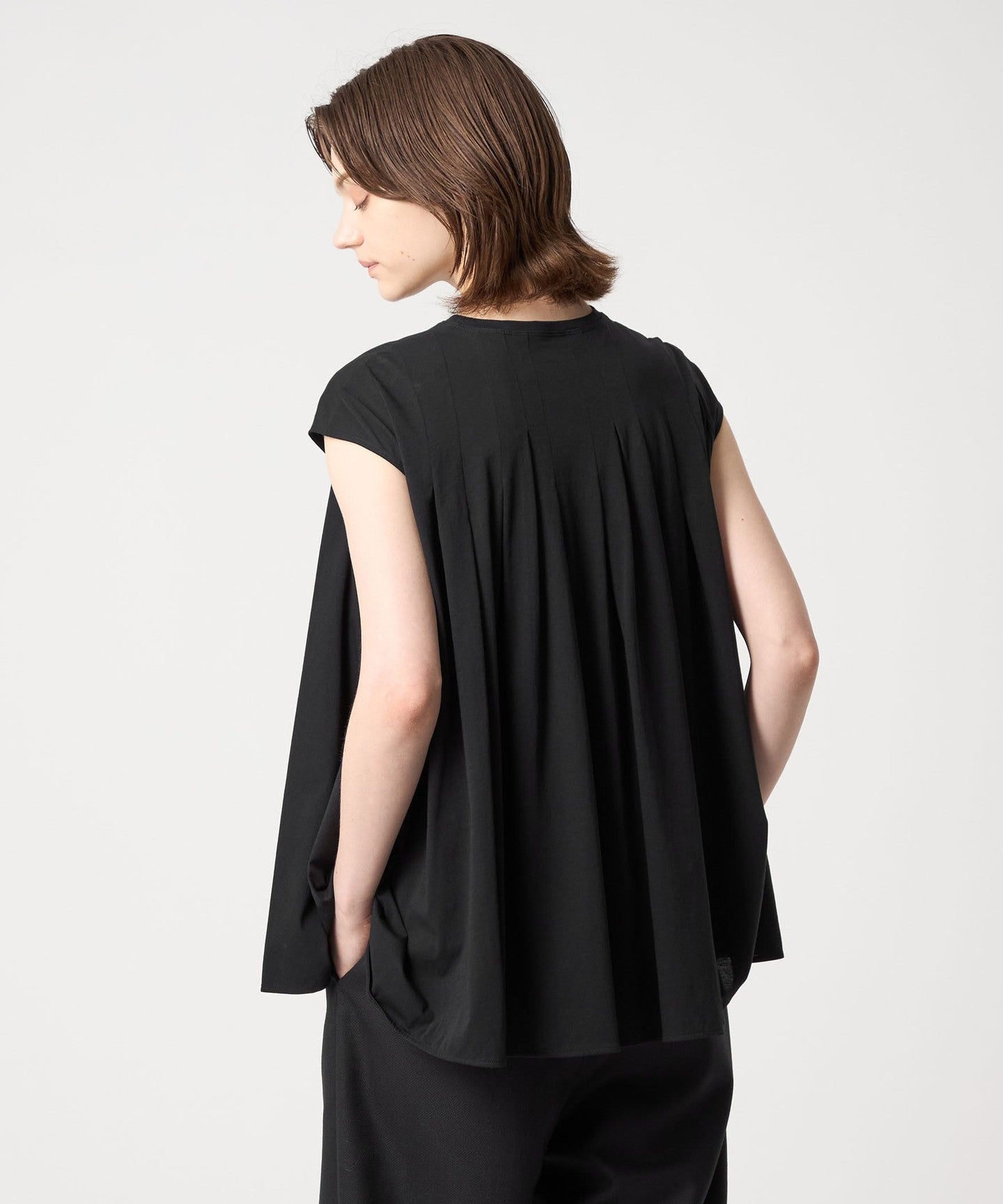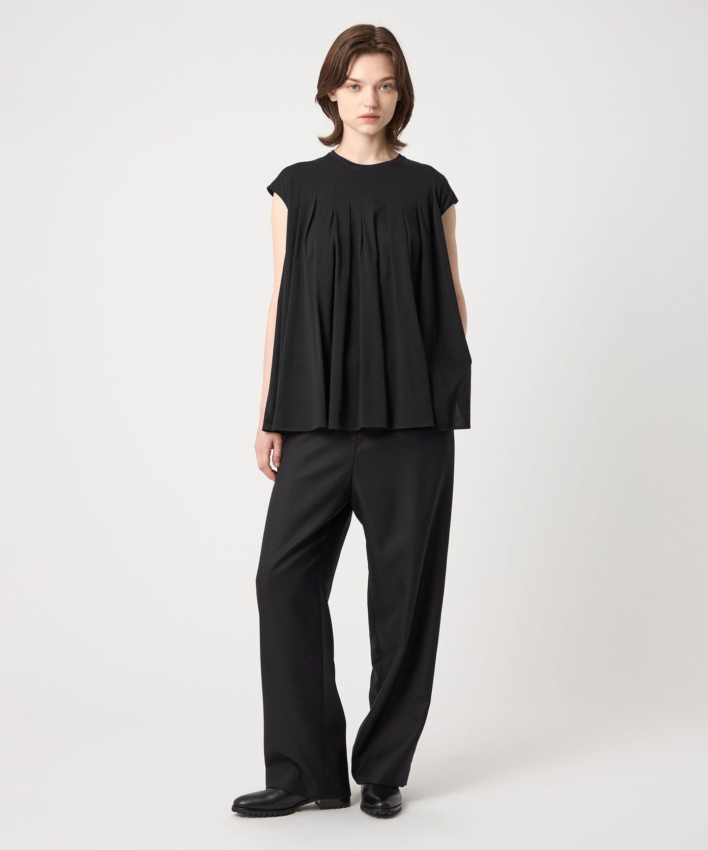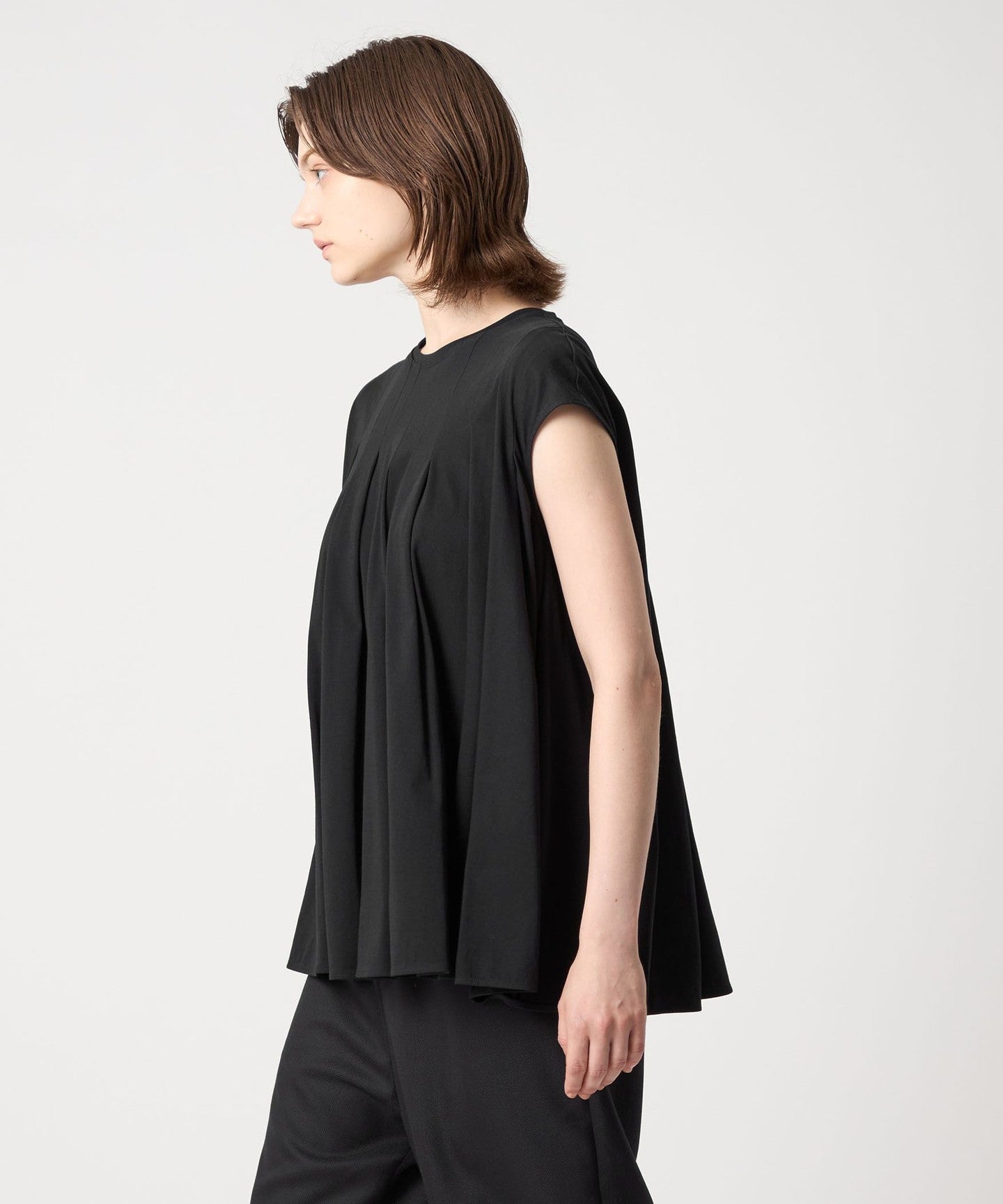 This blouse cut-and-sew has a clean décolleté line and a beautiful, voluminous flare that spreads out from the tucks.