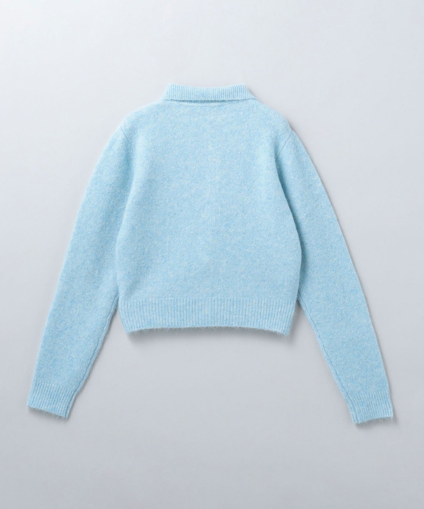 A knit cardigan with a collar and a short, compact silhouette made from a blend of alpaca, wool, nylon, and polyurethane.