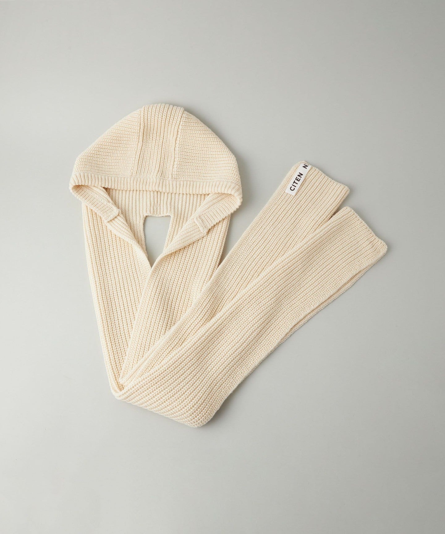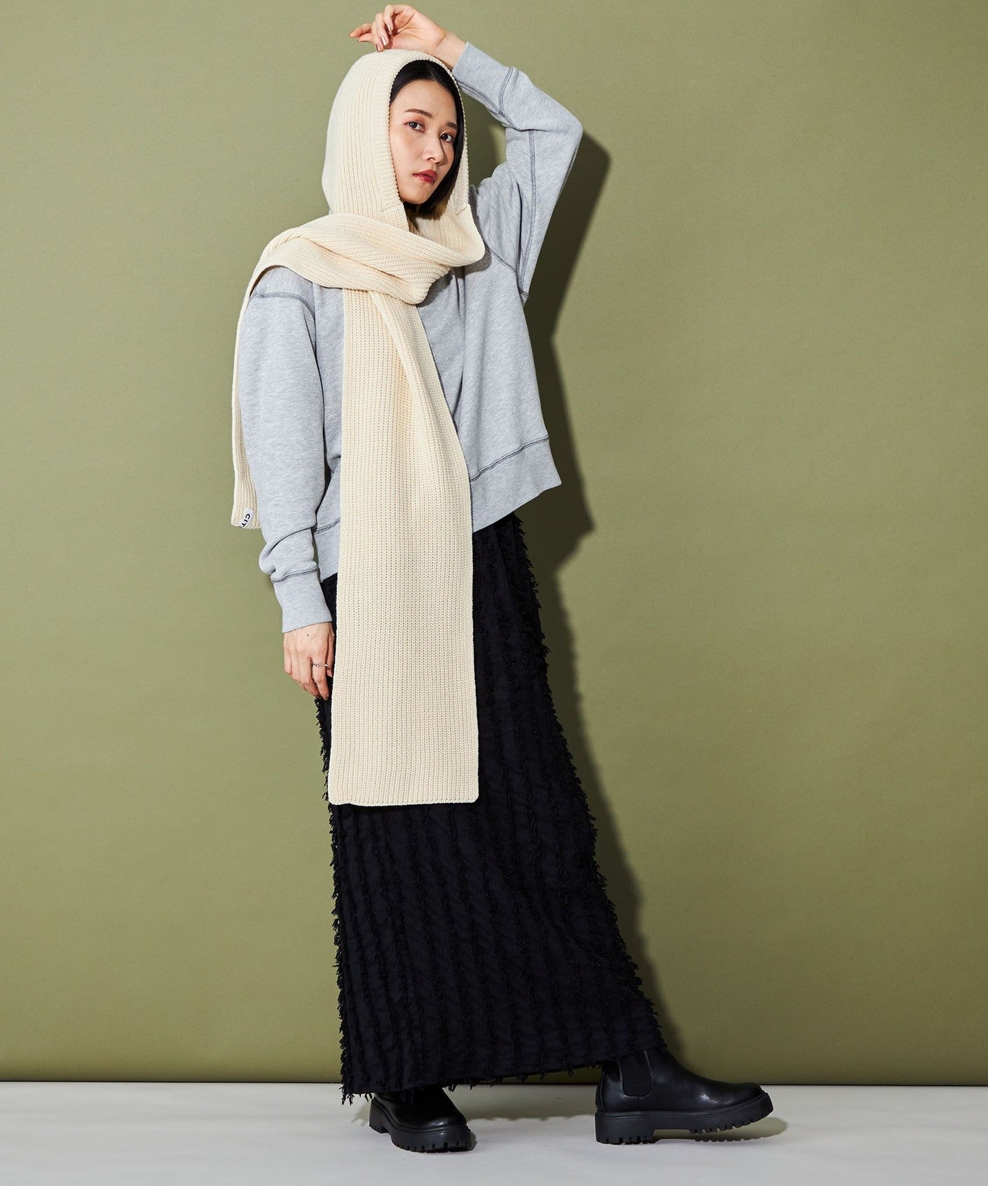 This simple ribbed knit scarf has a hood, so you can enjoy wearing it in a variety of ways by hanging it down or wrapping it around your neck.