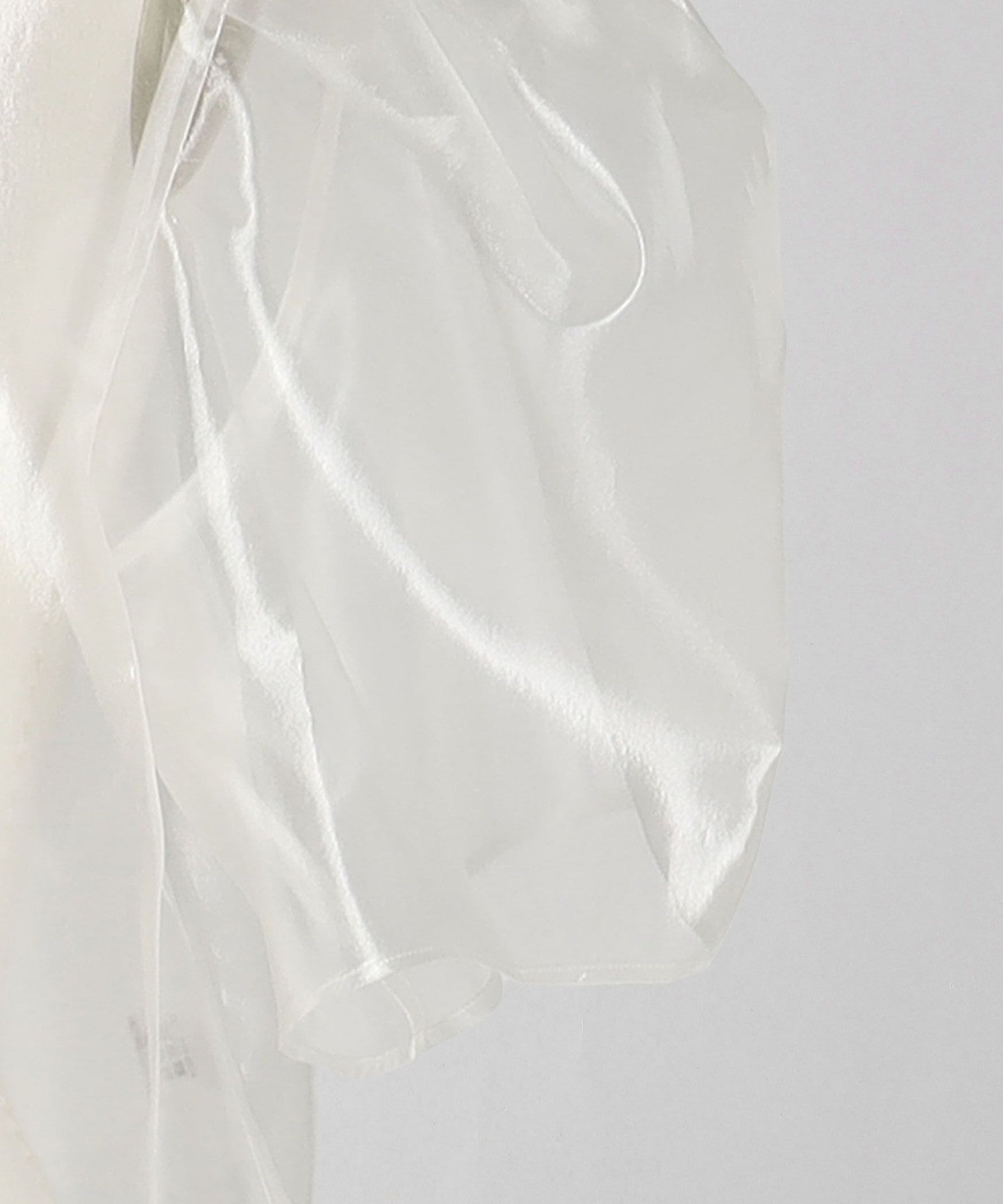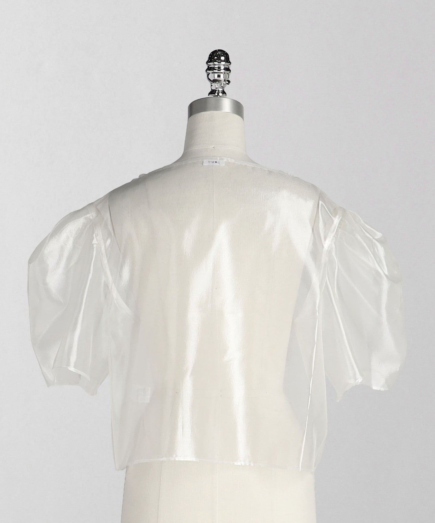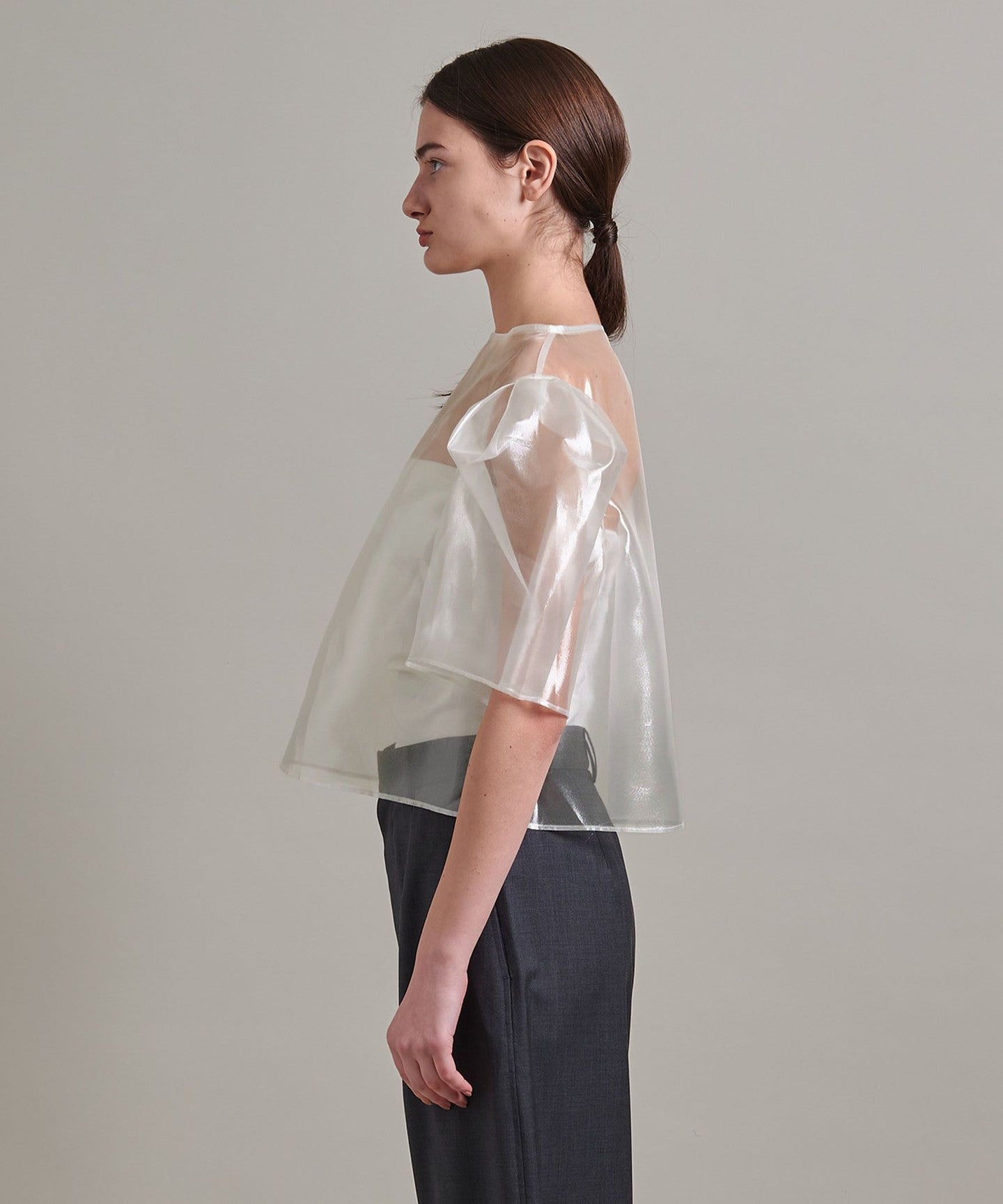 A blouse with a lustrous sheer look and a three-dimensional silhouette that gives a gorgeous impression.