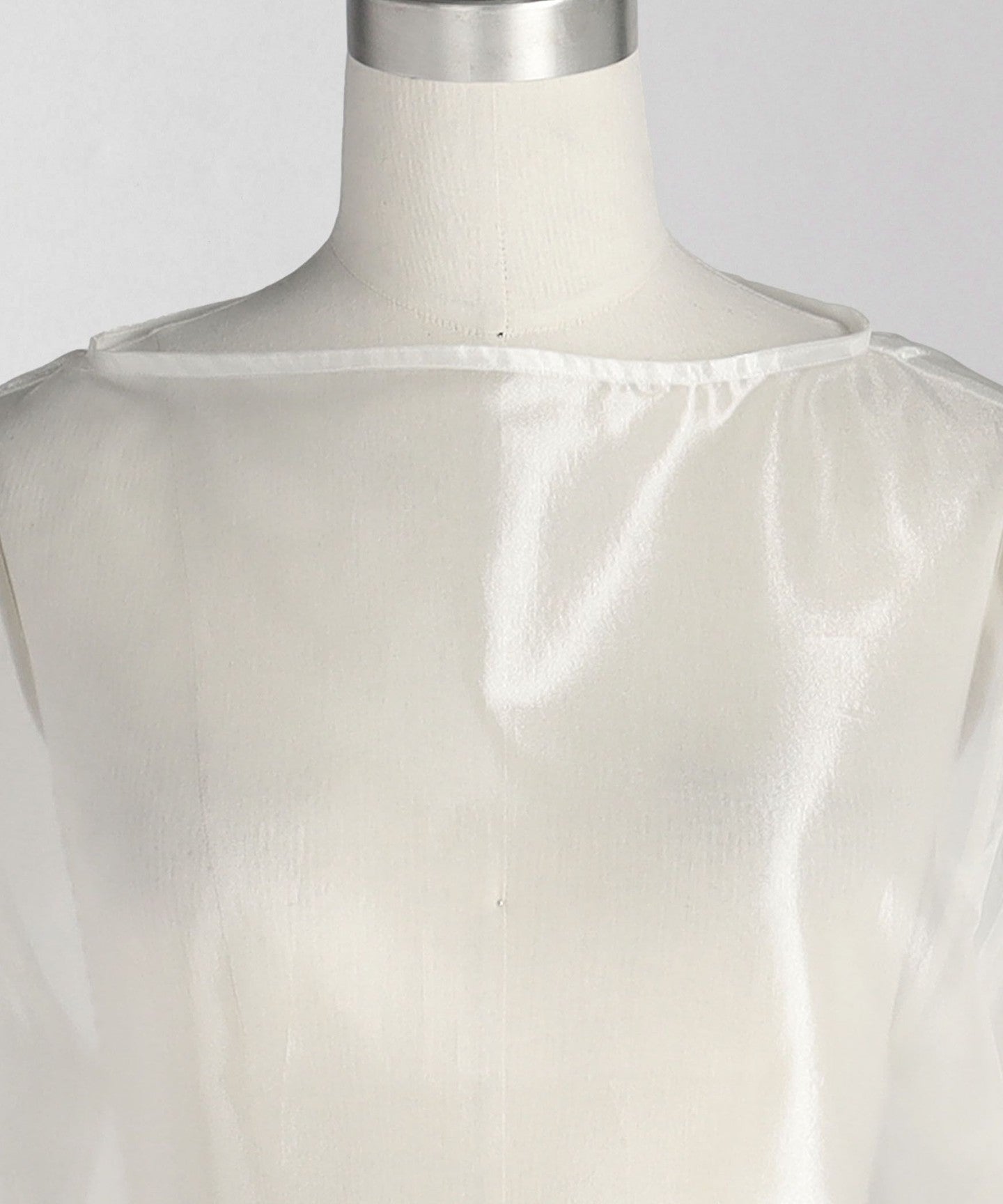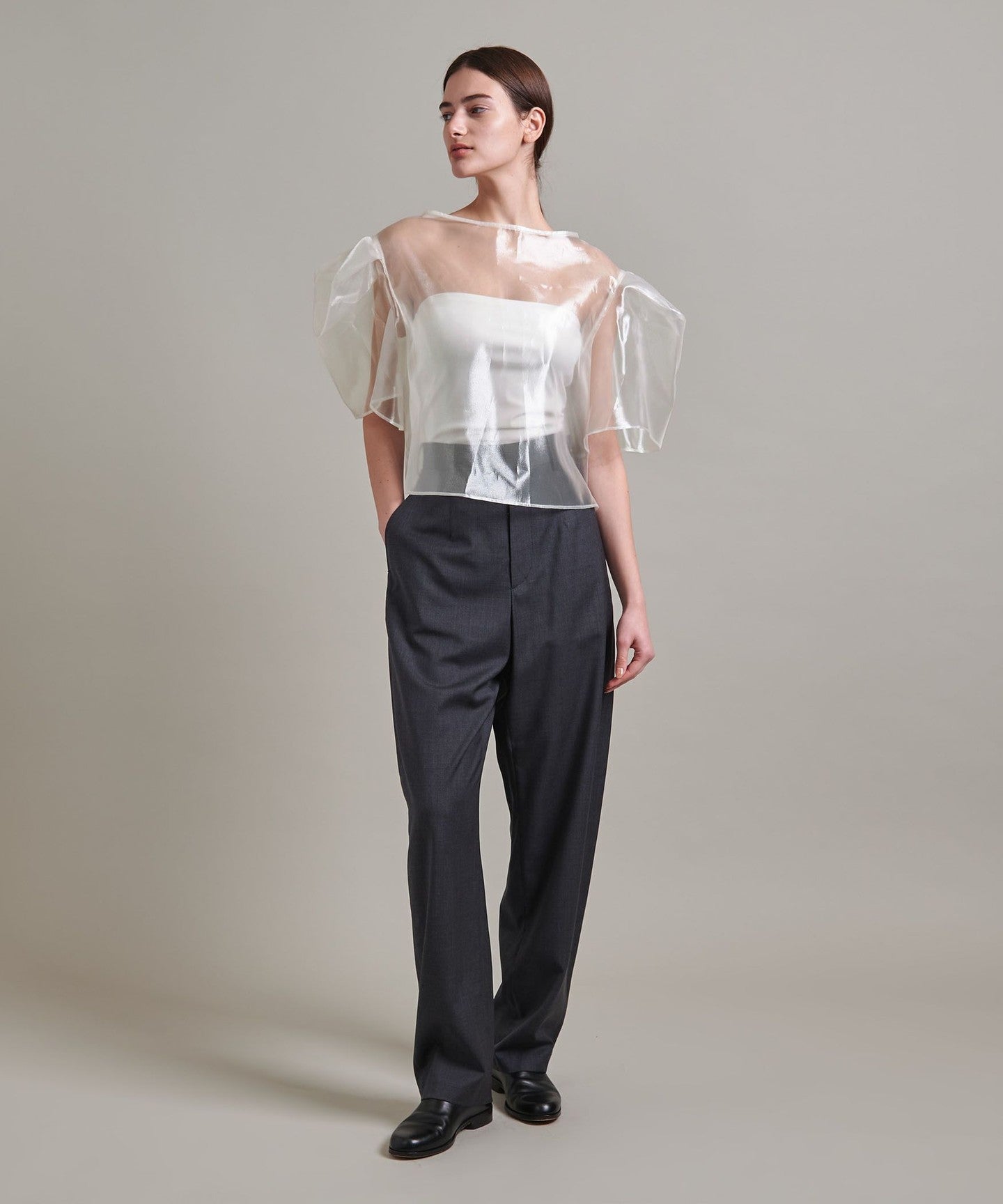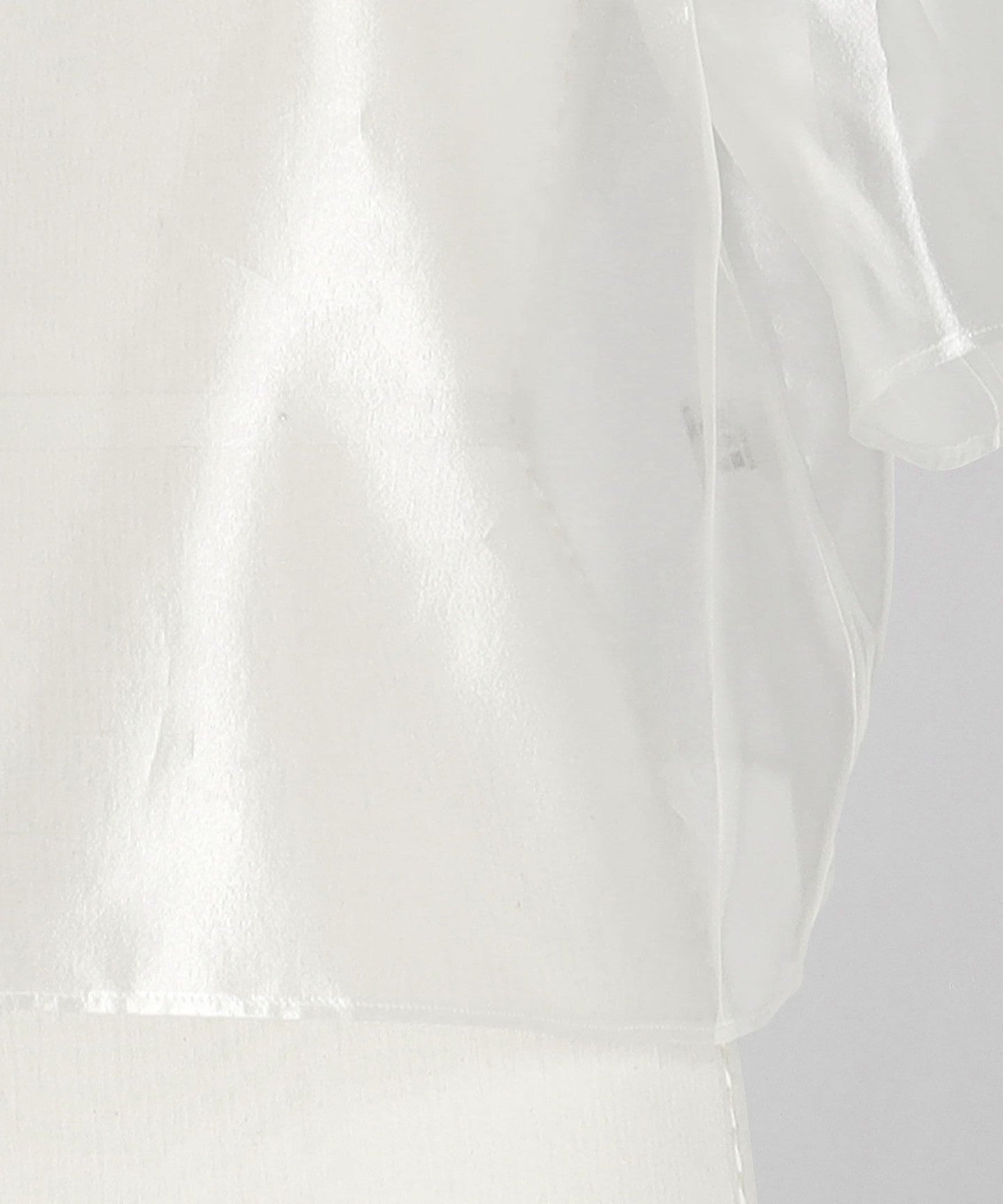 A blouse with a lustrous sheer look and a three-dimensional silhouette that gives a gorgeous impression.