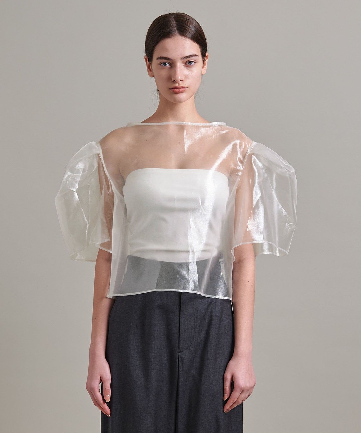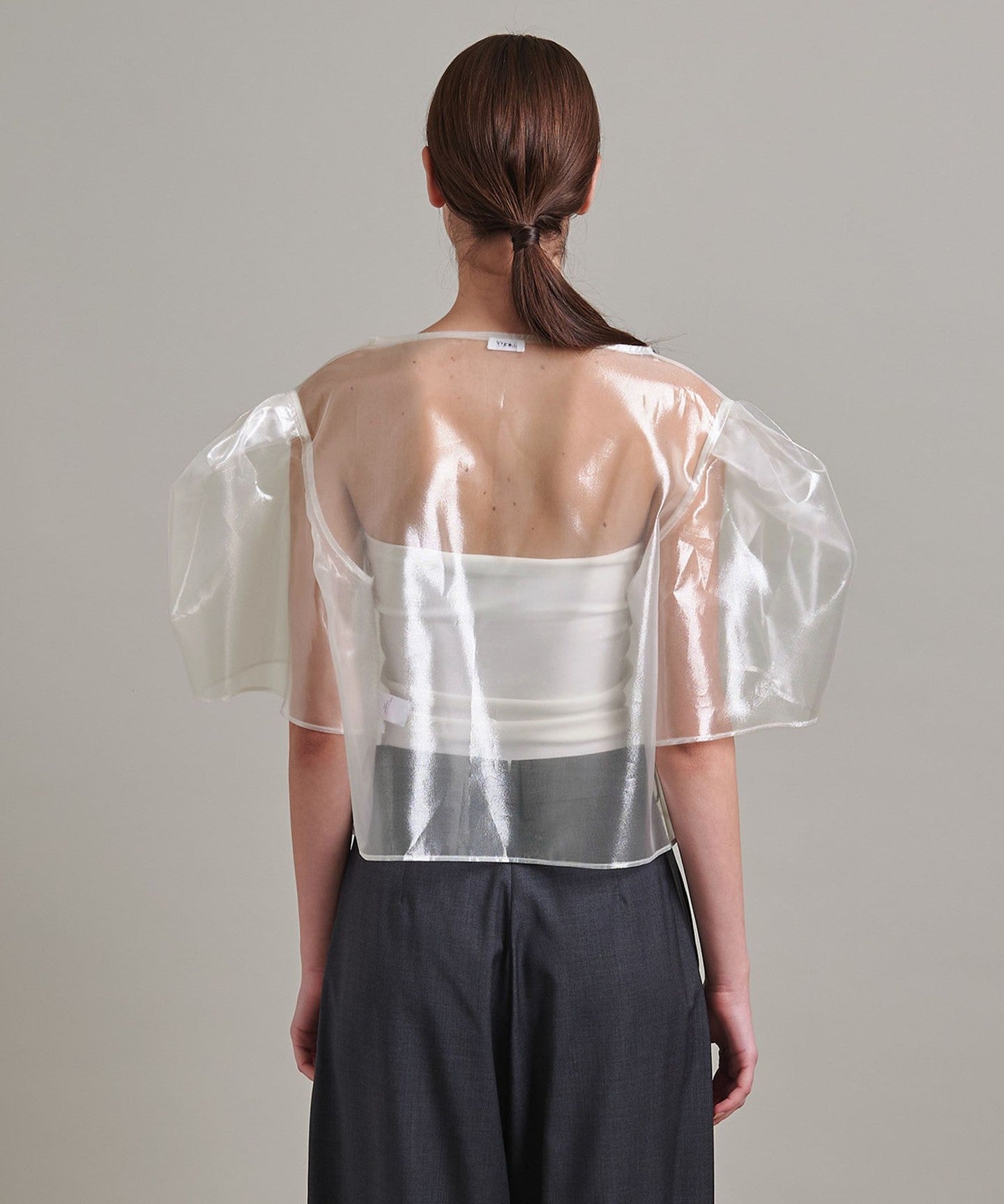 The cropped, boxy silhouette of the body features tucked puff sleeves that look like a drawstring bag.