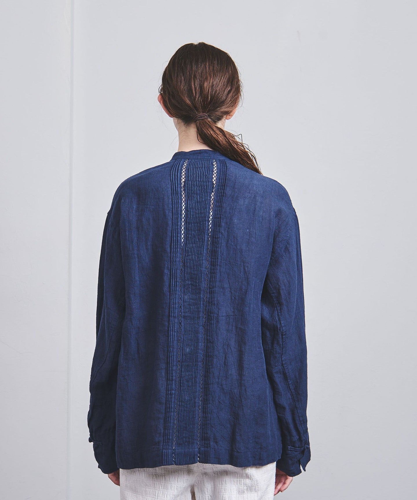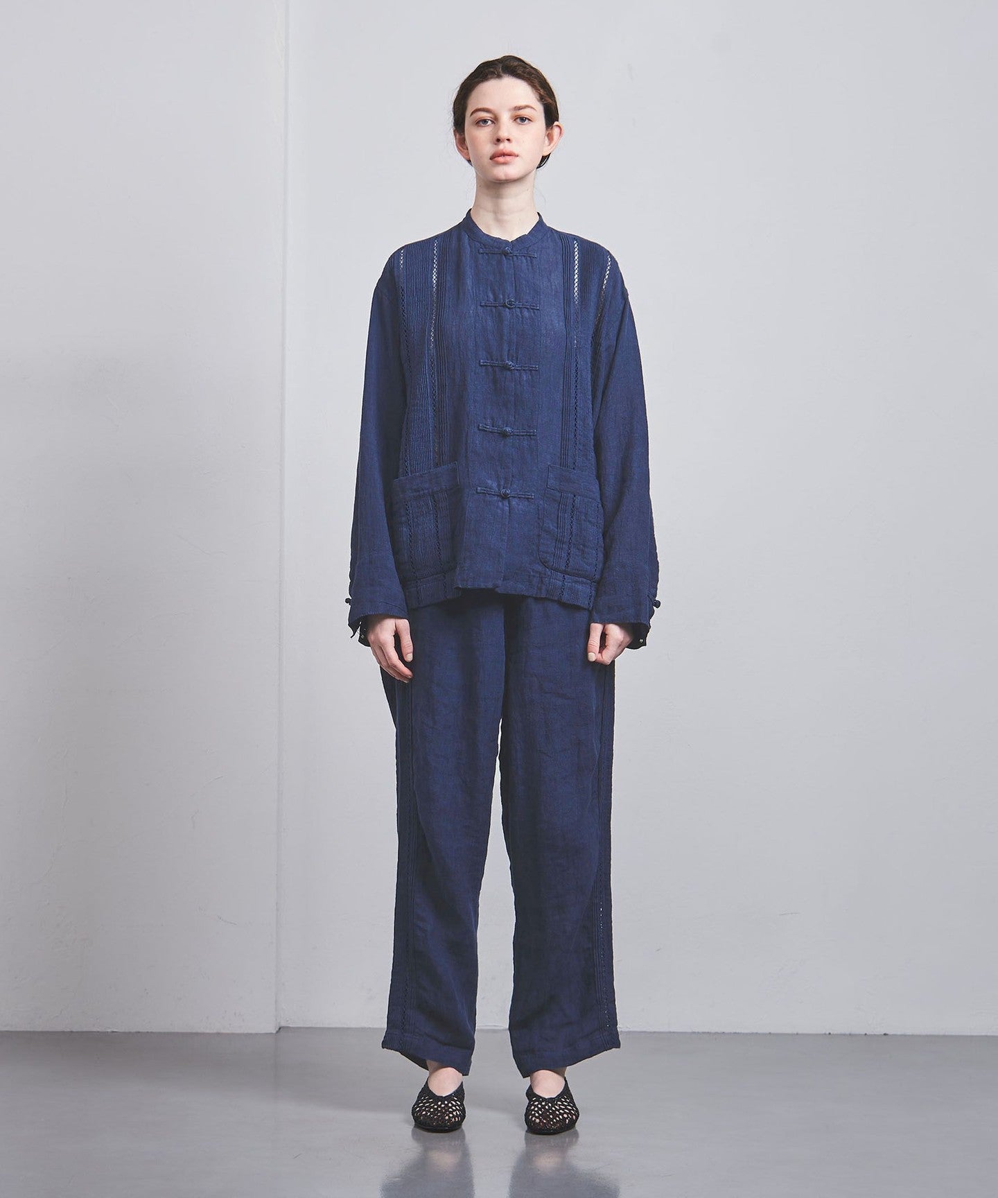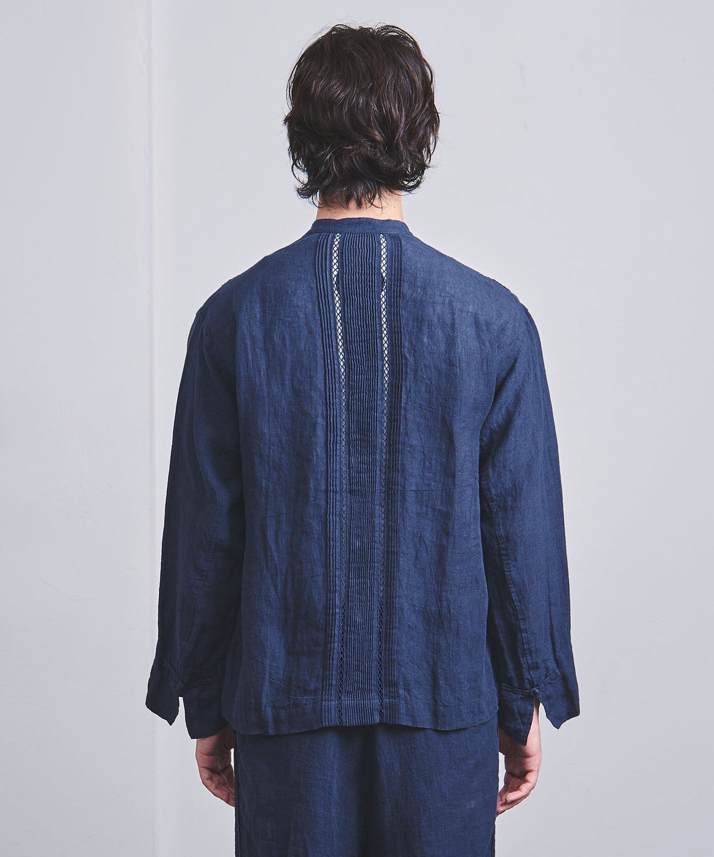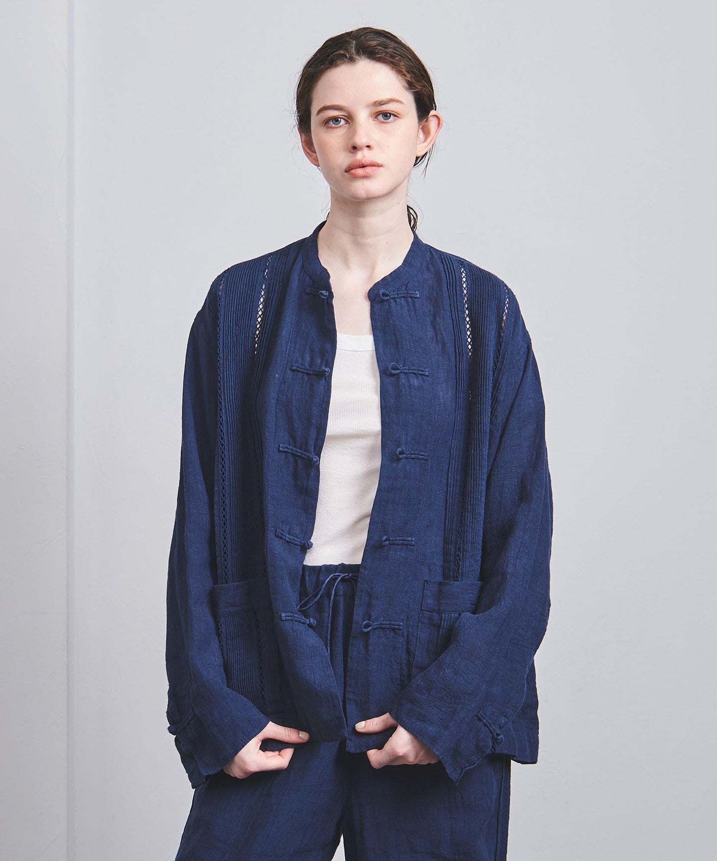 It allows the wind to pass through for a cool feeling, but is not too transparent when worn alone. We paid particular attention to the density of the material so that the luxurious volume of the fabric created by the tucks can be beautifully displayed.