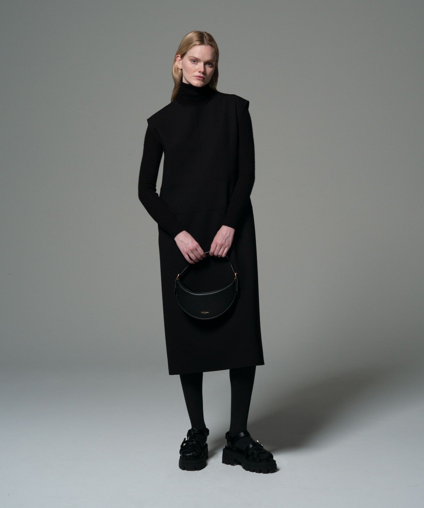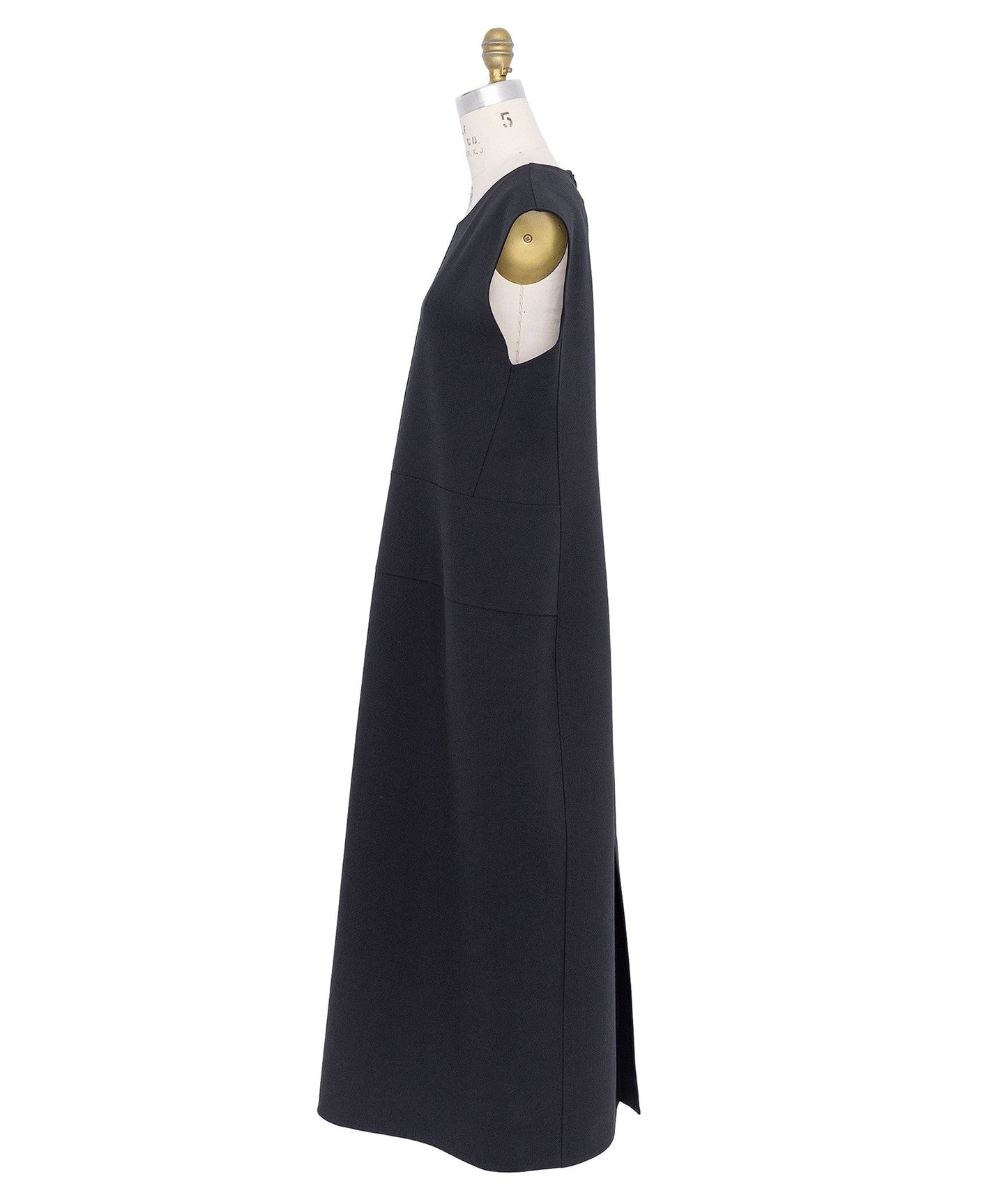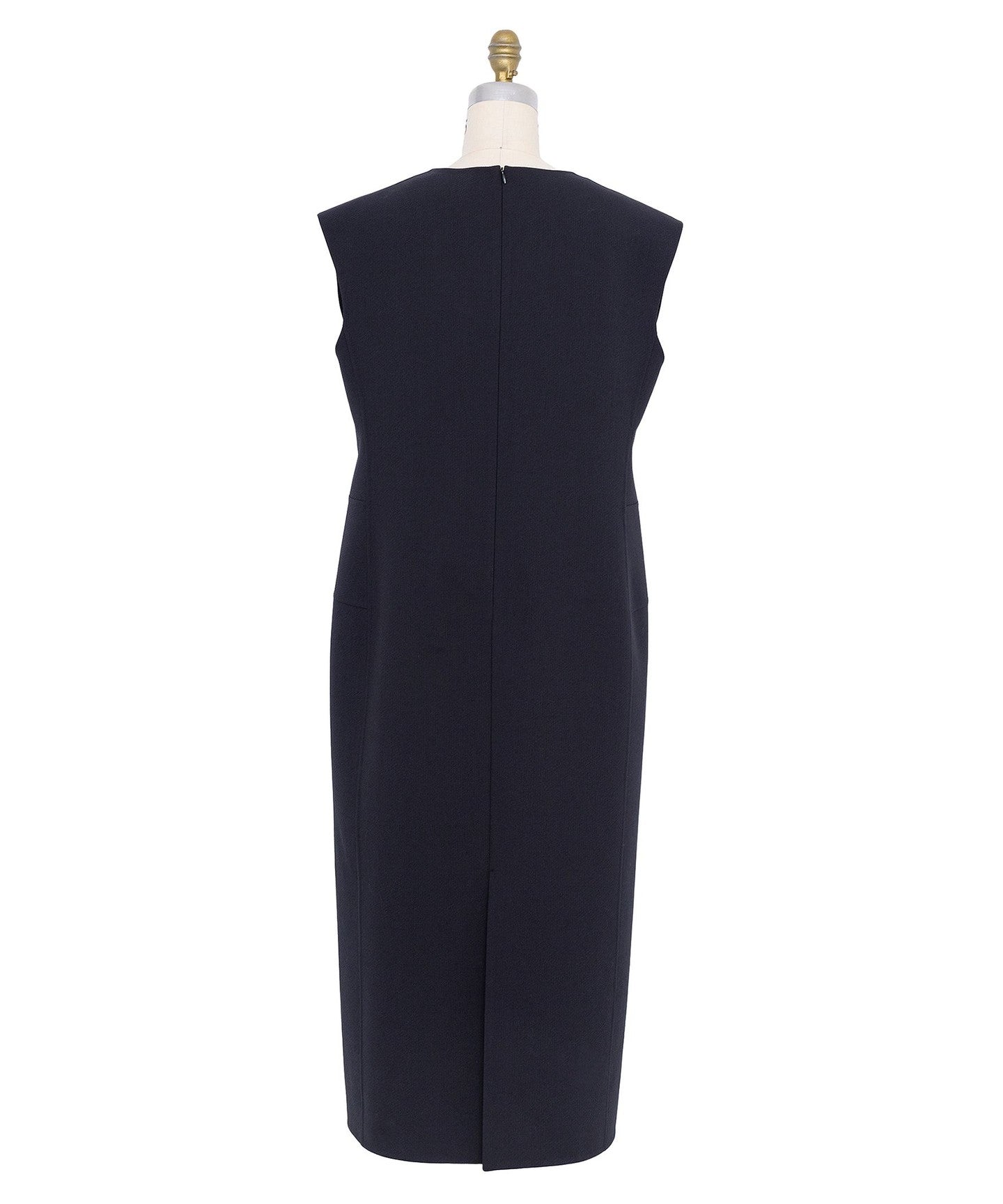 A dress with a feminine silhouette featuring a sleeveless design with arm covers and a gentle sheath line.