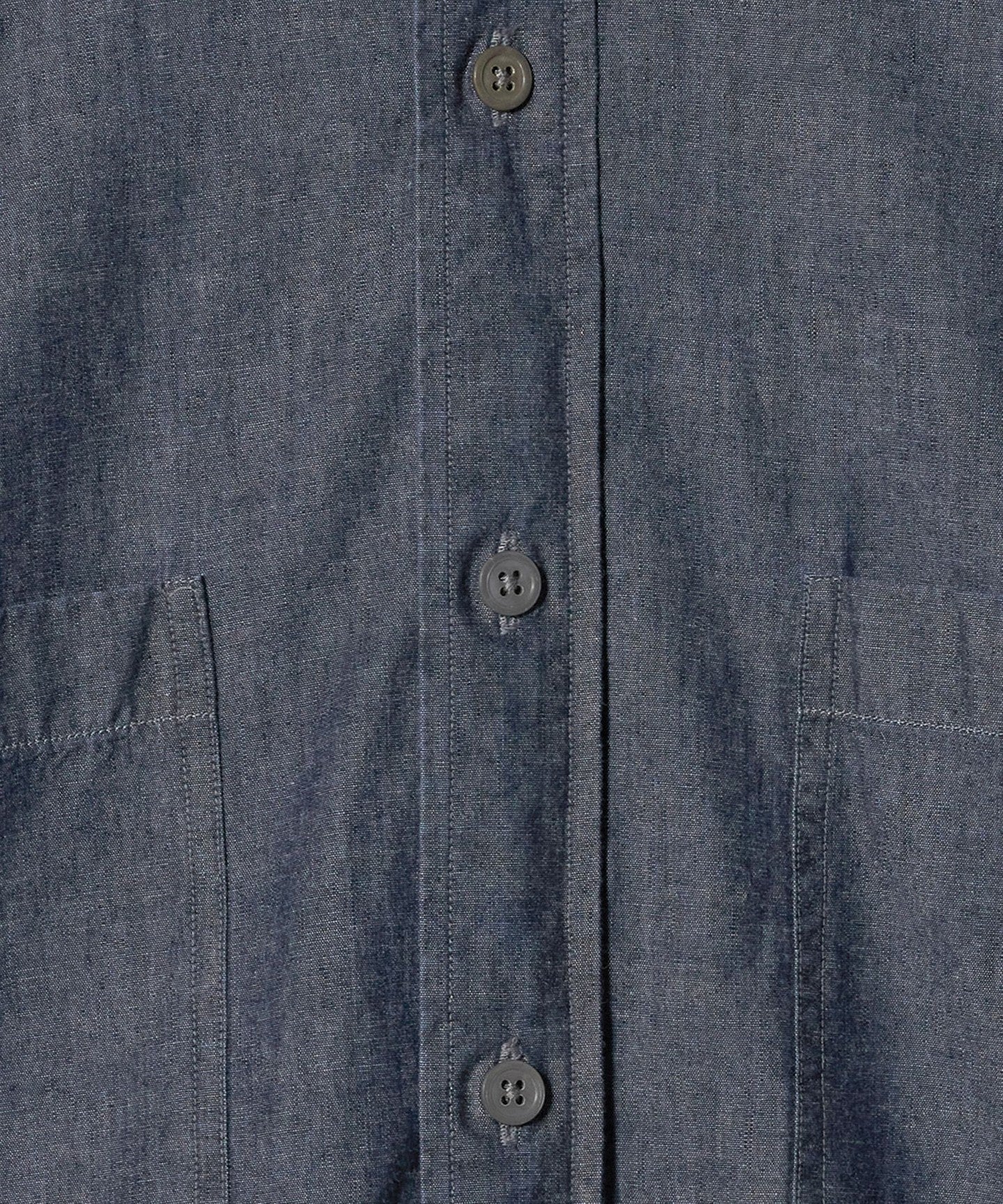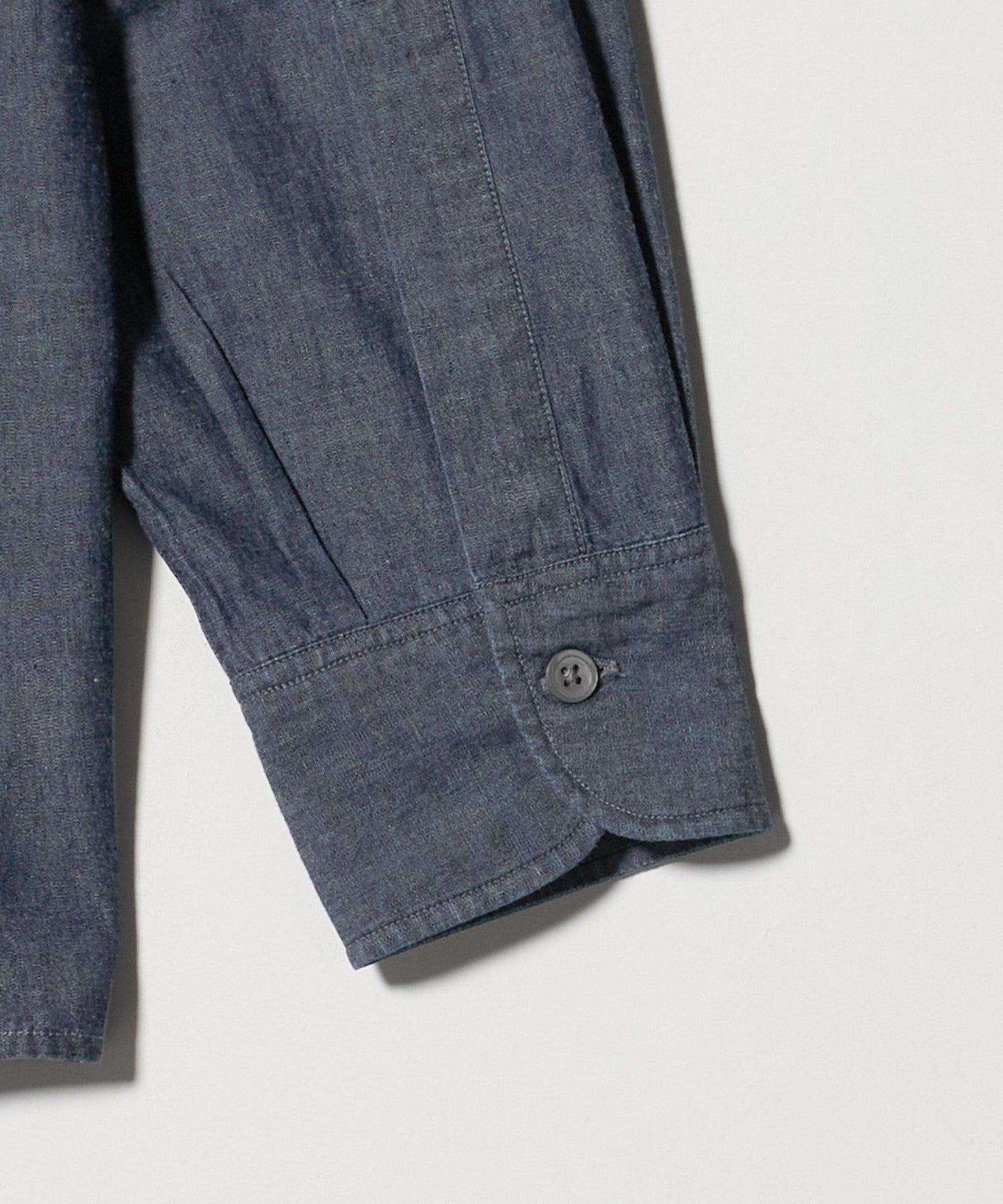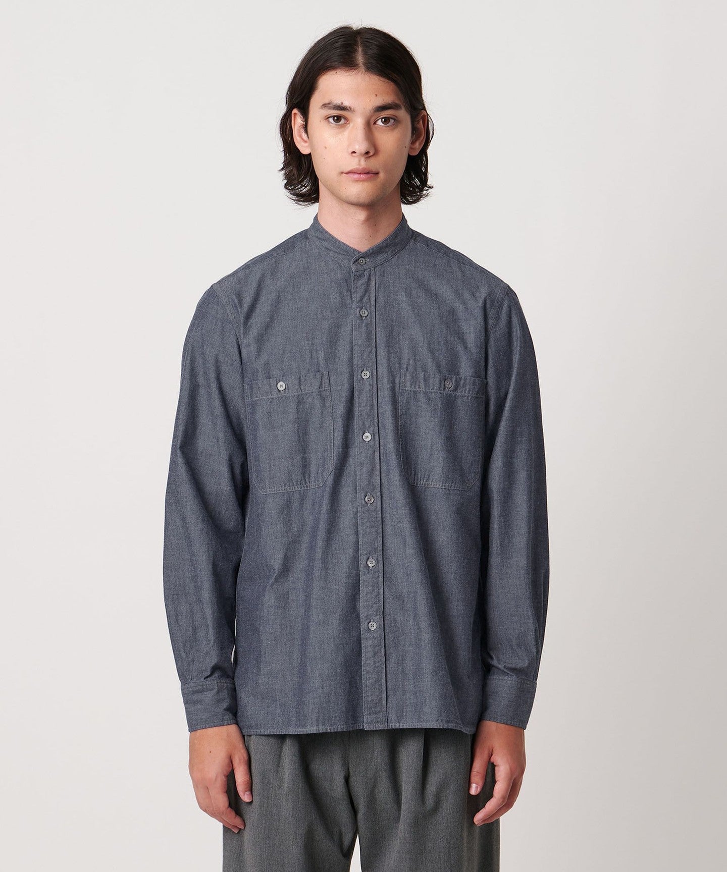 A denim band collar shirt based on a military shirt.