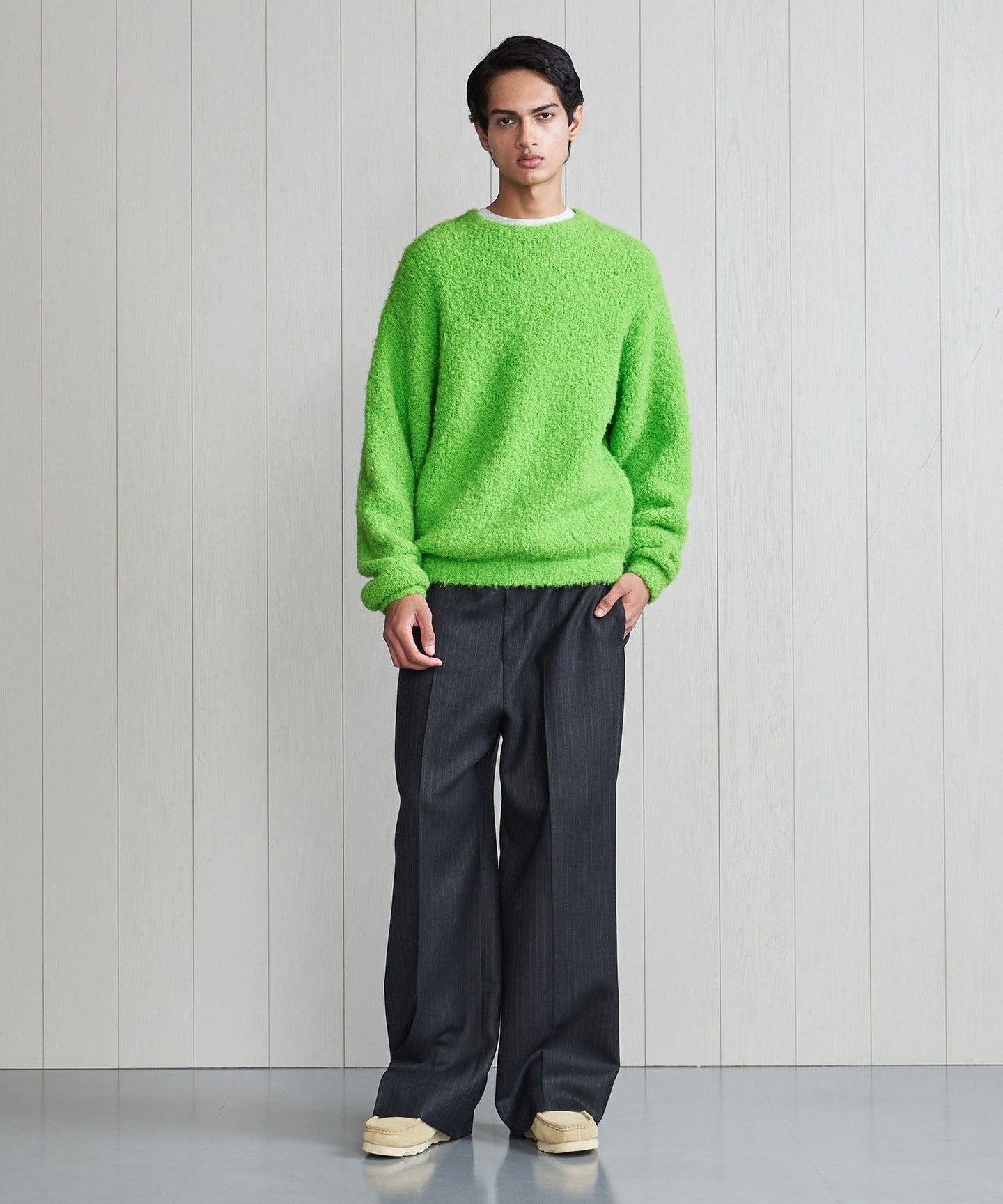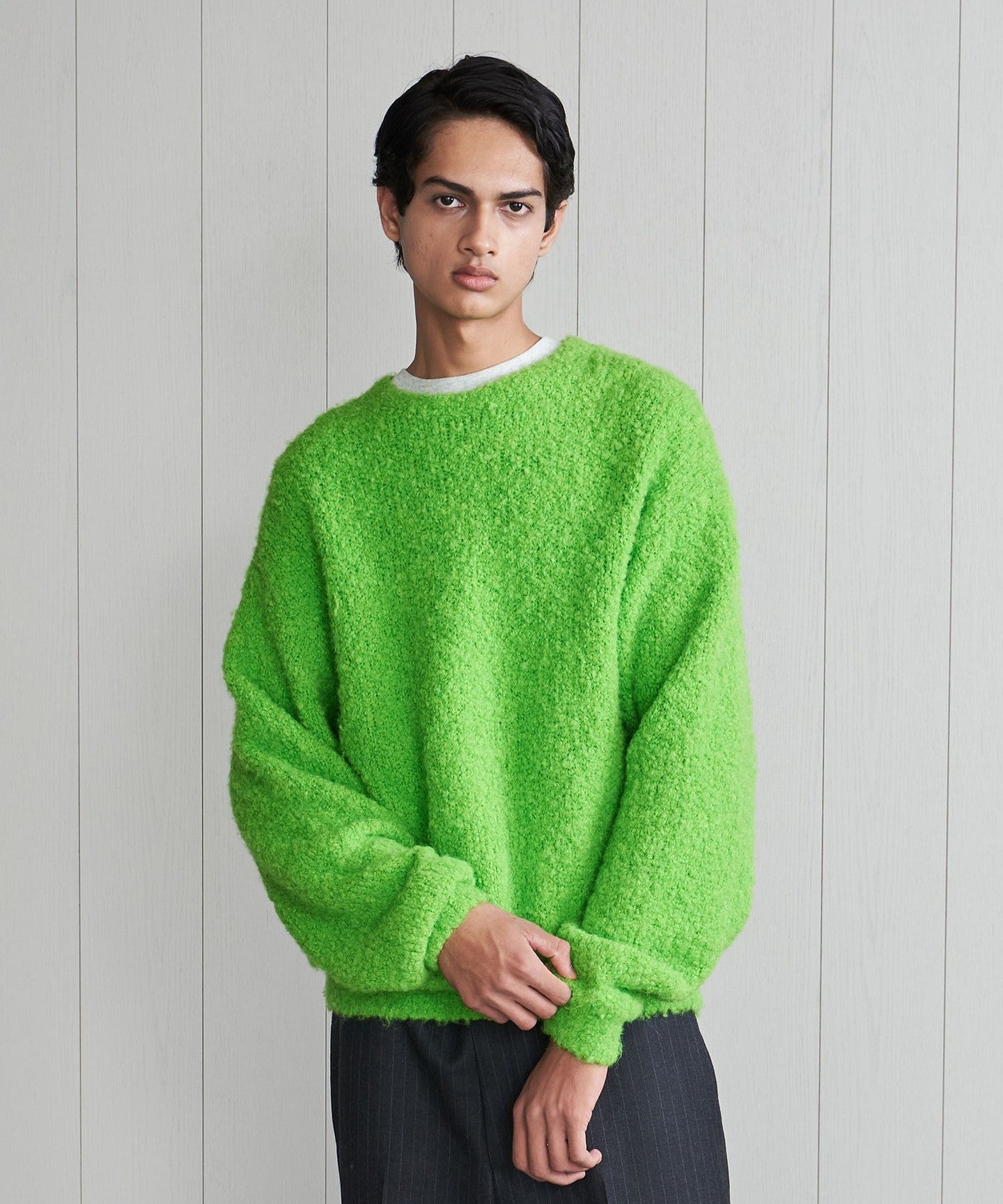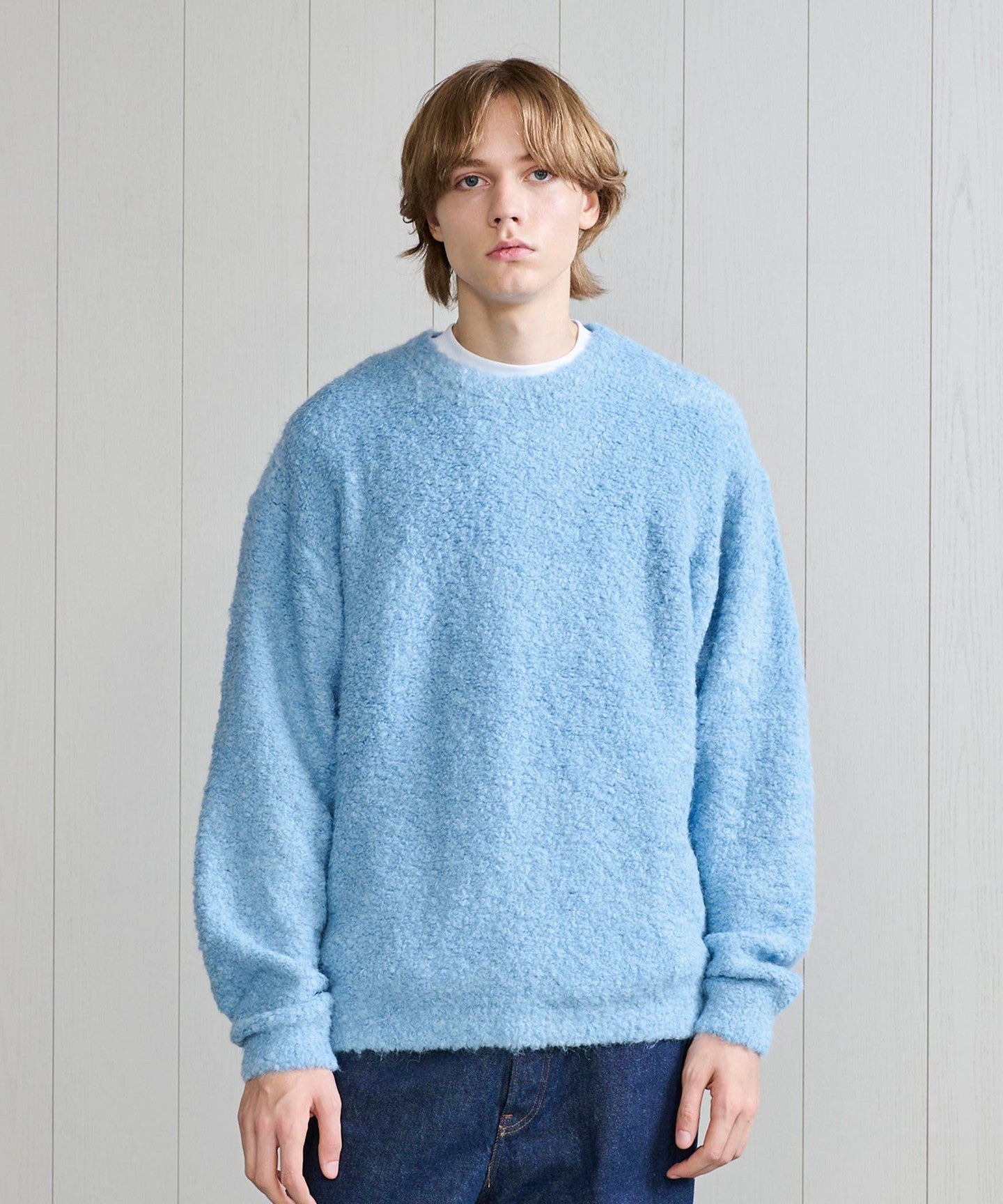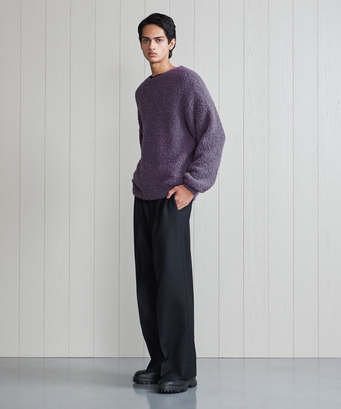 This crew neck knit boasts rich color and is crafted using yarn from the prestigious Italian company LINEAPIU. It features a three-dimensional surface texture, knitted with a poodle-like looped yarn. The fullness and lightness of the sleeves make it perfect for fall. Available in three sizes, it offers a range of classic and eye-catching colors that will add a touch of style to any outfit. While creating an impressive look, its relaxed, unpretentious feel makes it a recommended piece for a playful style.