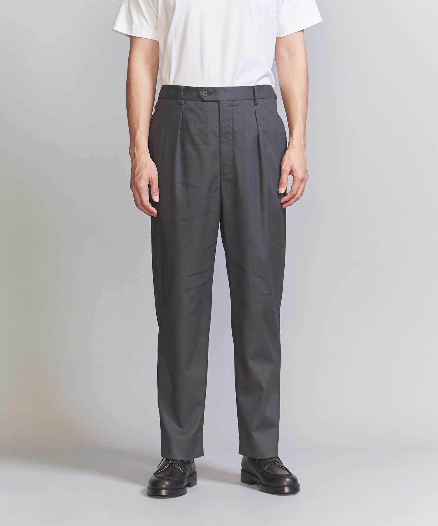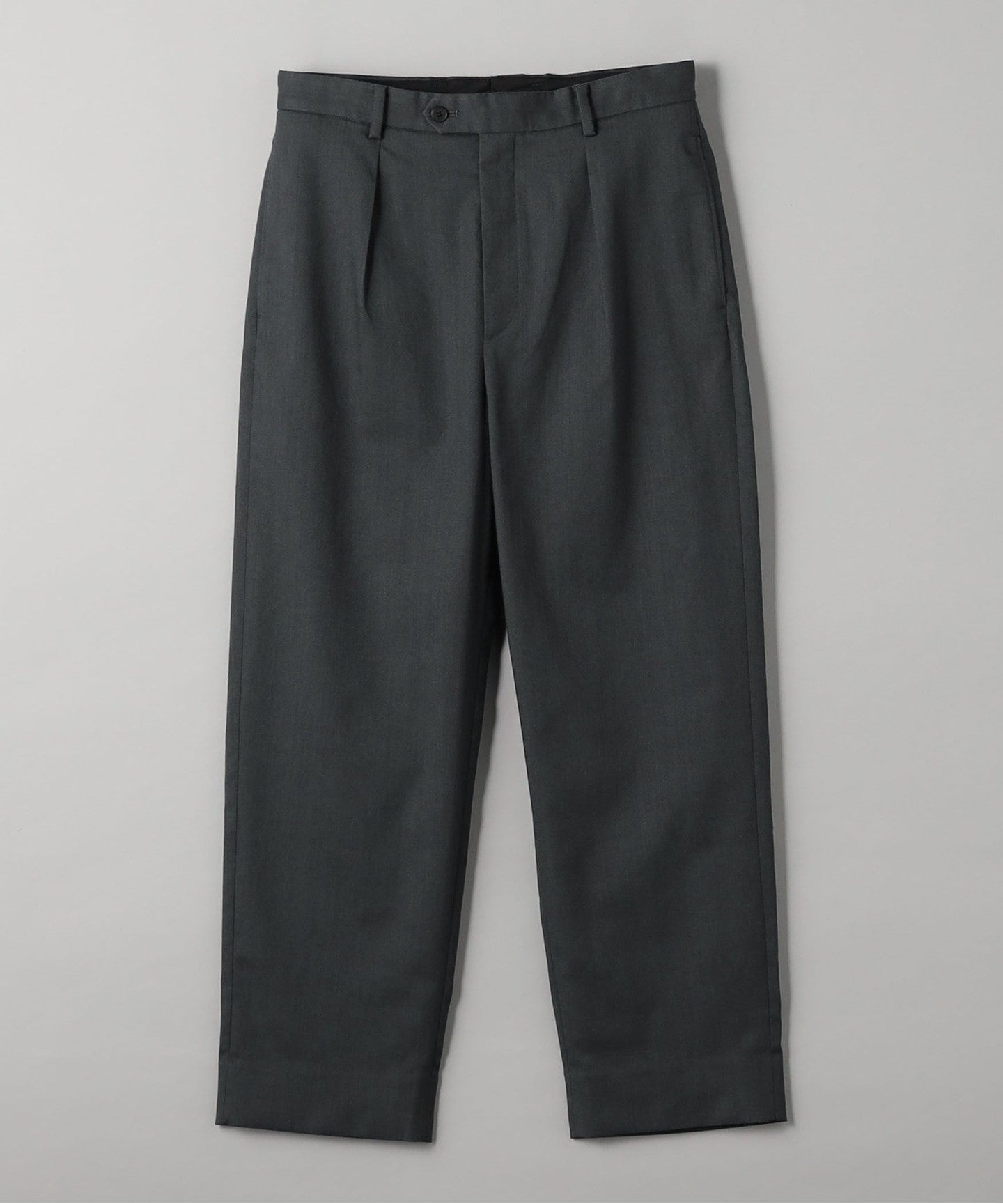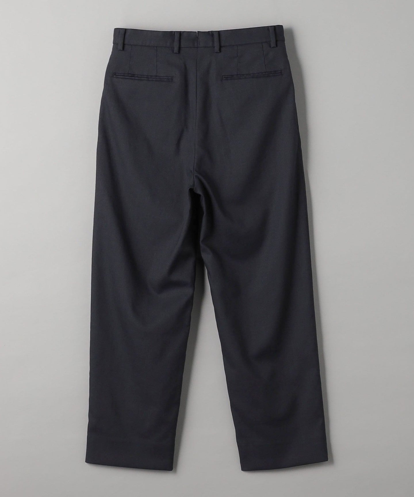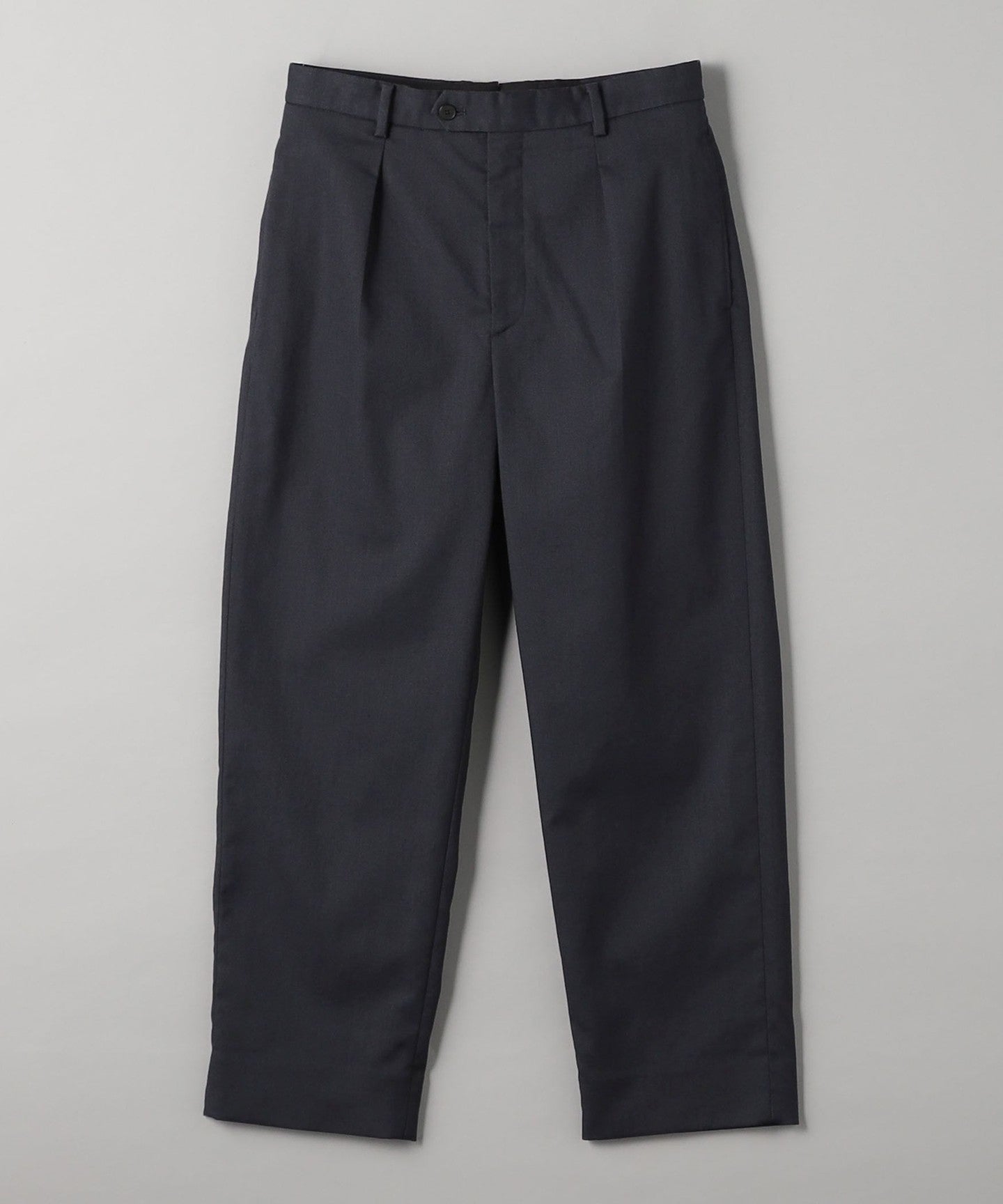Tucks around the waist give room from the hips to the thighs, creating a tapered silhouette that gradually narrows towards the hem.