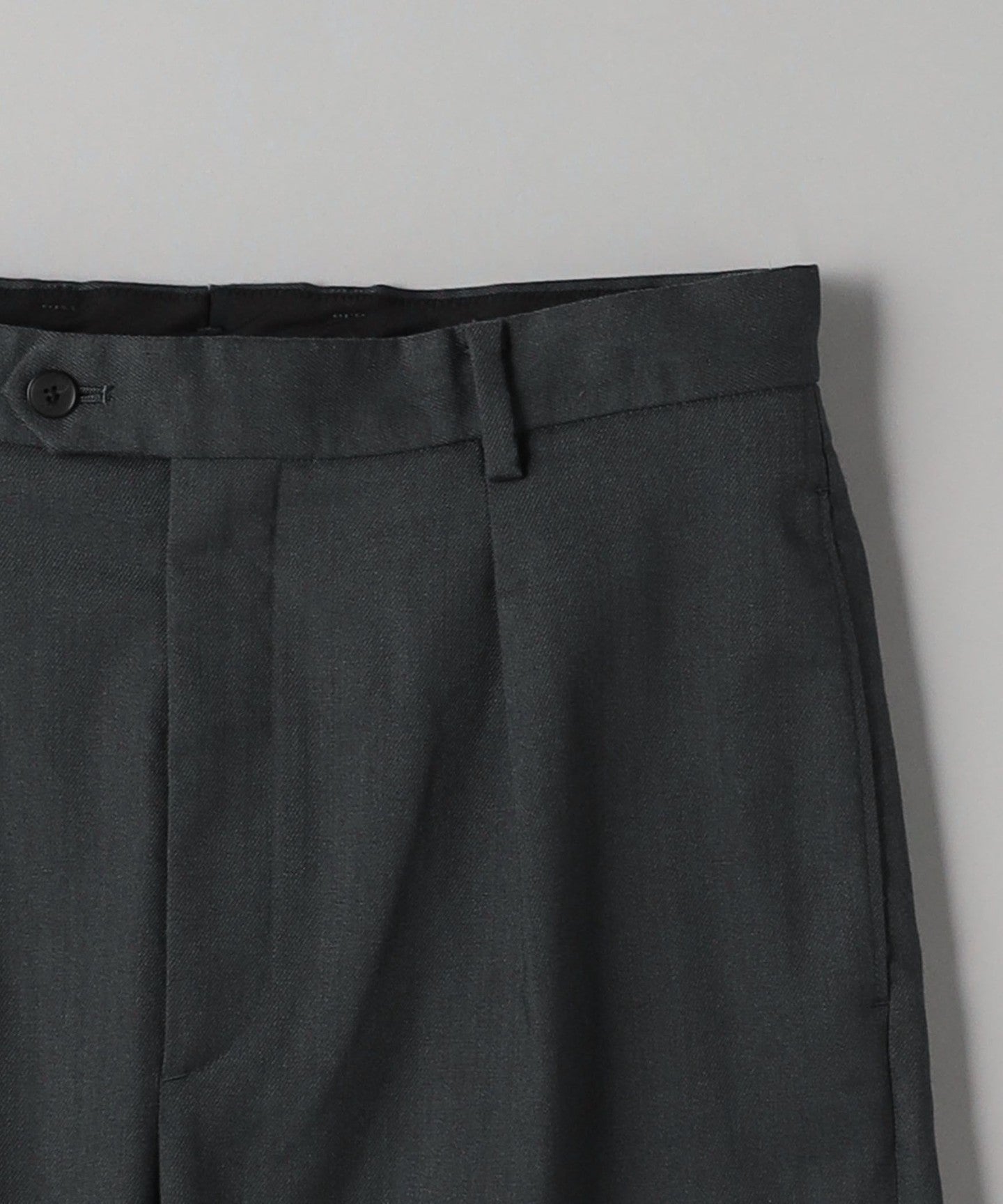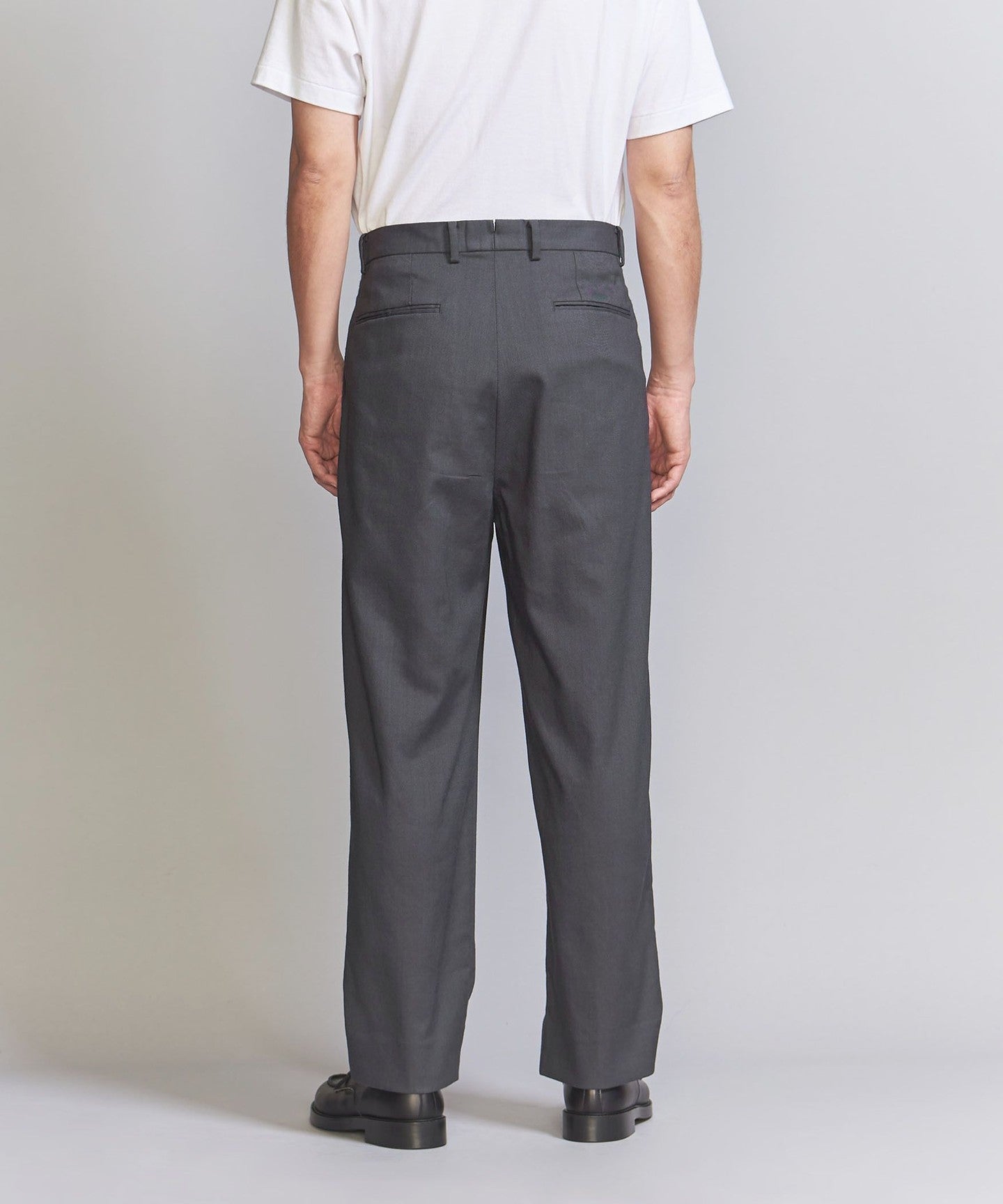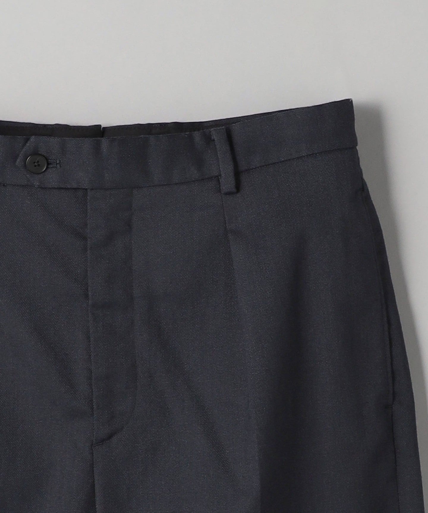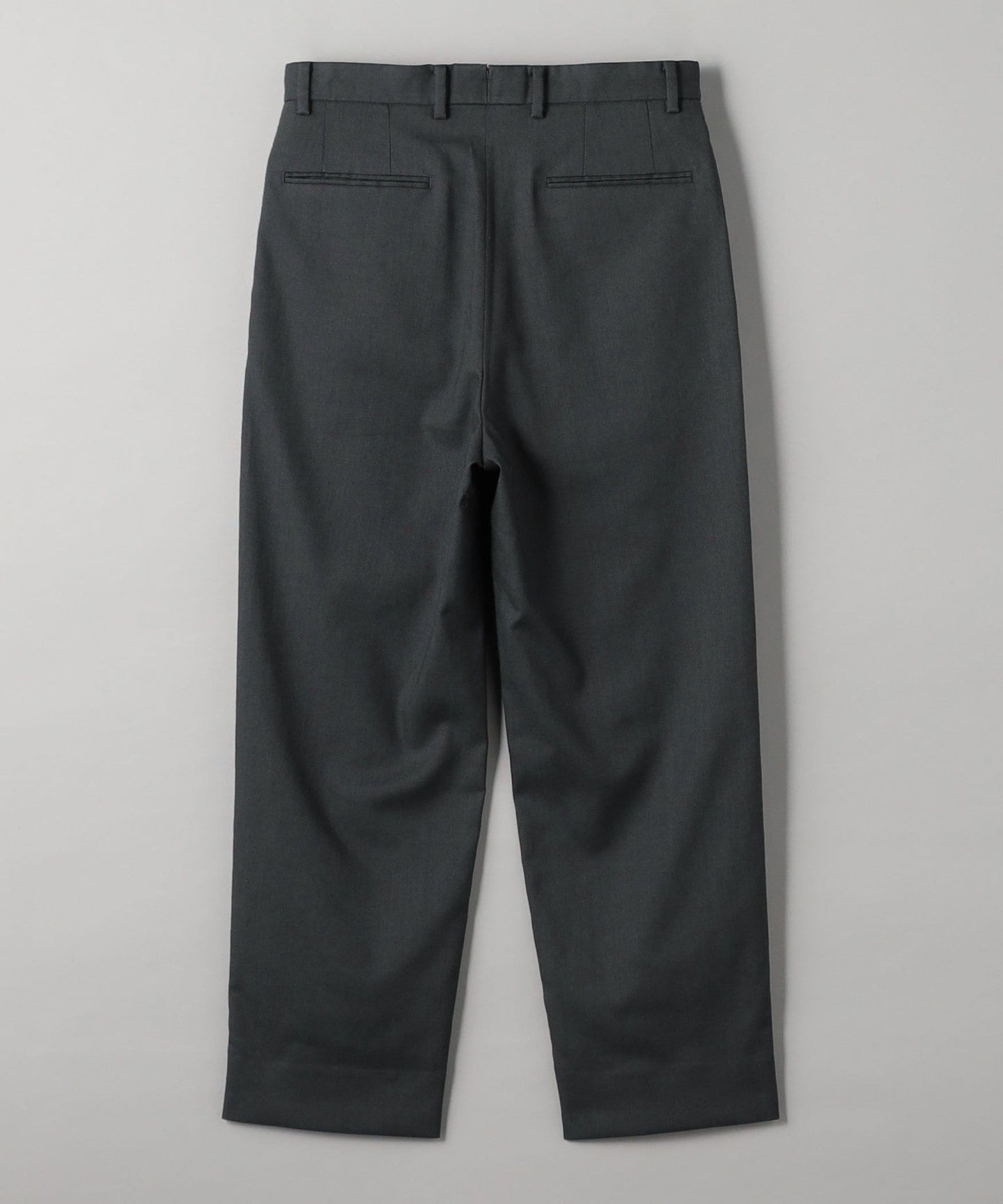 Tucks around the waist give room from the hips to the thighs, creating a tapered silhouette that gradually narrows towards the hem.