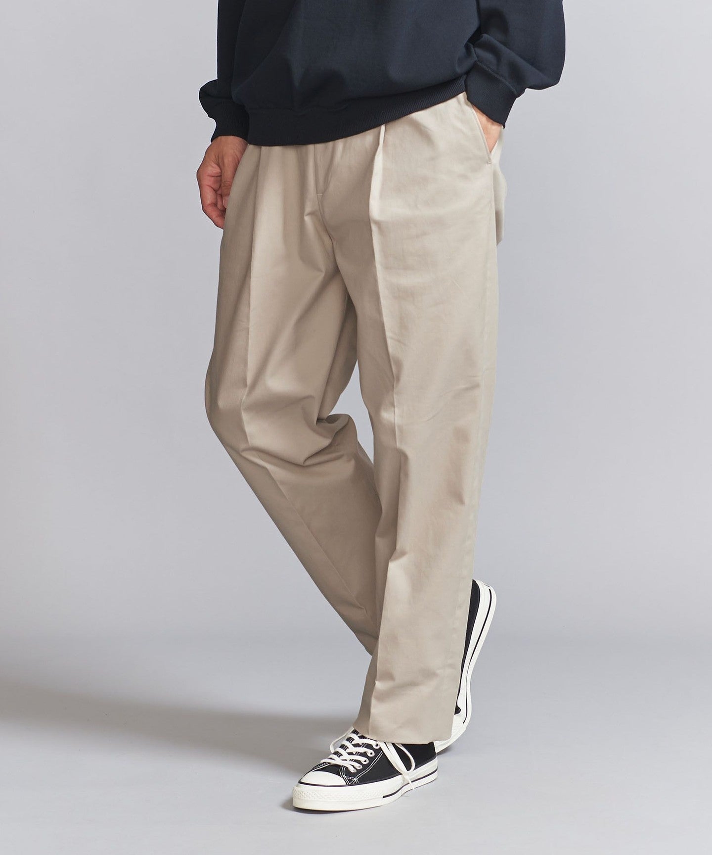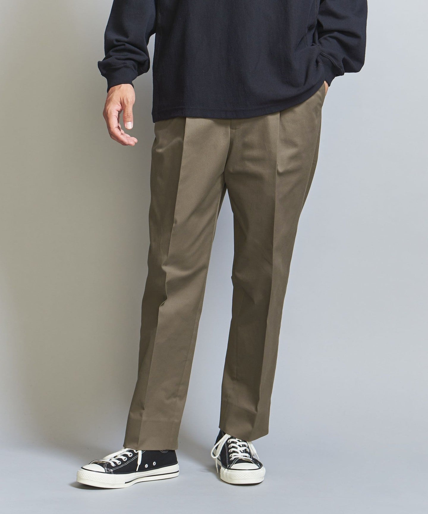 Chino pants generally have a casual impression, but we've made these slacks style to give them a neater look.