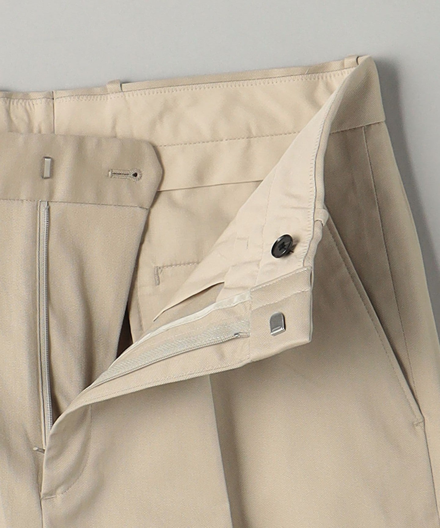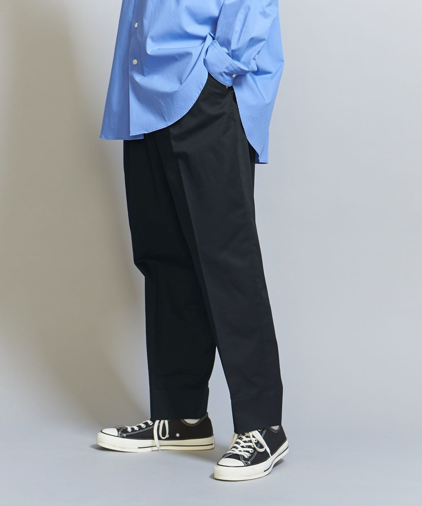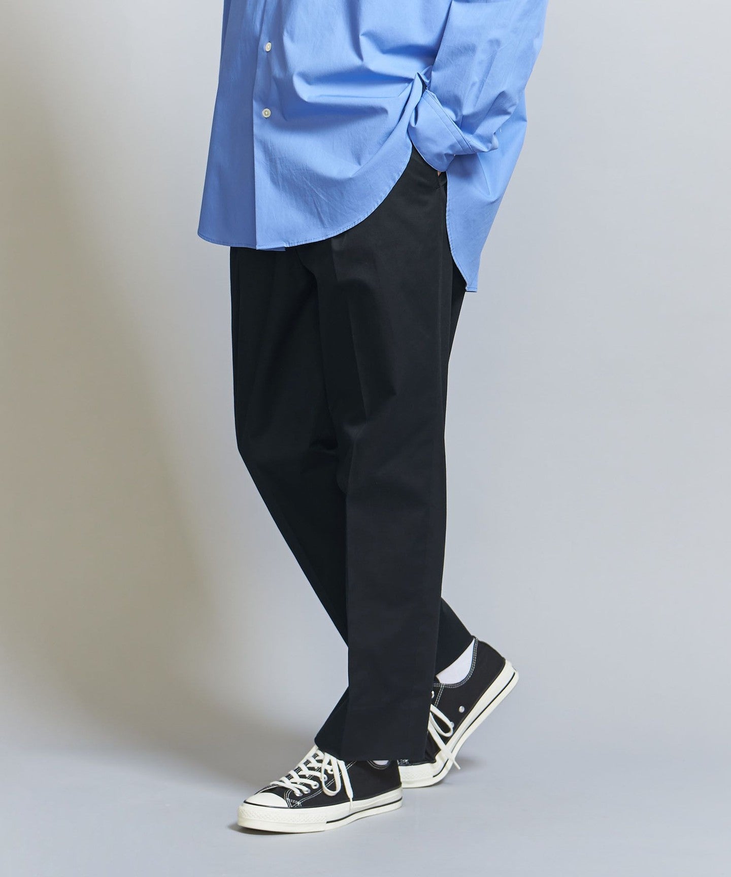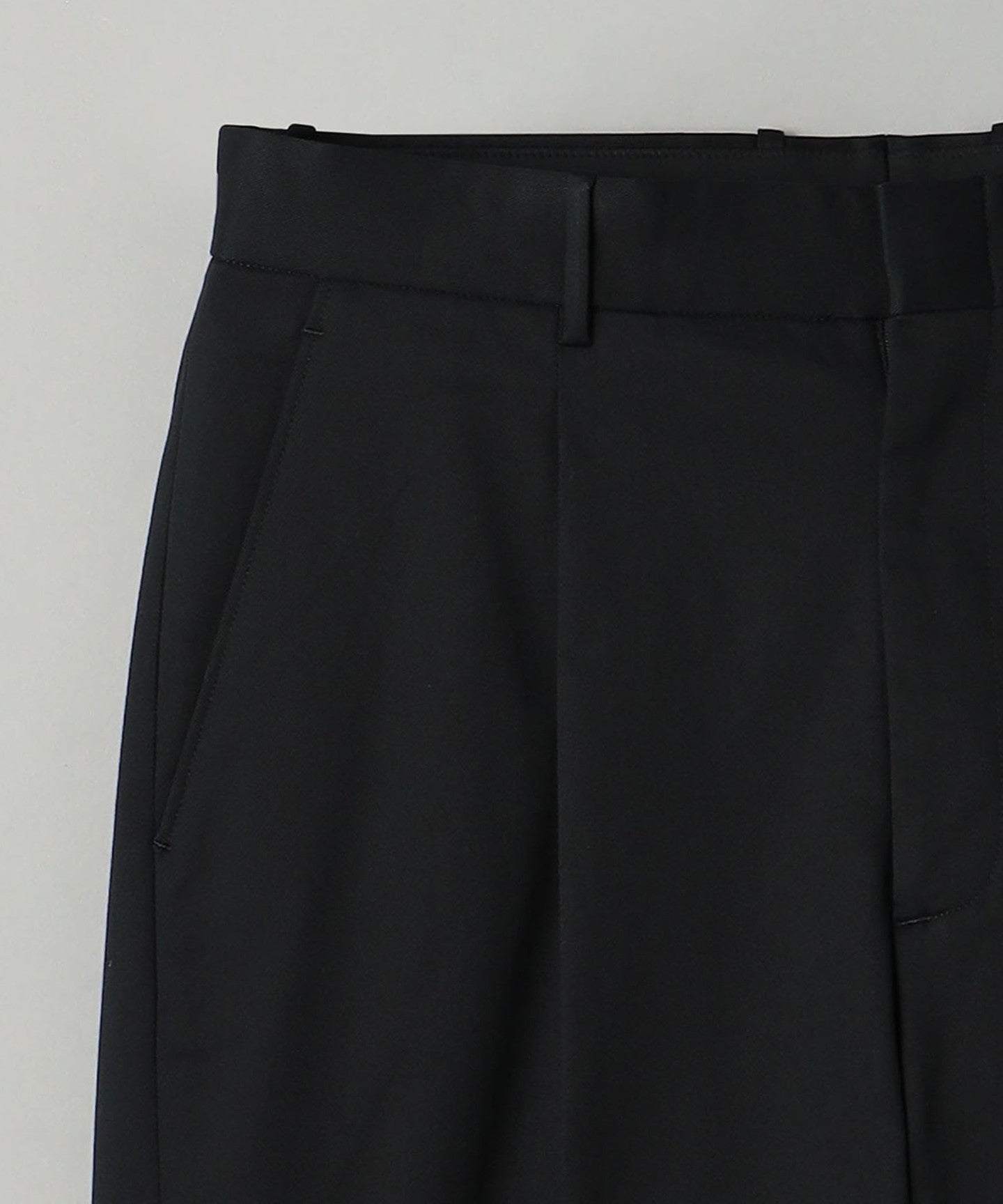 Tucks are added around the waist to give room from the hips to the thighs, HEM It has a tapered silhouette that gradually narrows towards the waist.