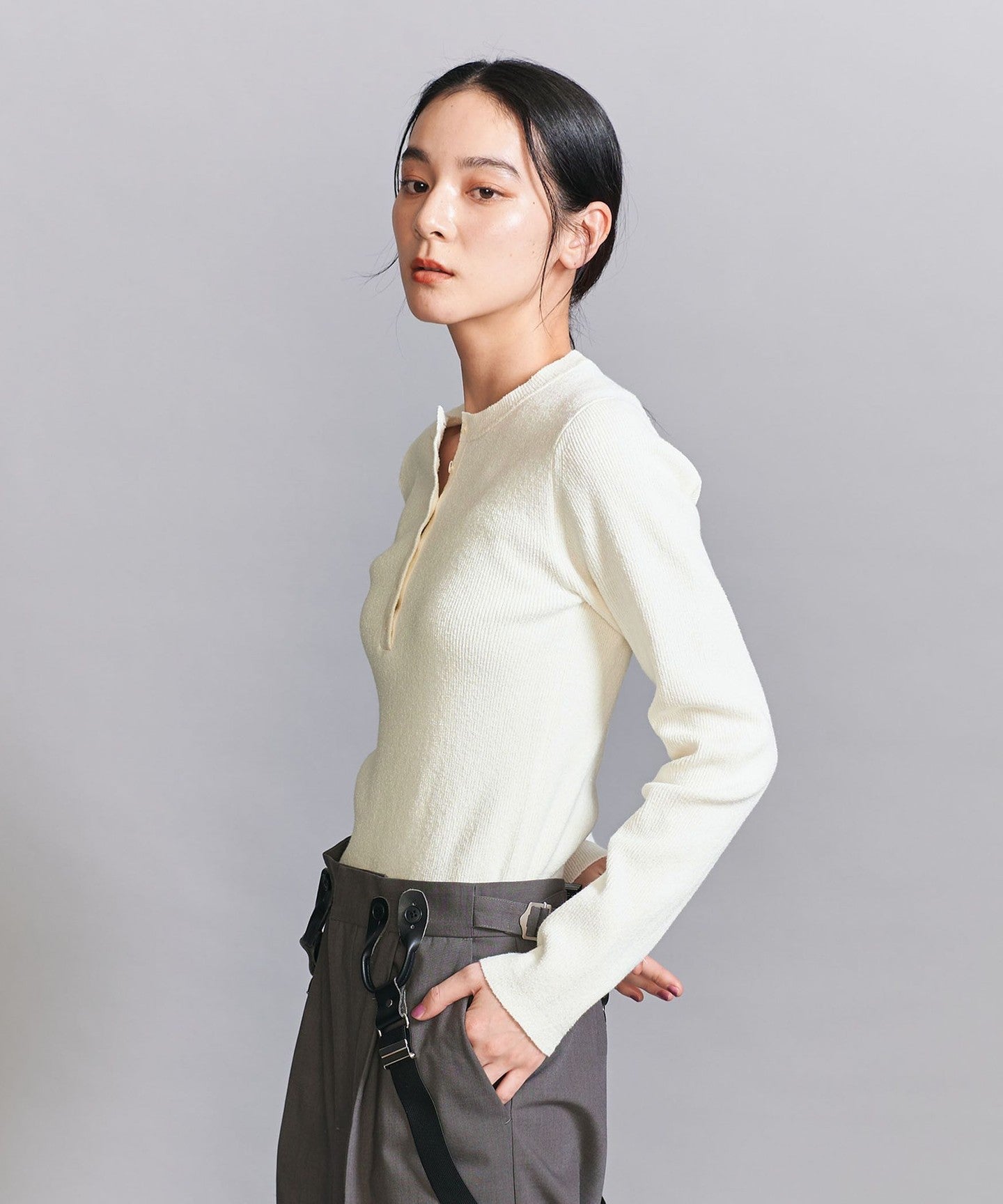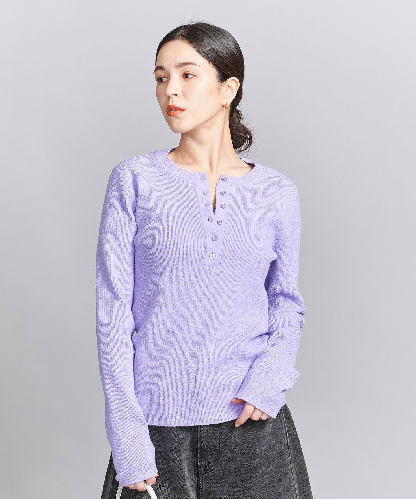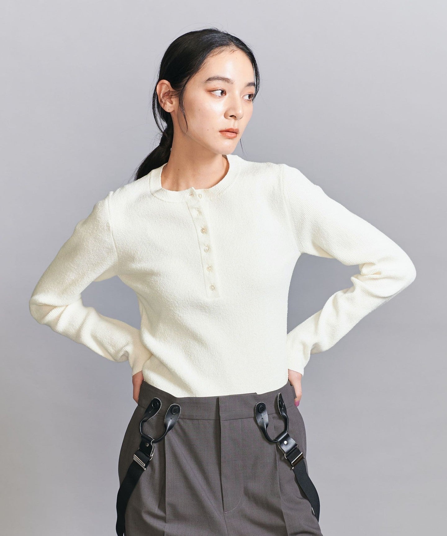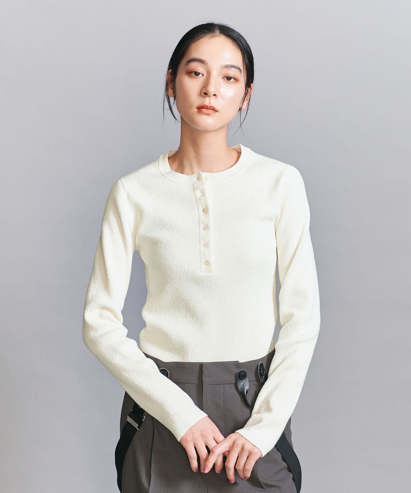 A compact silhouette is the current trend. This Henley knit can be worn on its own or layered.