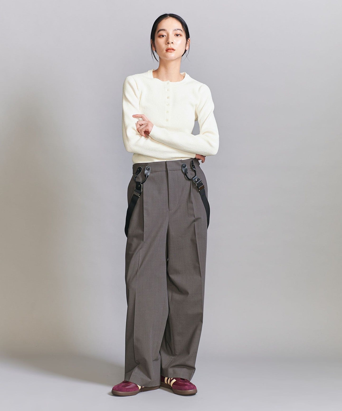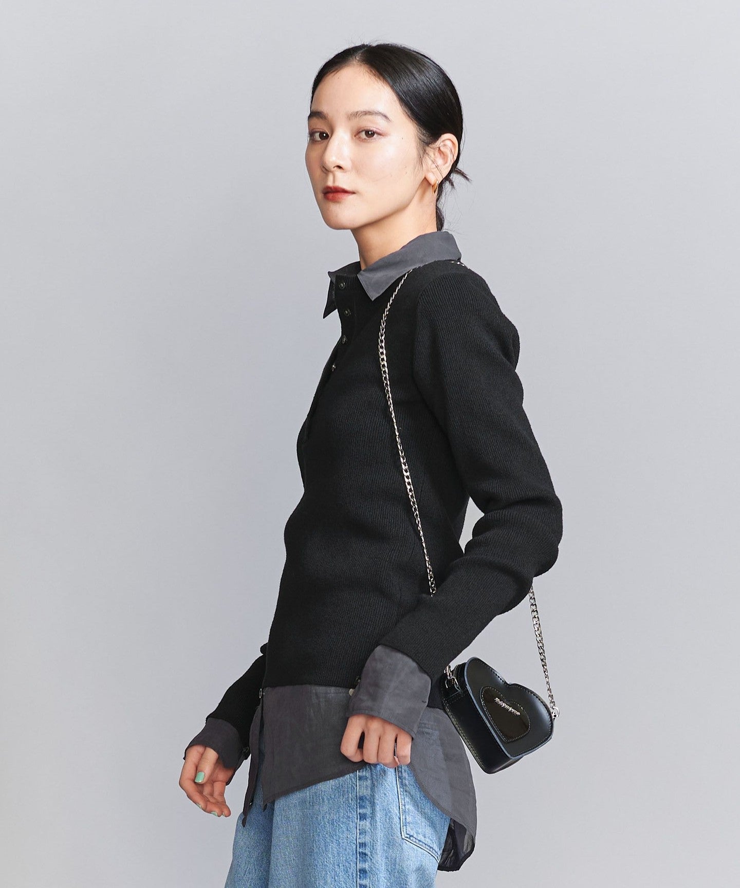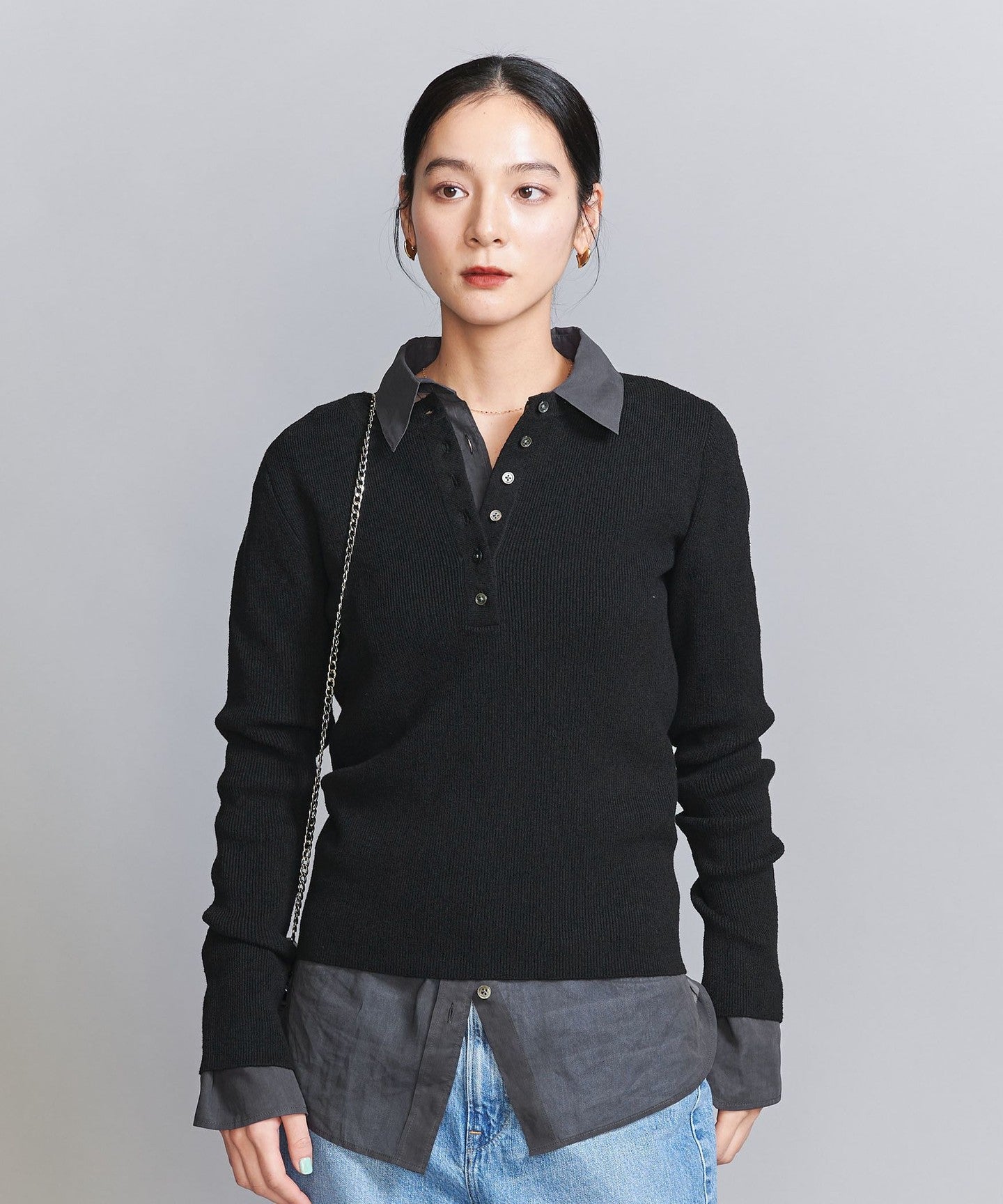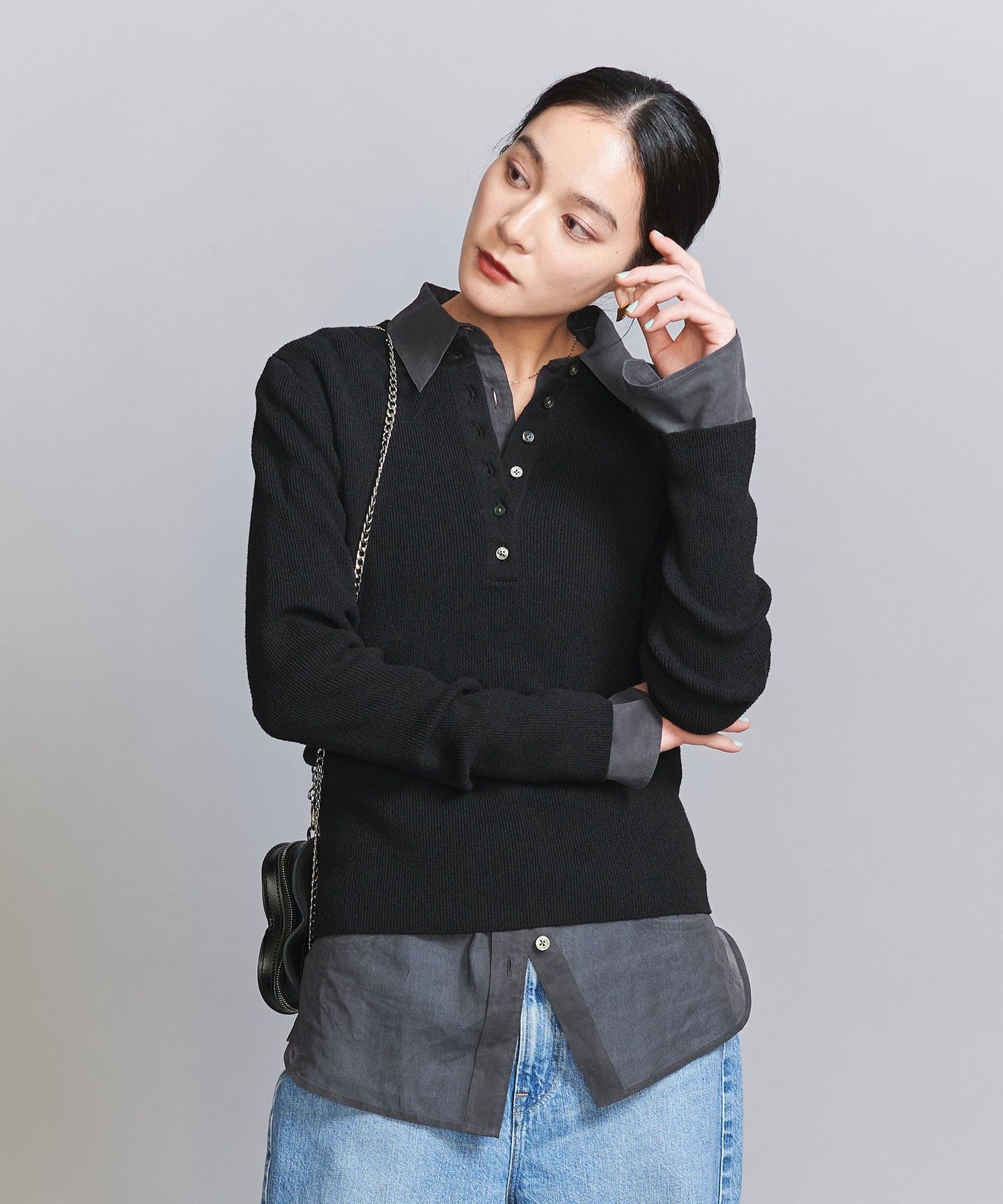 A compact silhouette is the current trend. This Henley knit can be worn on its own or layered.