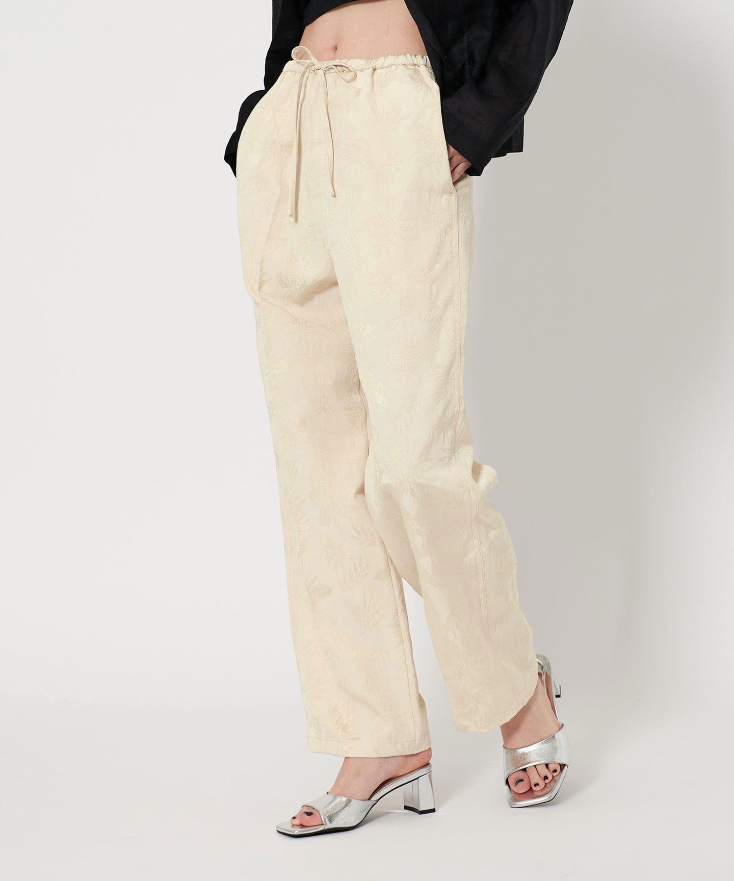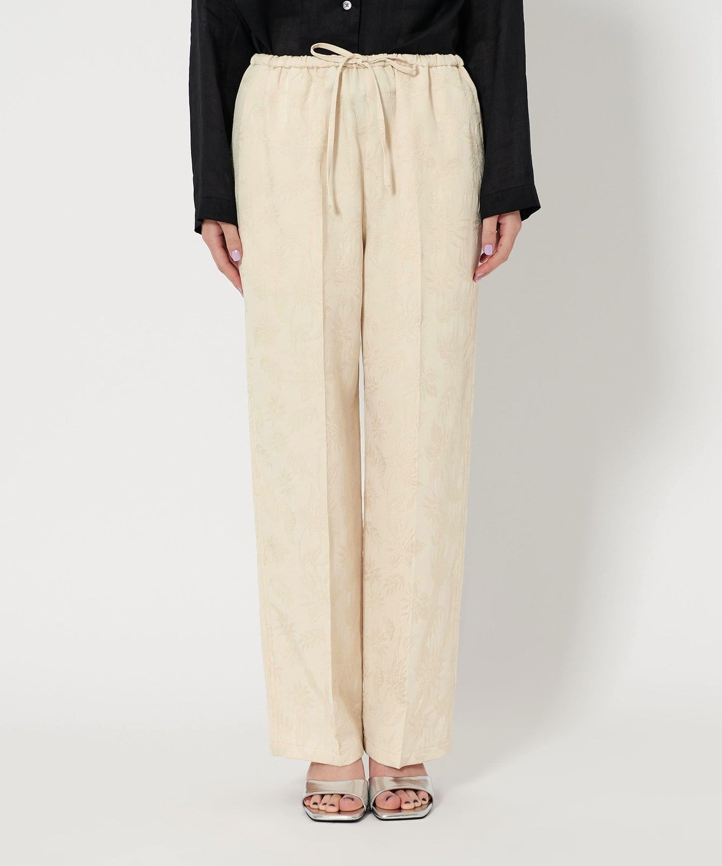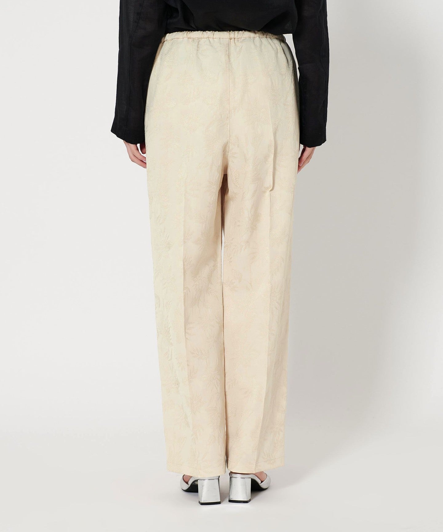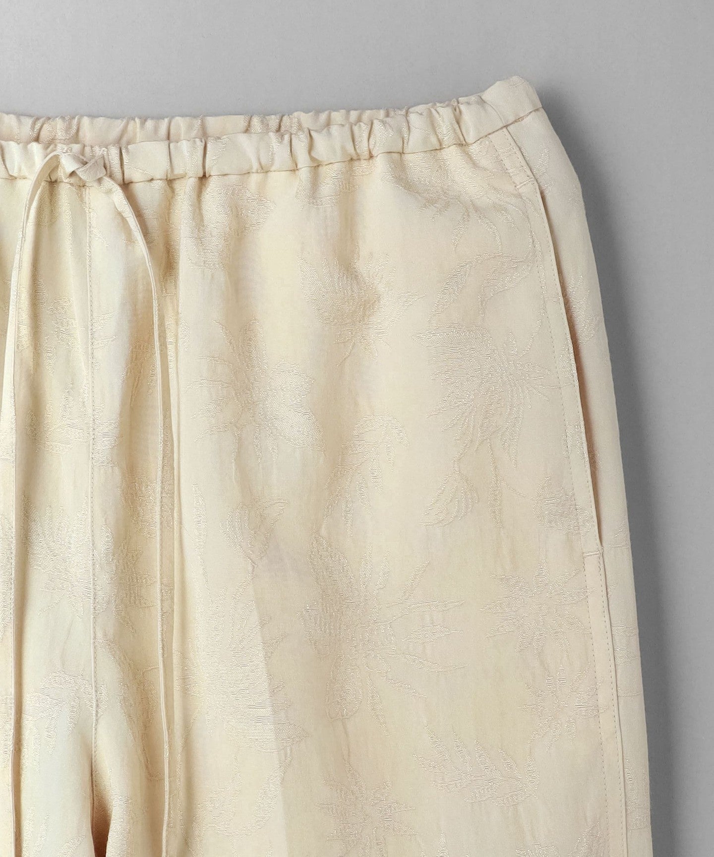 These jacquard pants feature a floral pattern made with bright rayon yarn, giving them an elegant sheen.