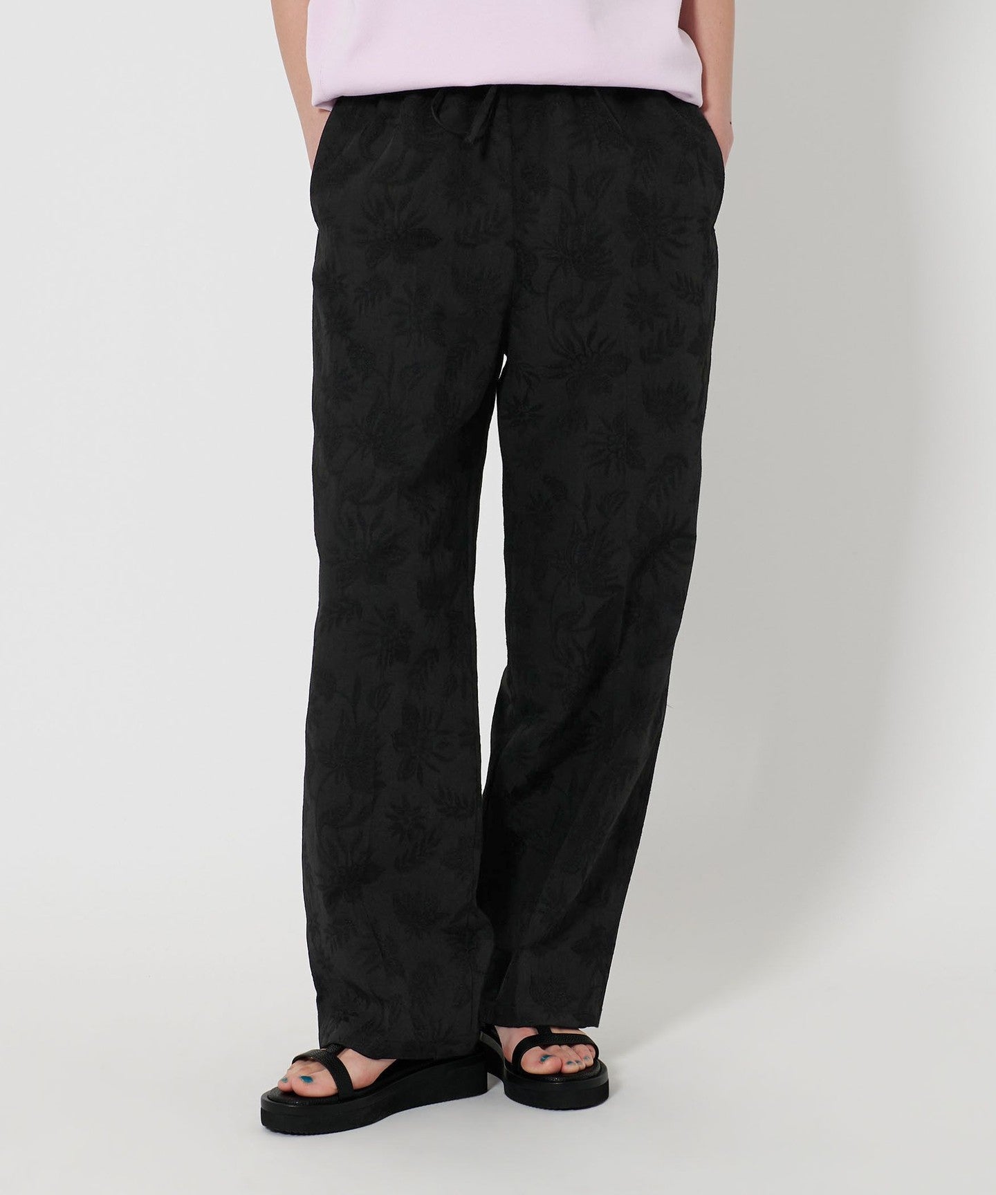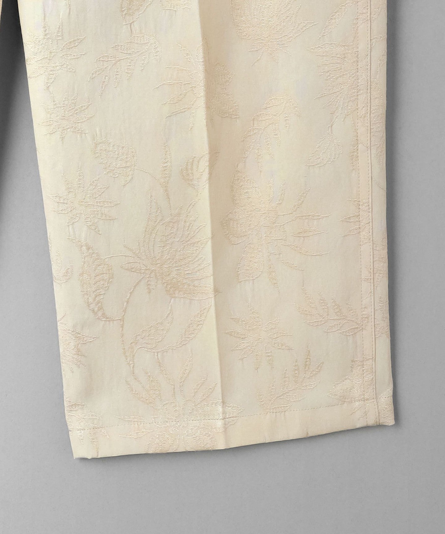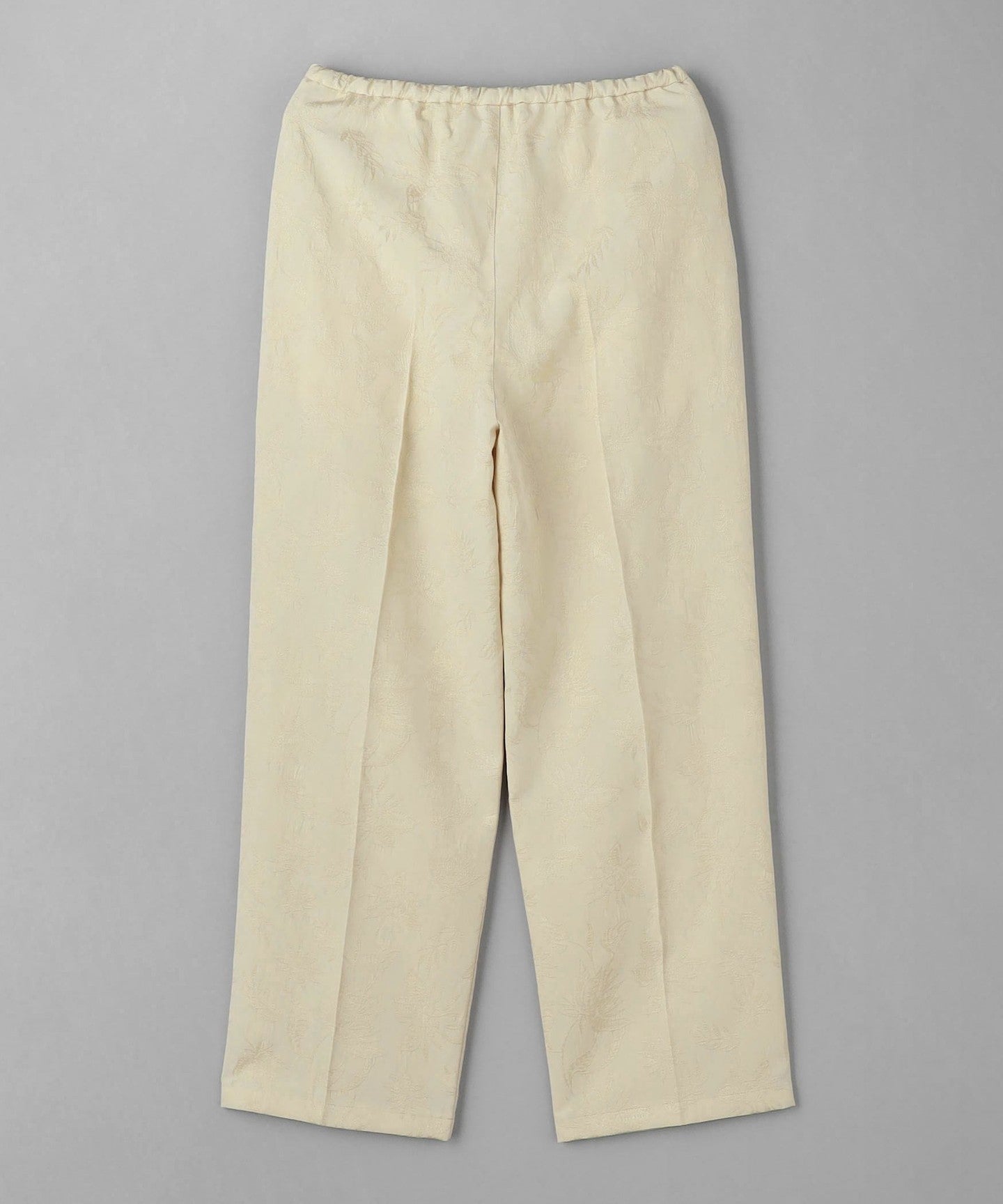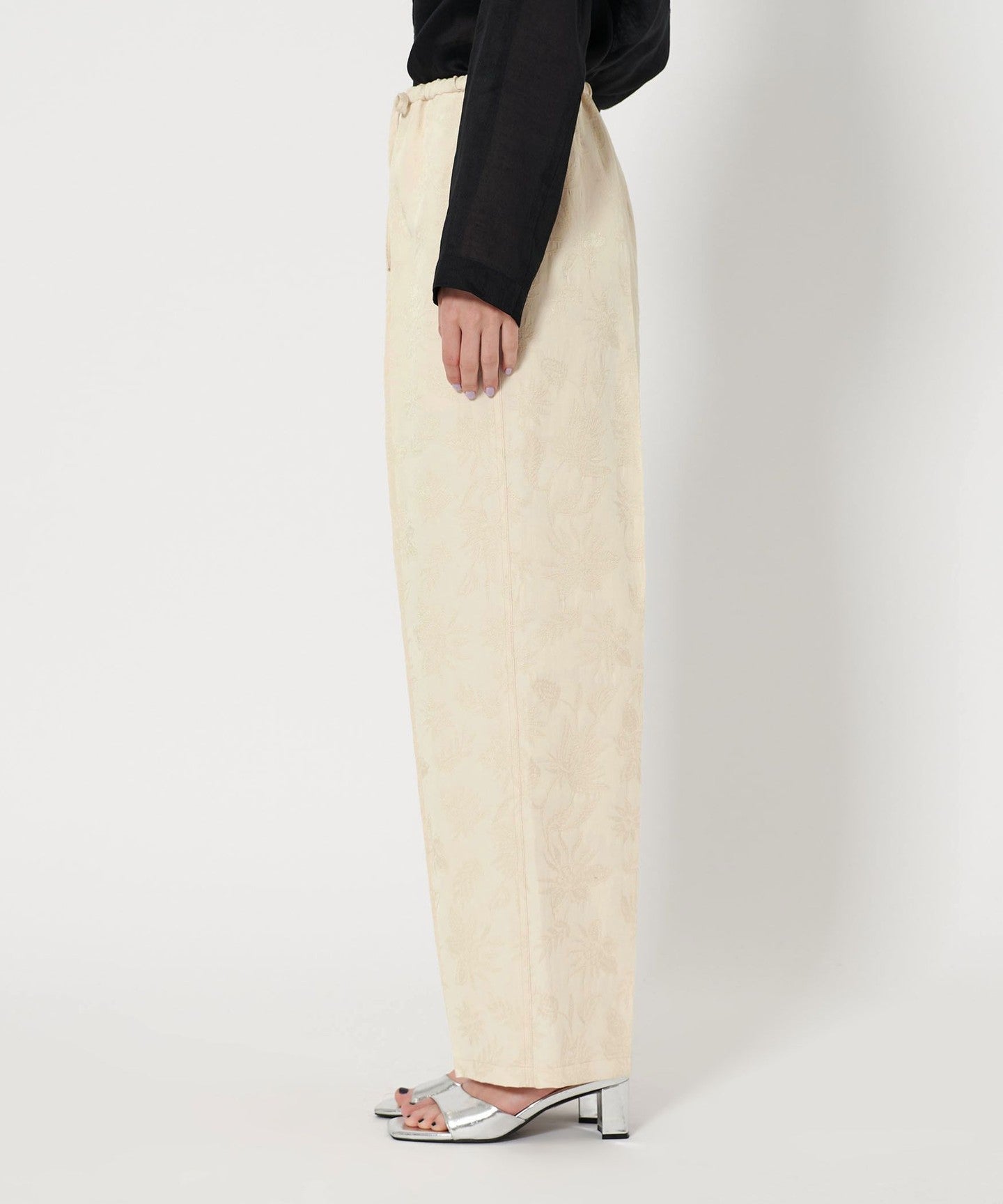 These jacquard pants feature a floral pattern made with bright rayon yarn, giving them an elegant sheen.