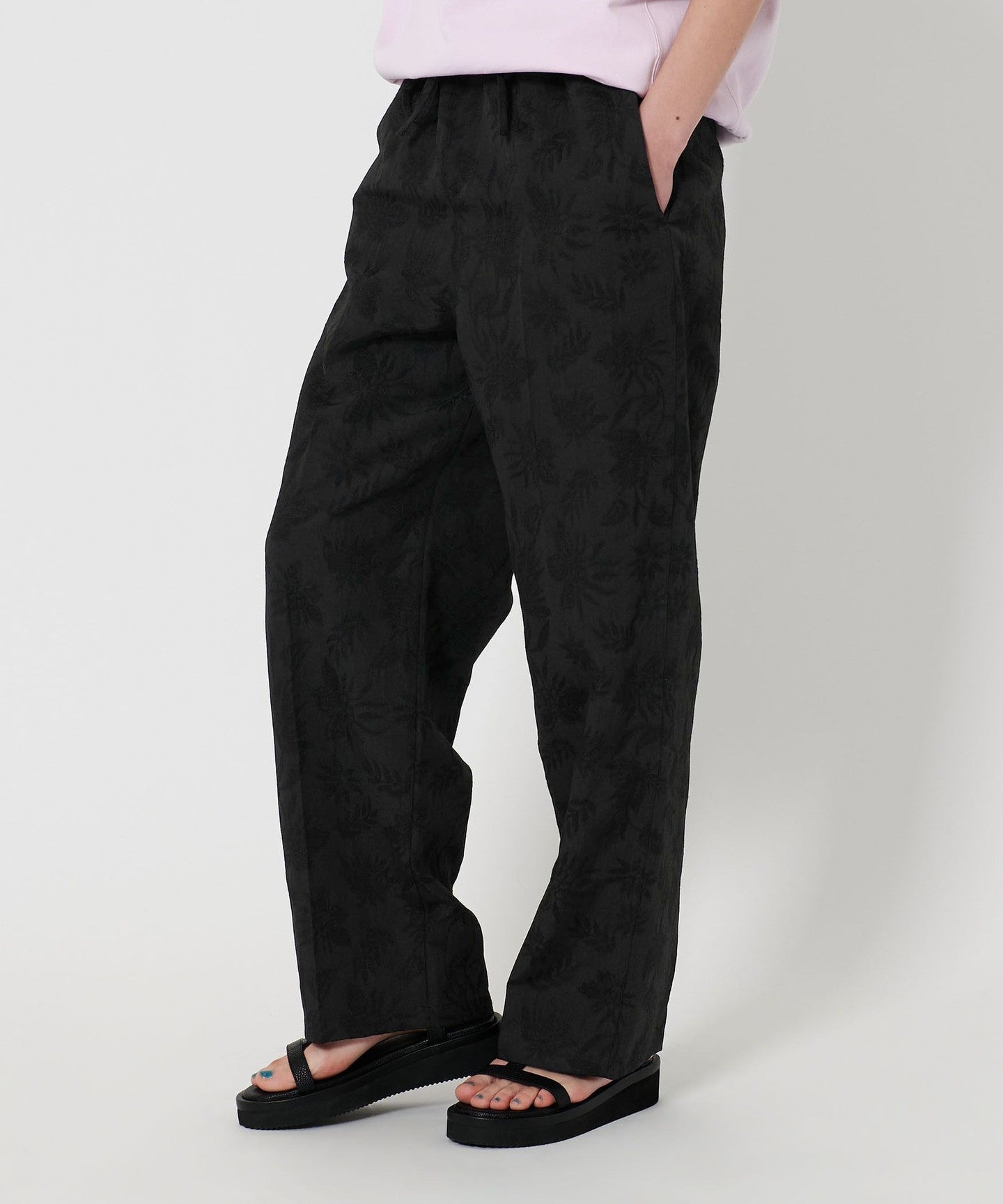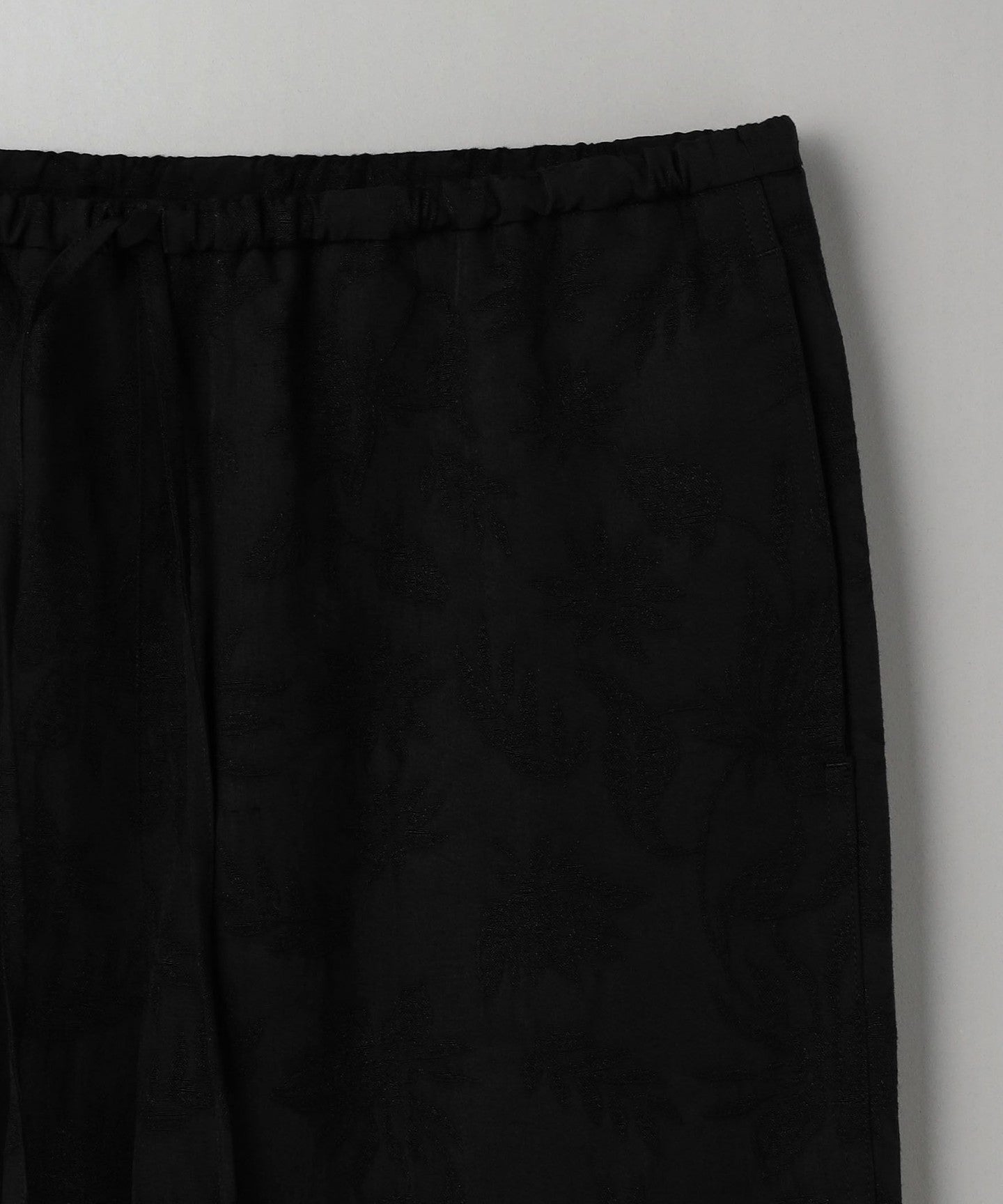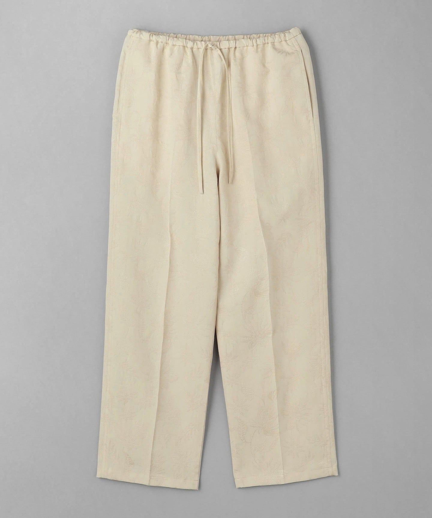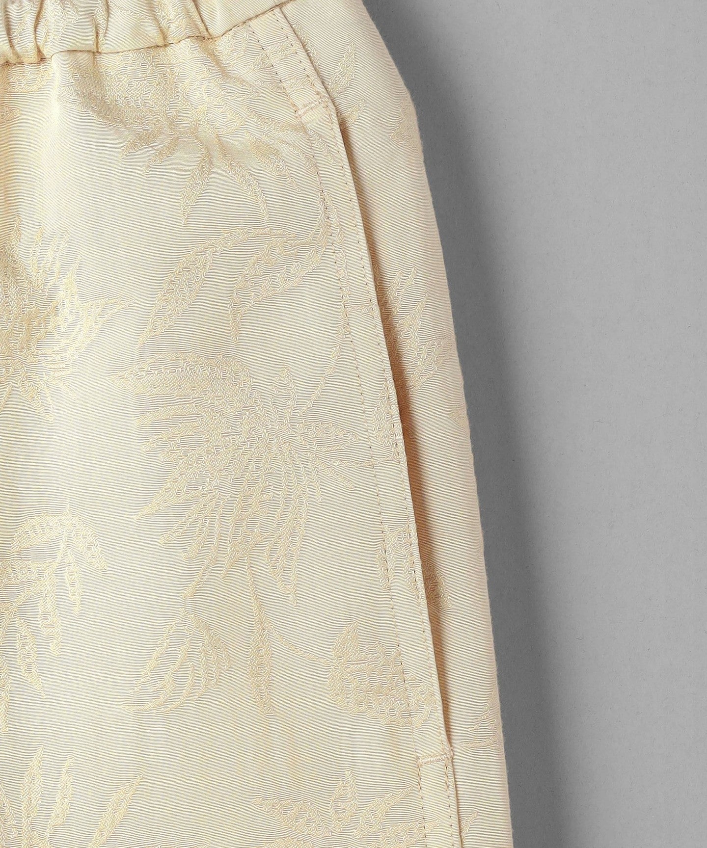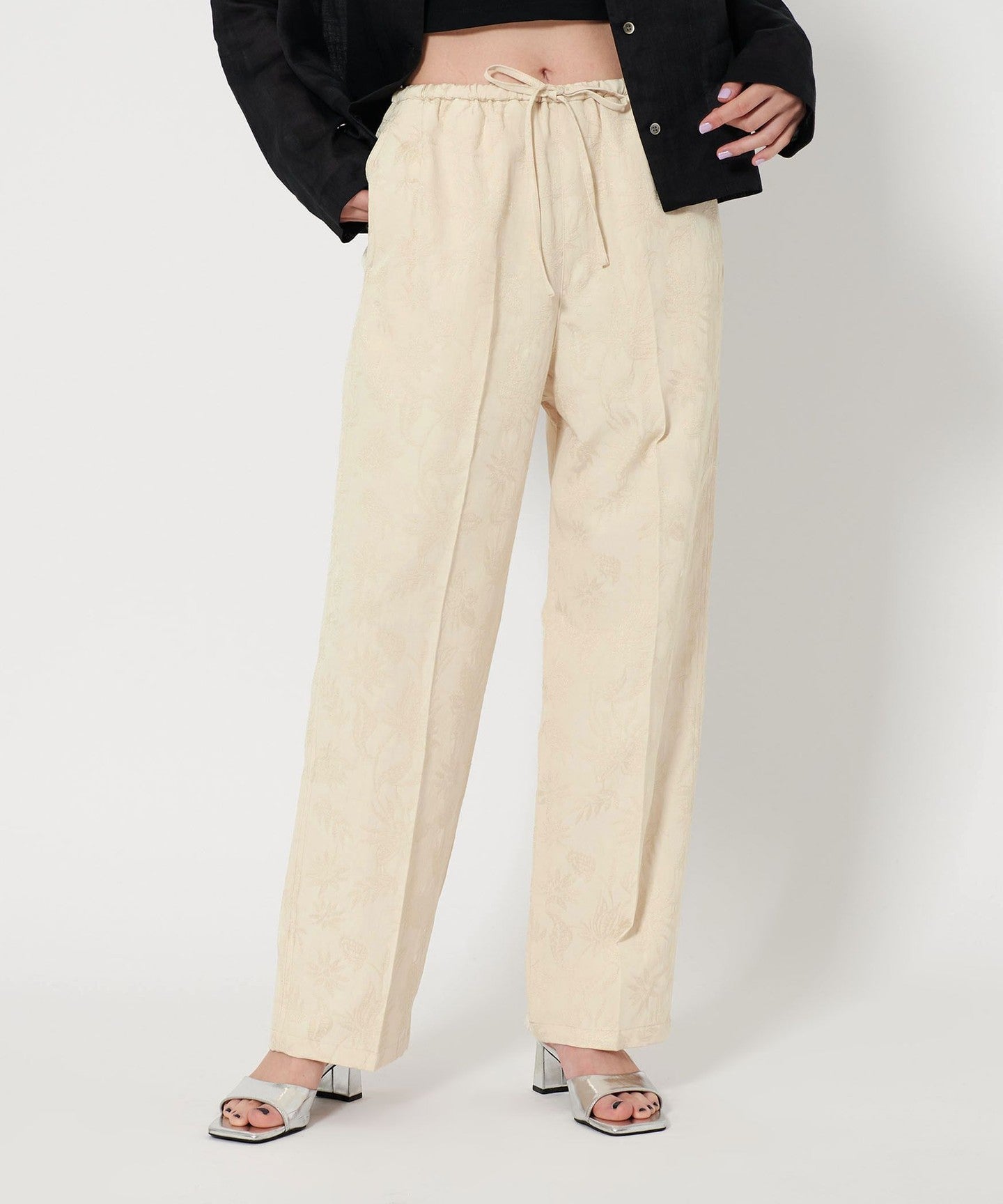 These jacquard pants feature a floral pattern made with bright rayon yarn, giving them an elegant sheen.
