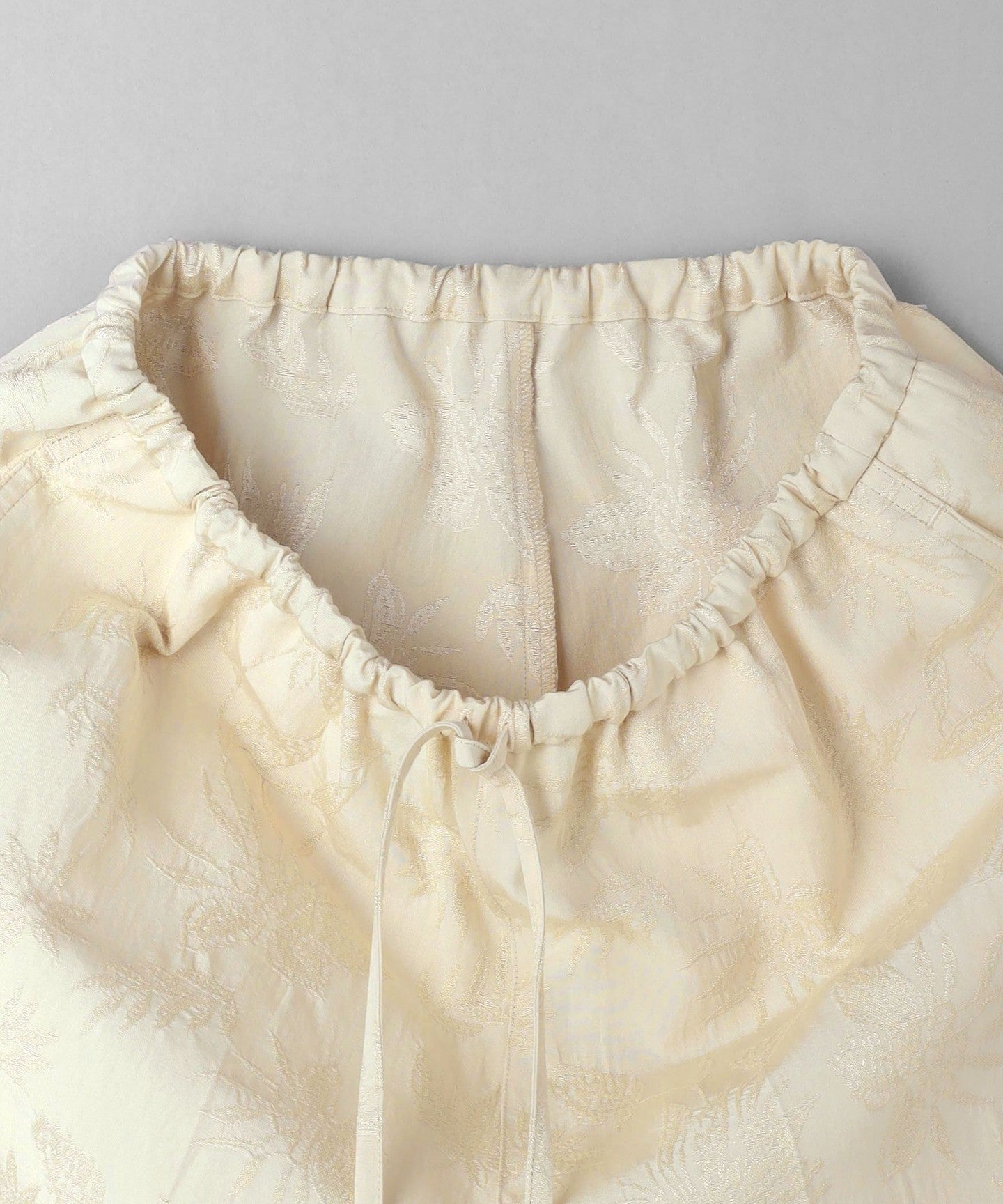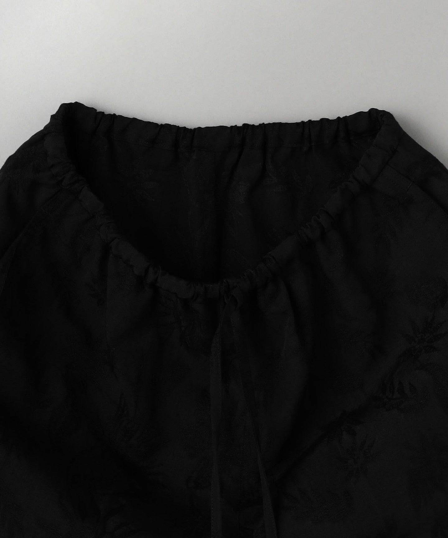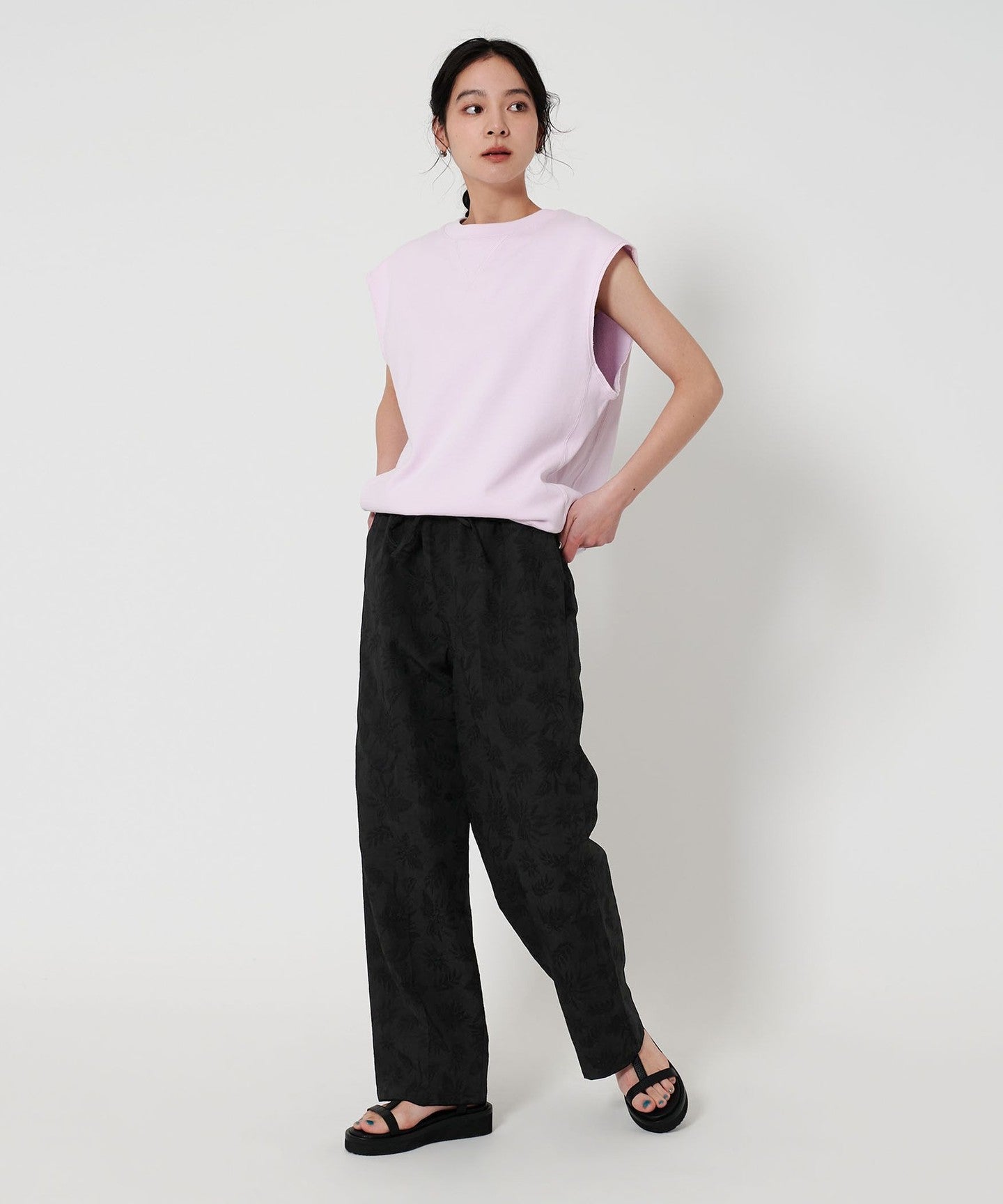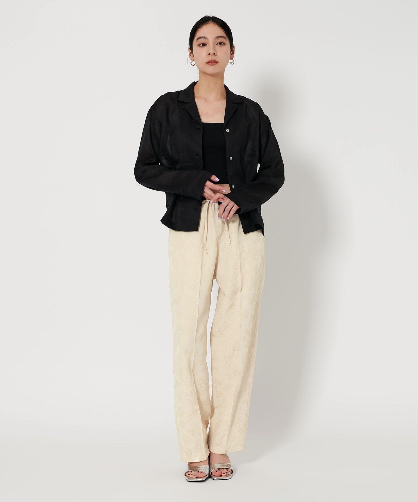 These jacquard pants feature a floral pattern made with bright rayon yarn, giving them an elegant sheen.
