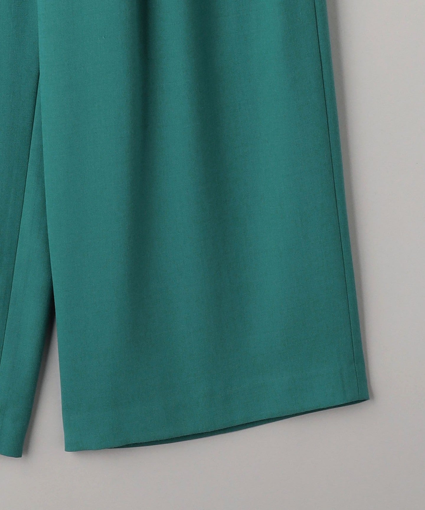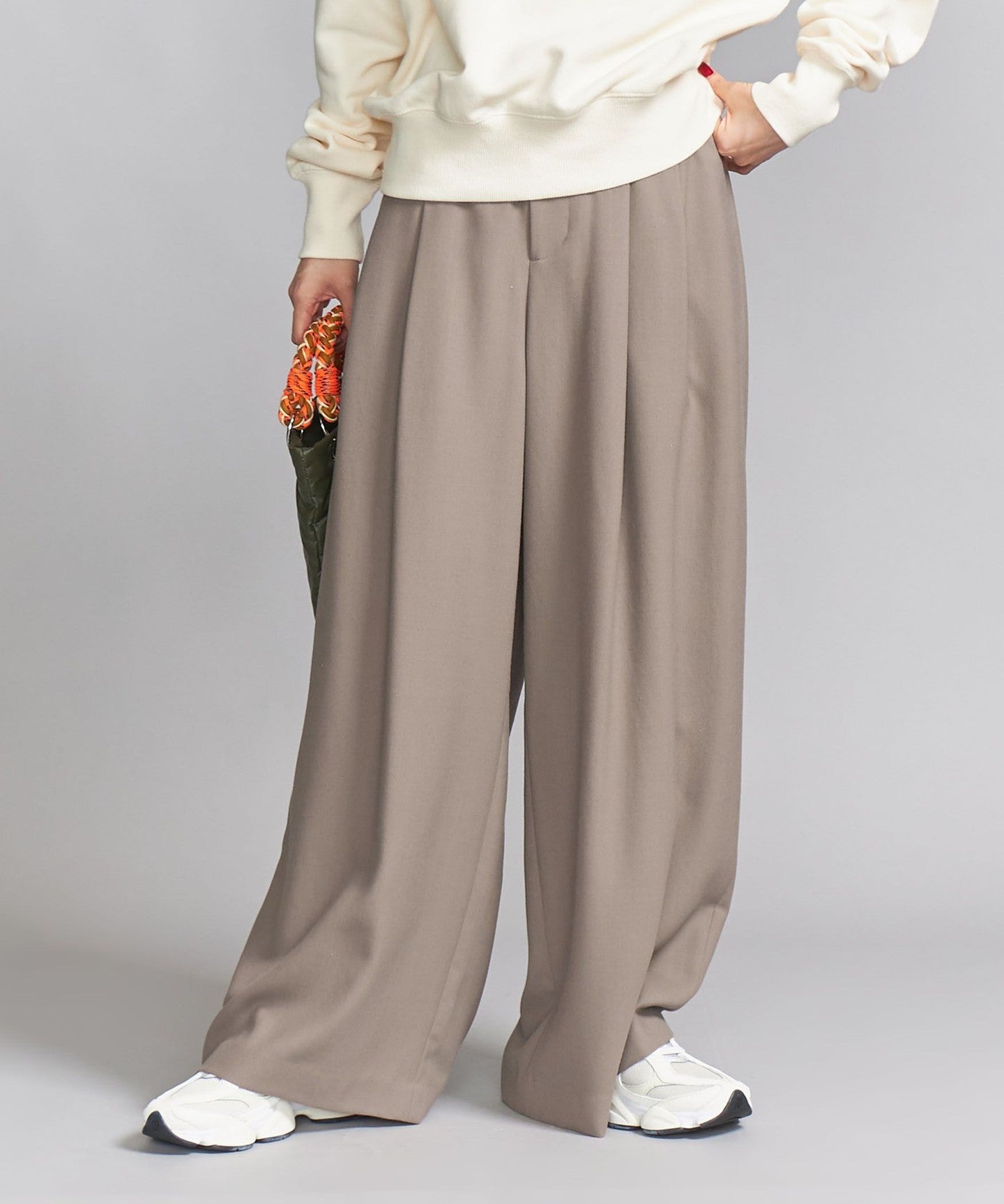 Thick wide pants with two pleats at the waist.