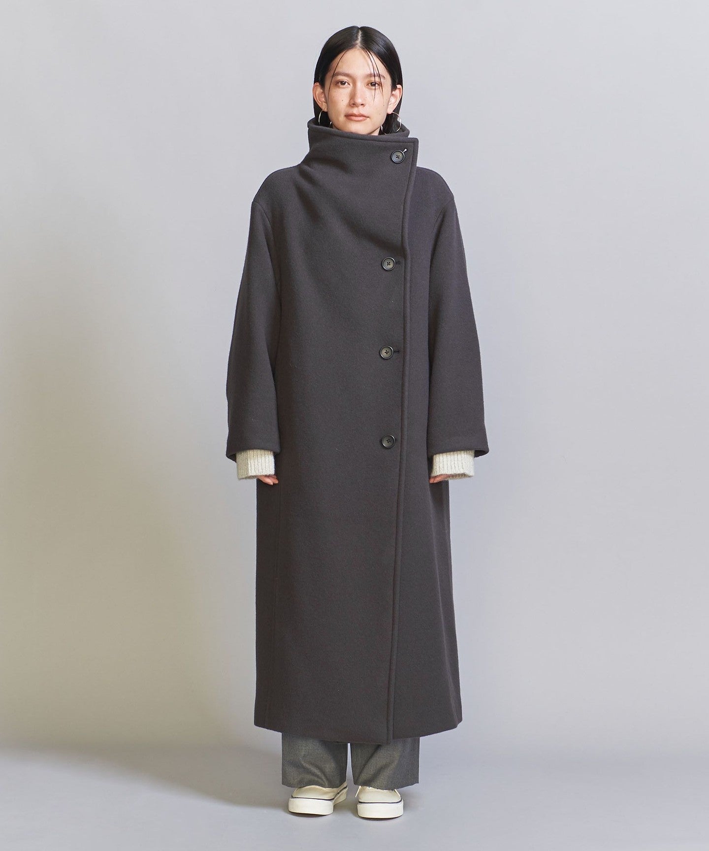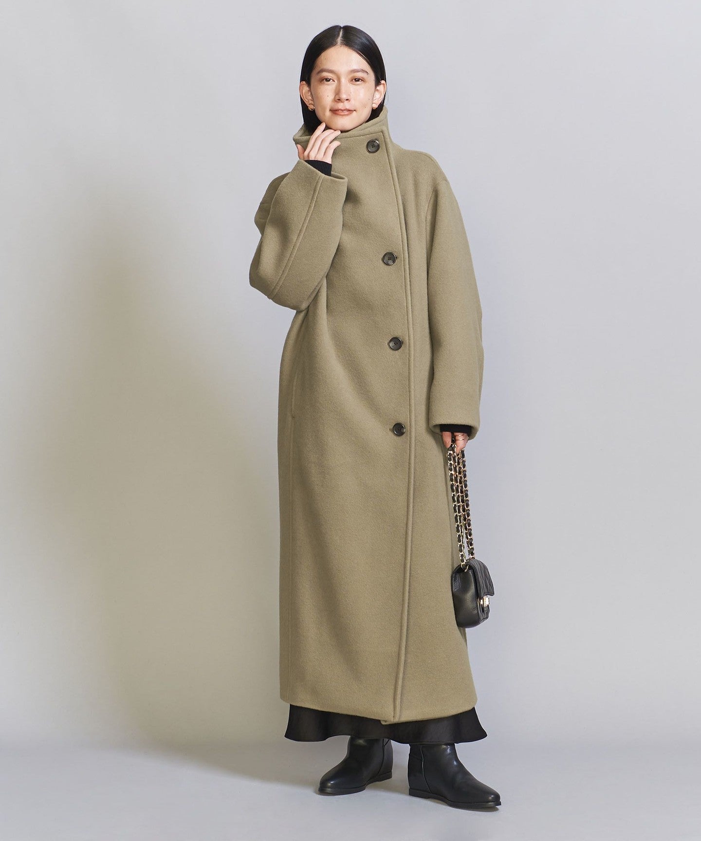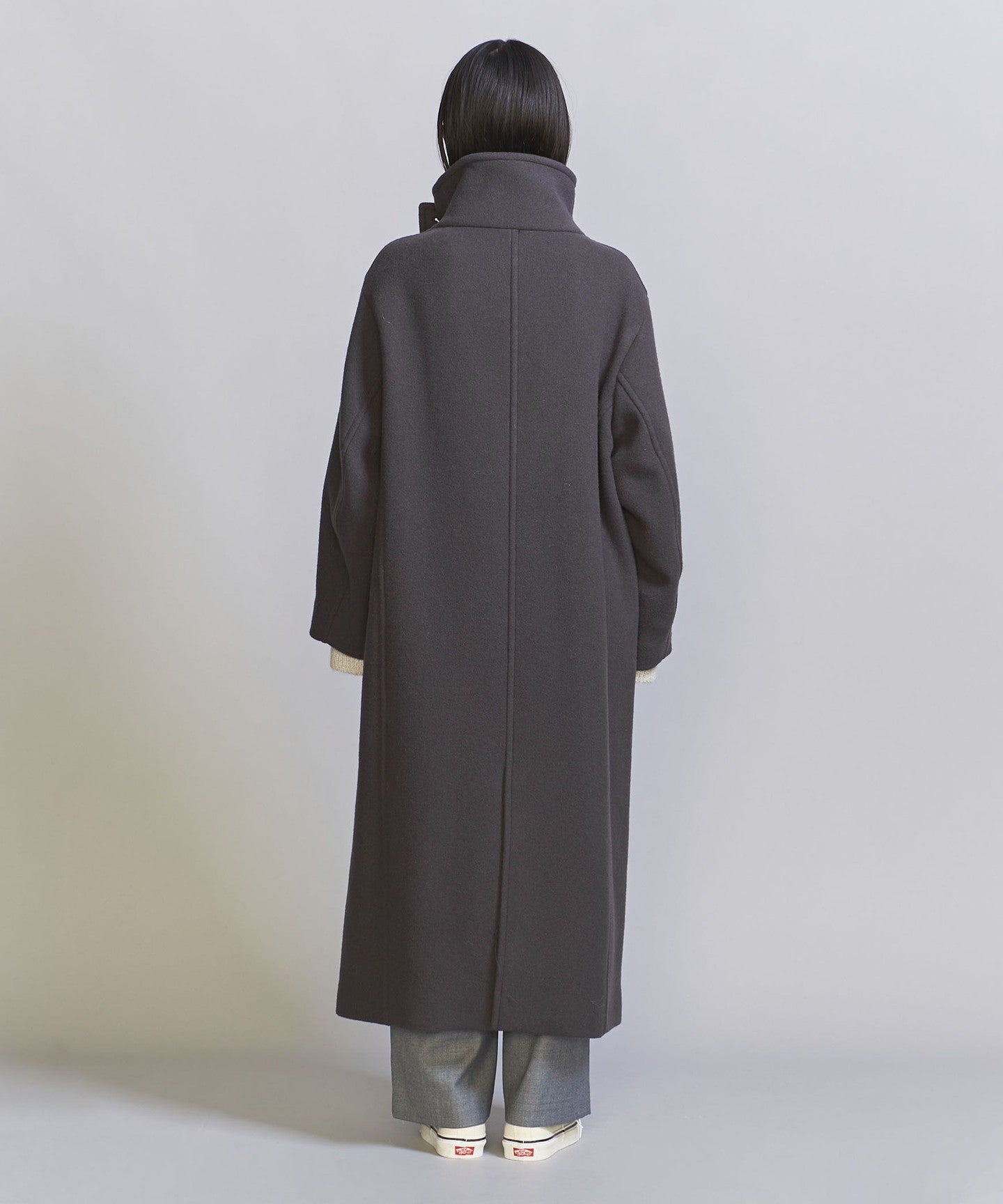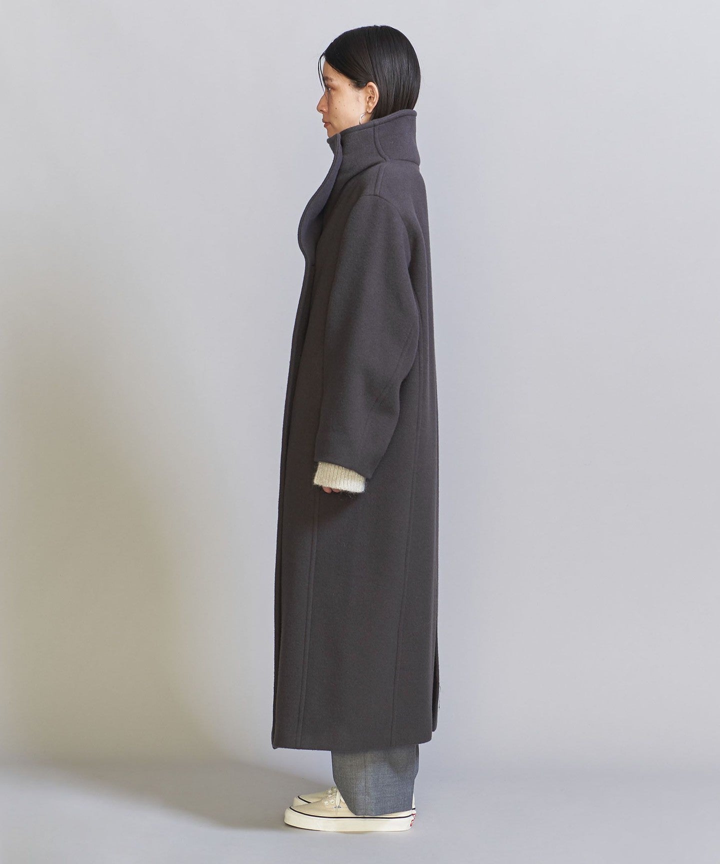 A long stand-up collar that exudes a trendy vibe