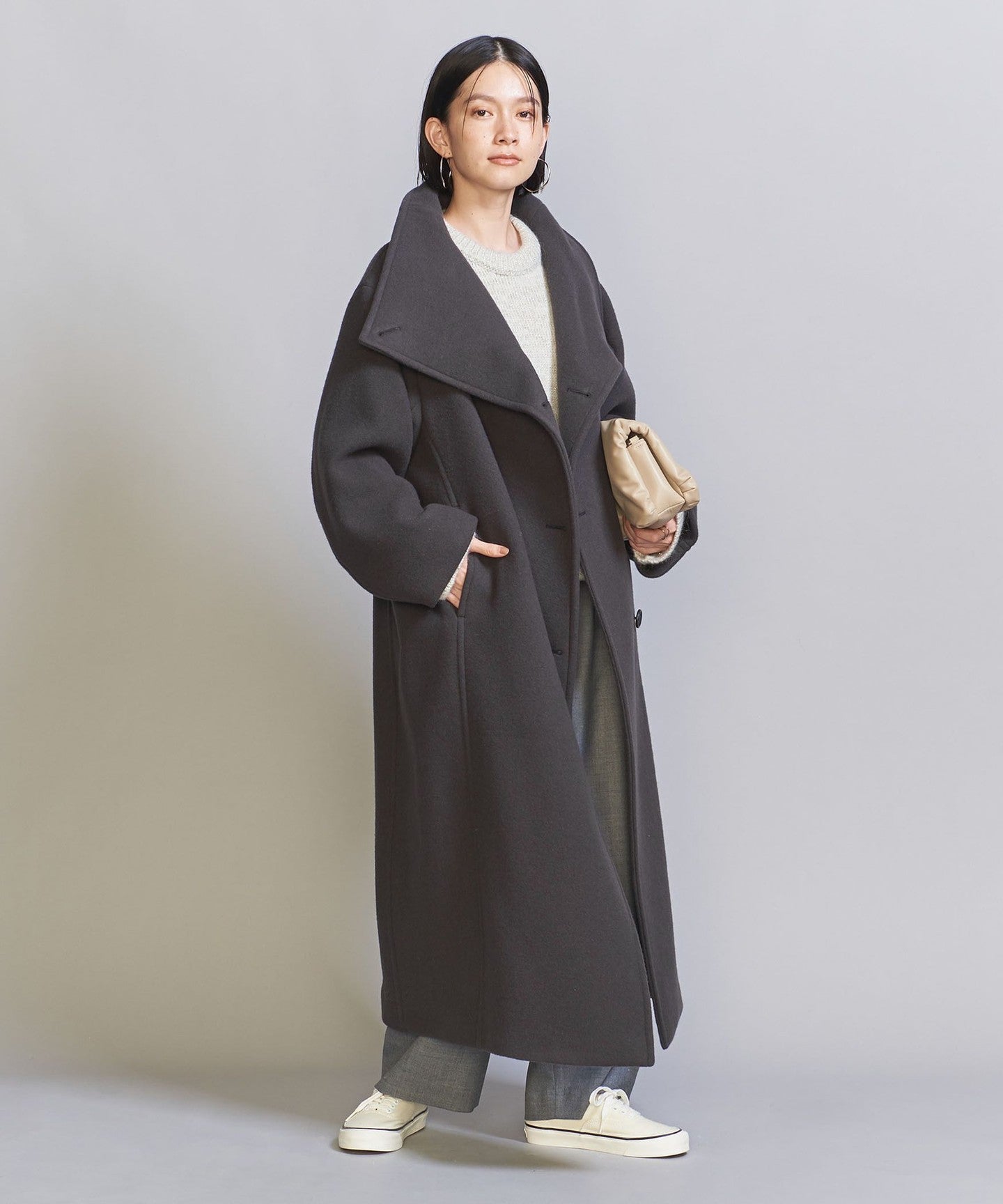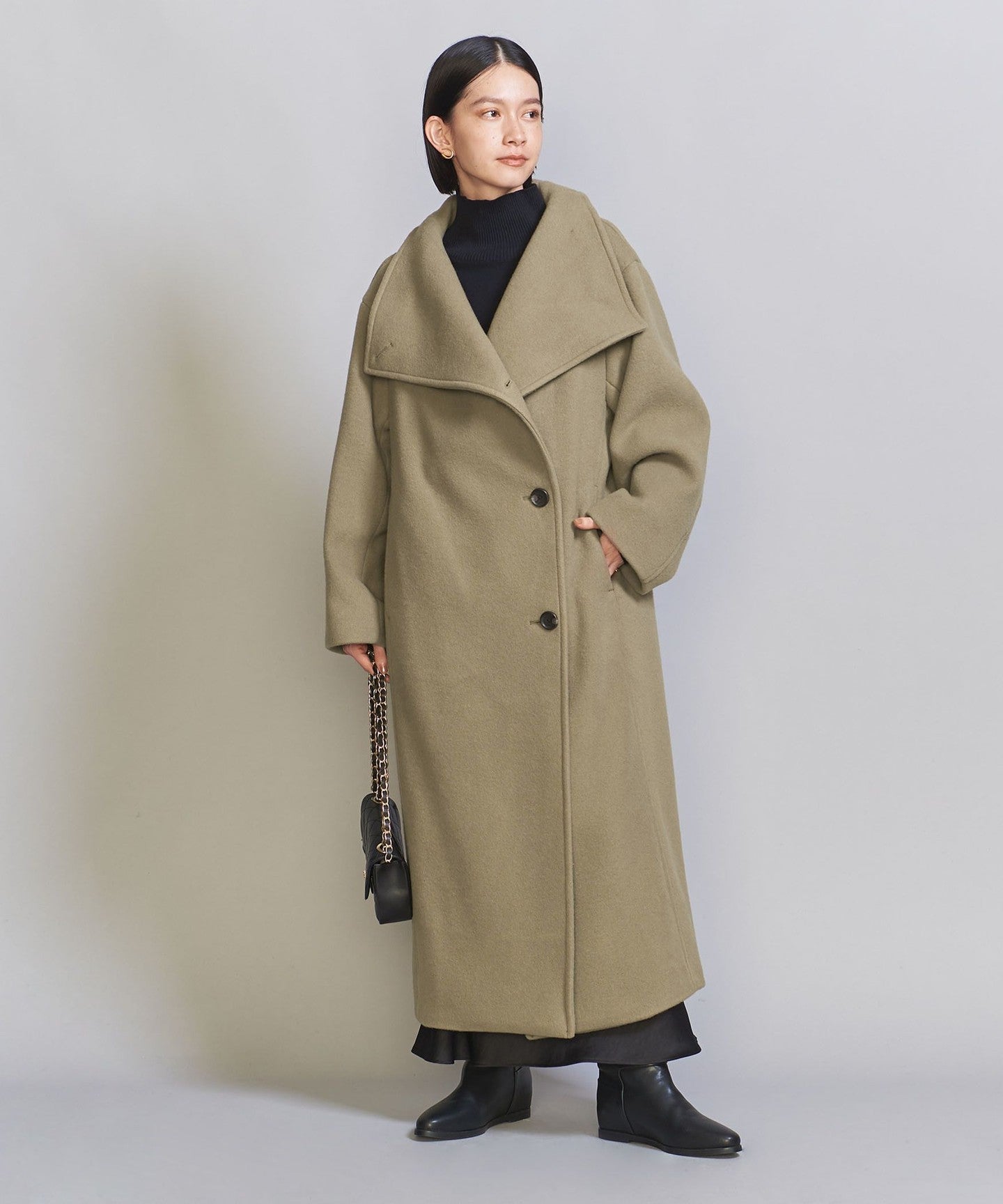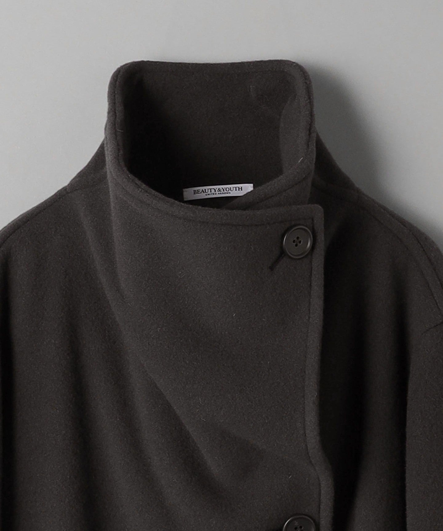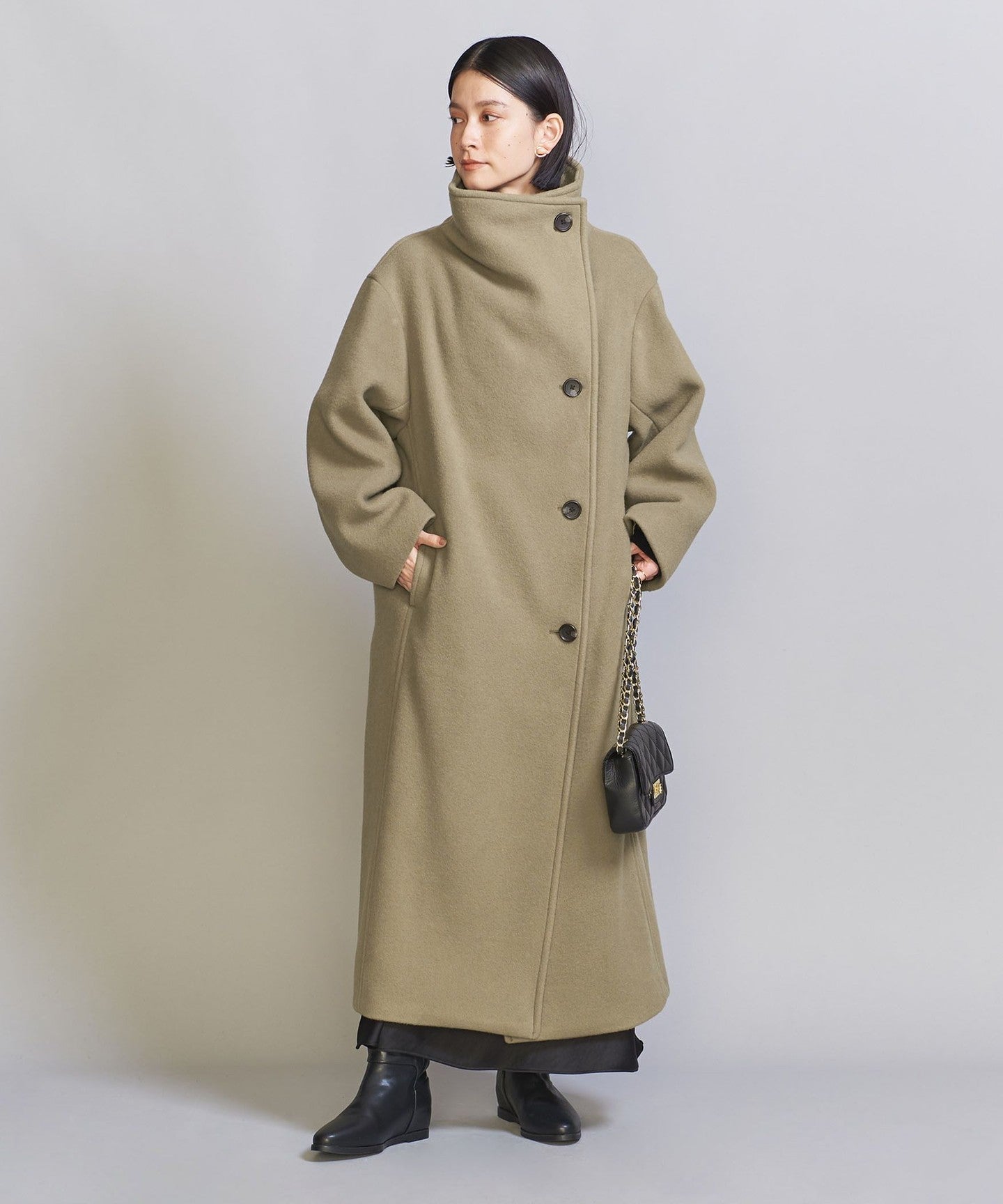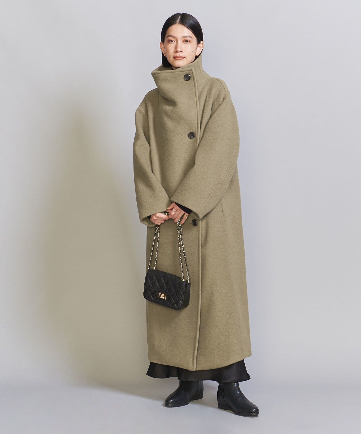 A long stand-up collar that exudes a trendy vibe