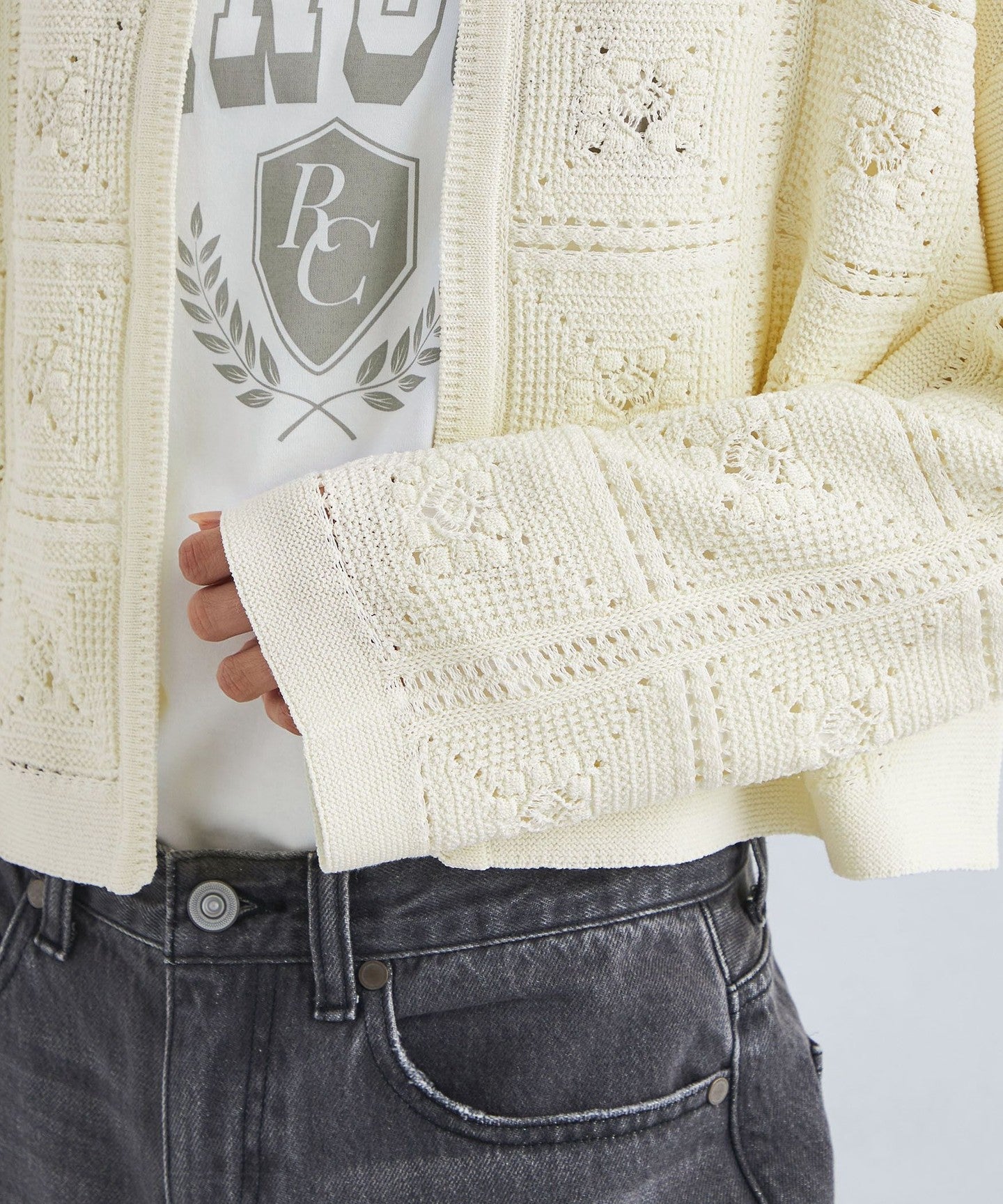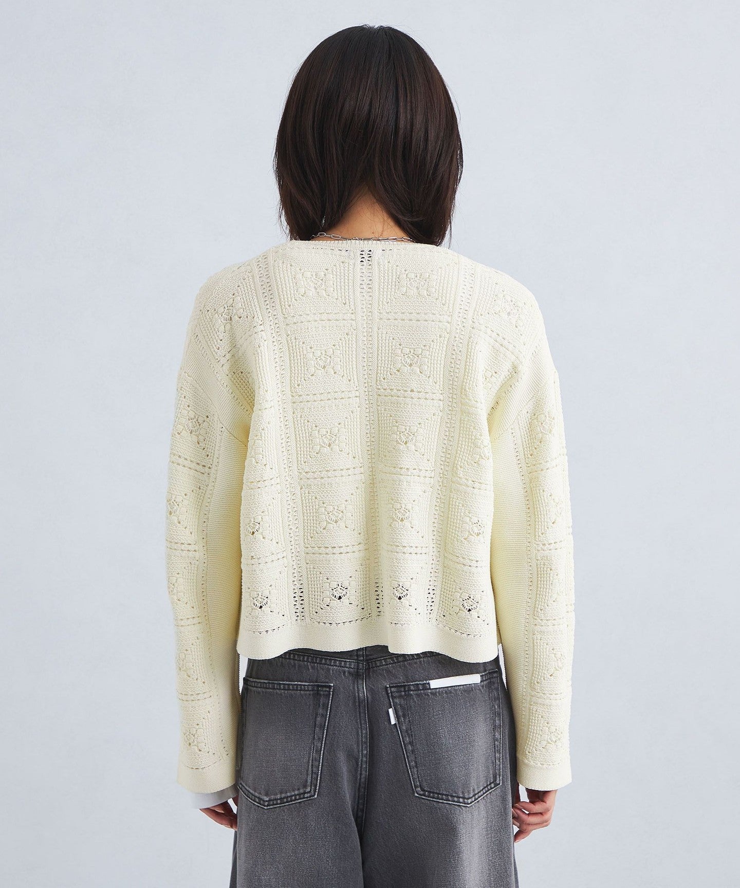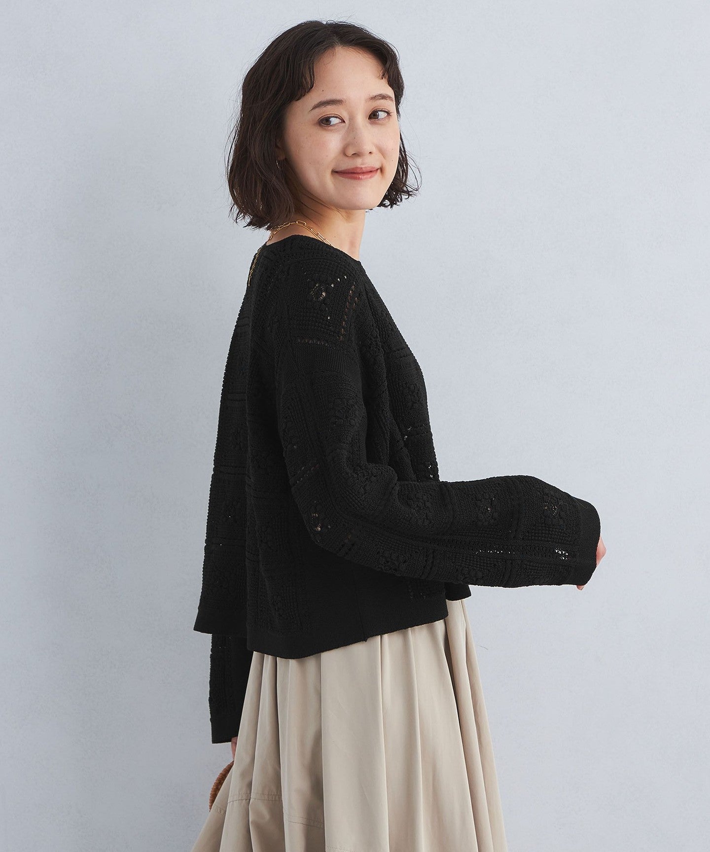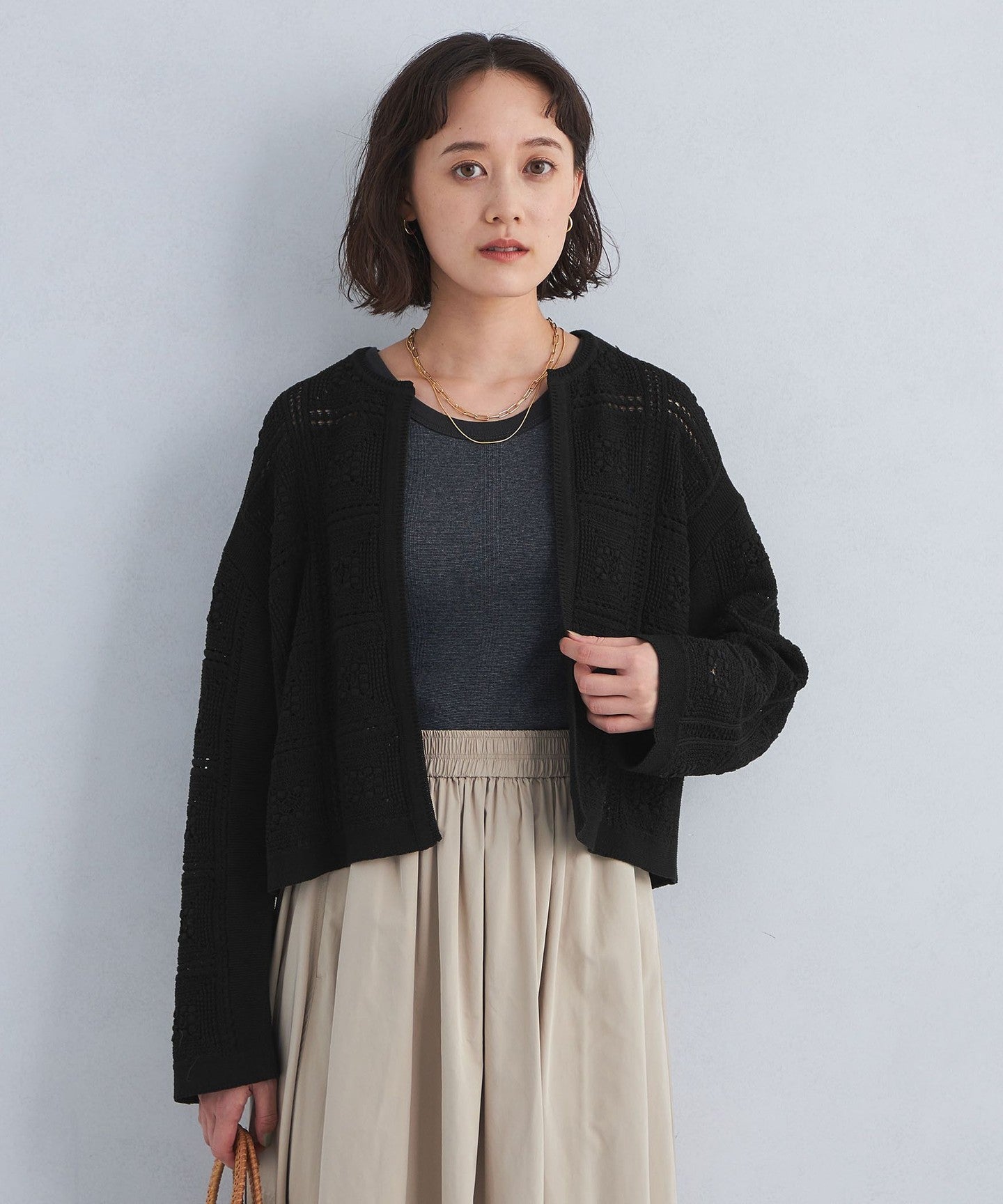 A crocheted knit cardigan that adds a casual touch to your outfit.