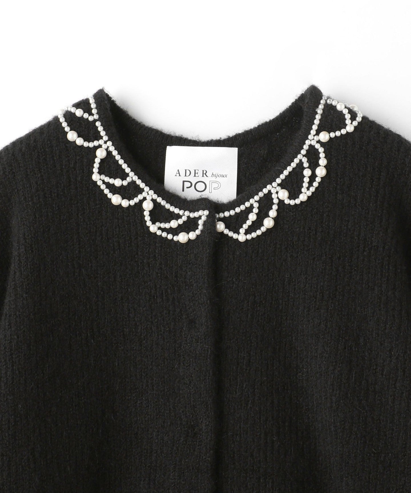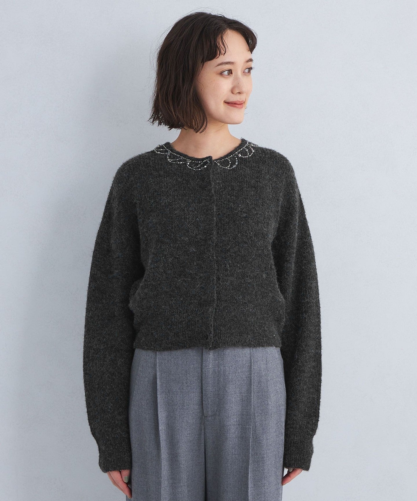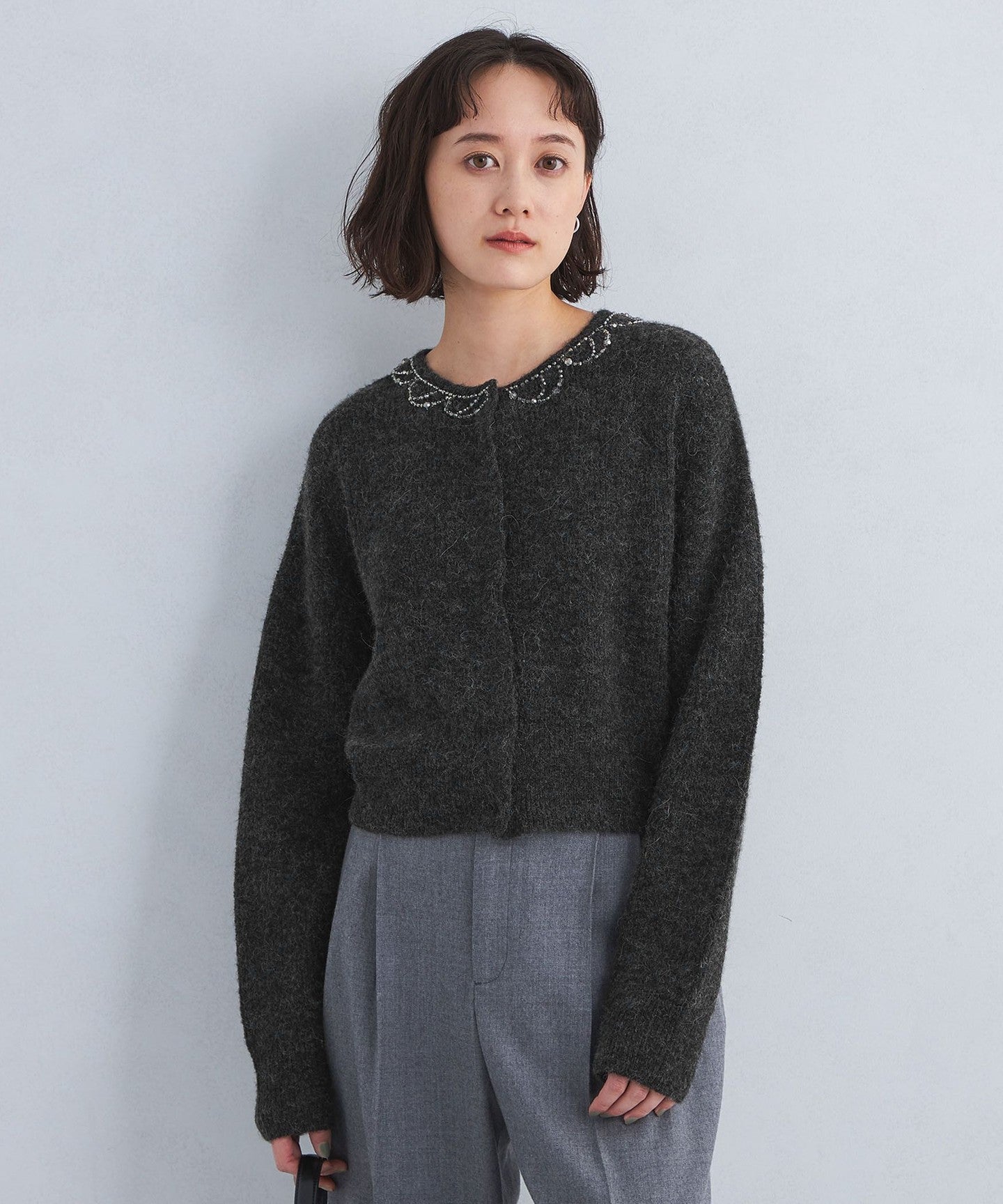 The off-white and black cardigans are decorated with fake pearls at the collar, while the medium gray cardigan is decorated with jewels.