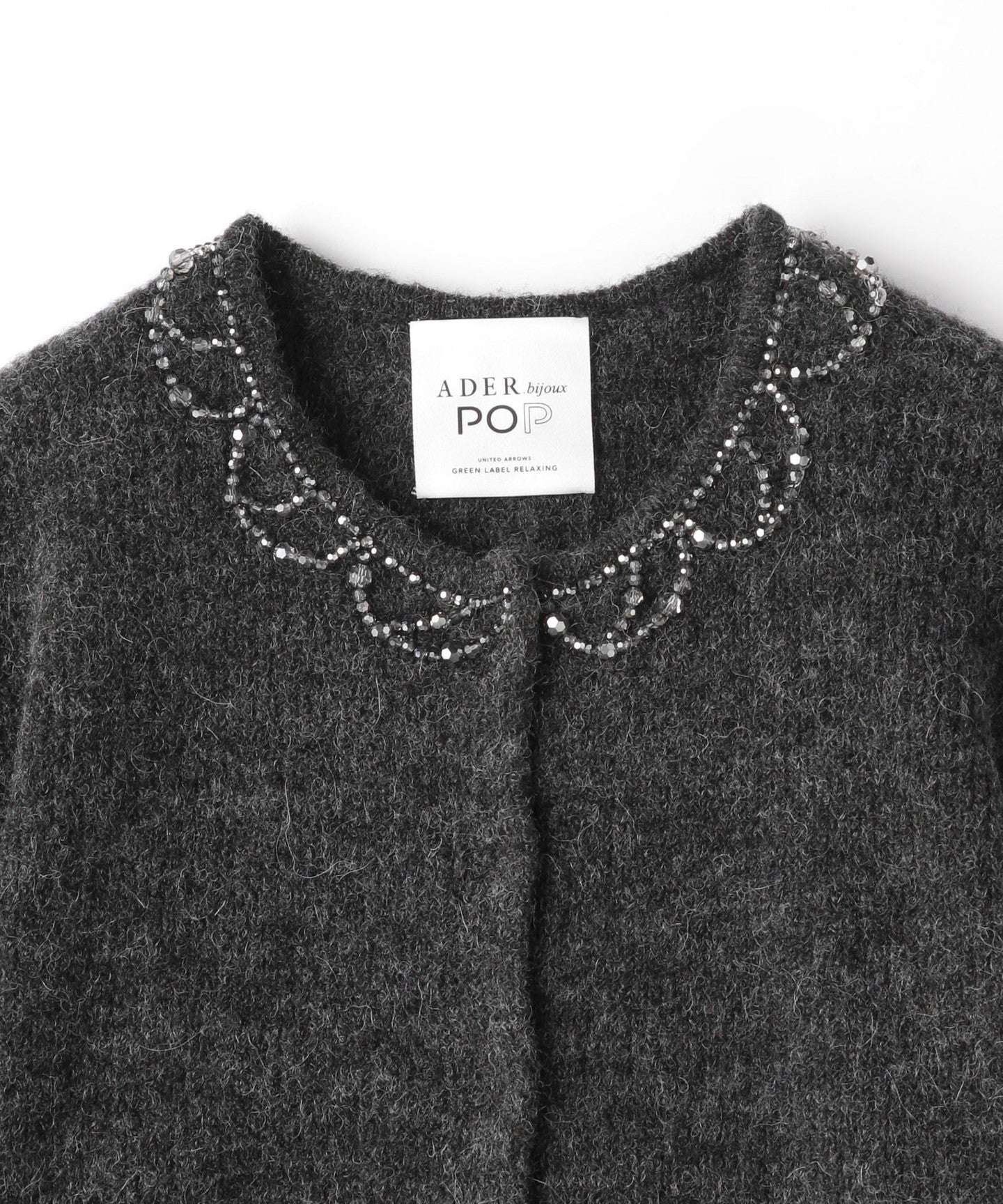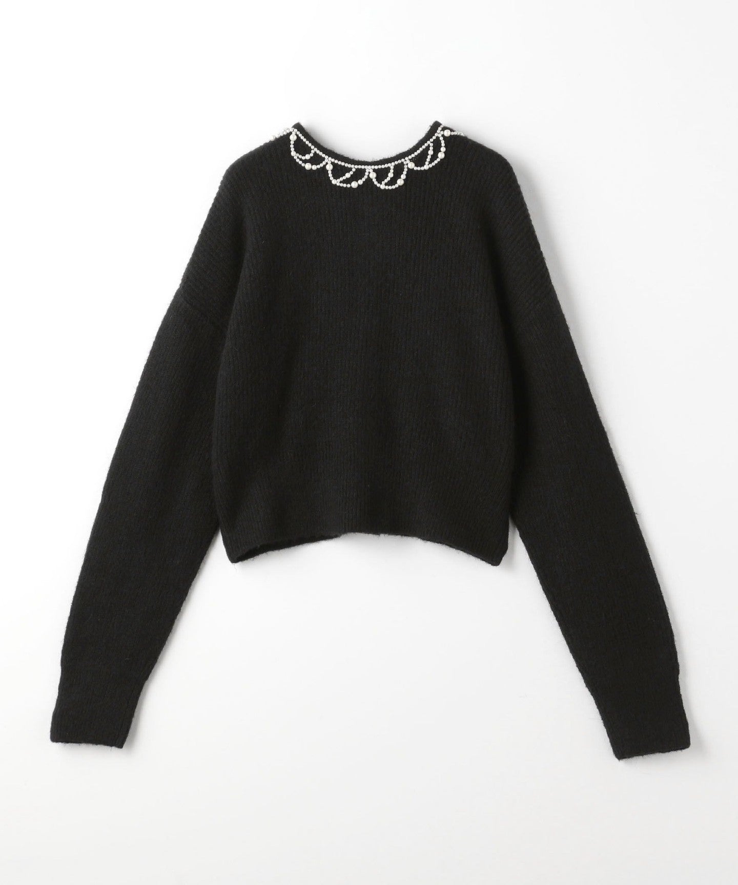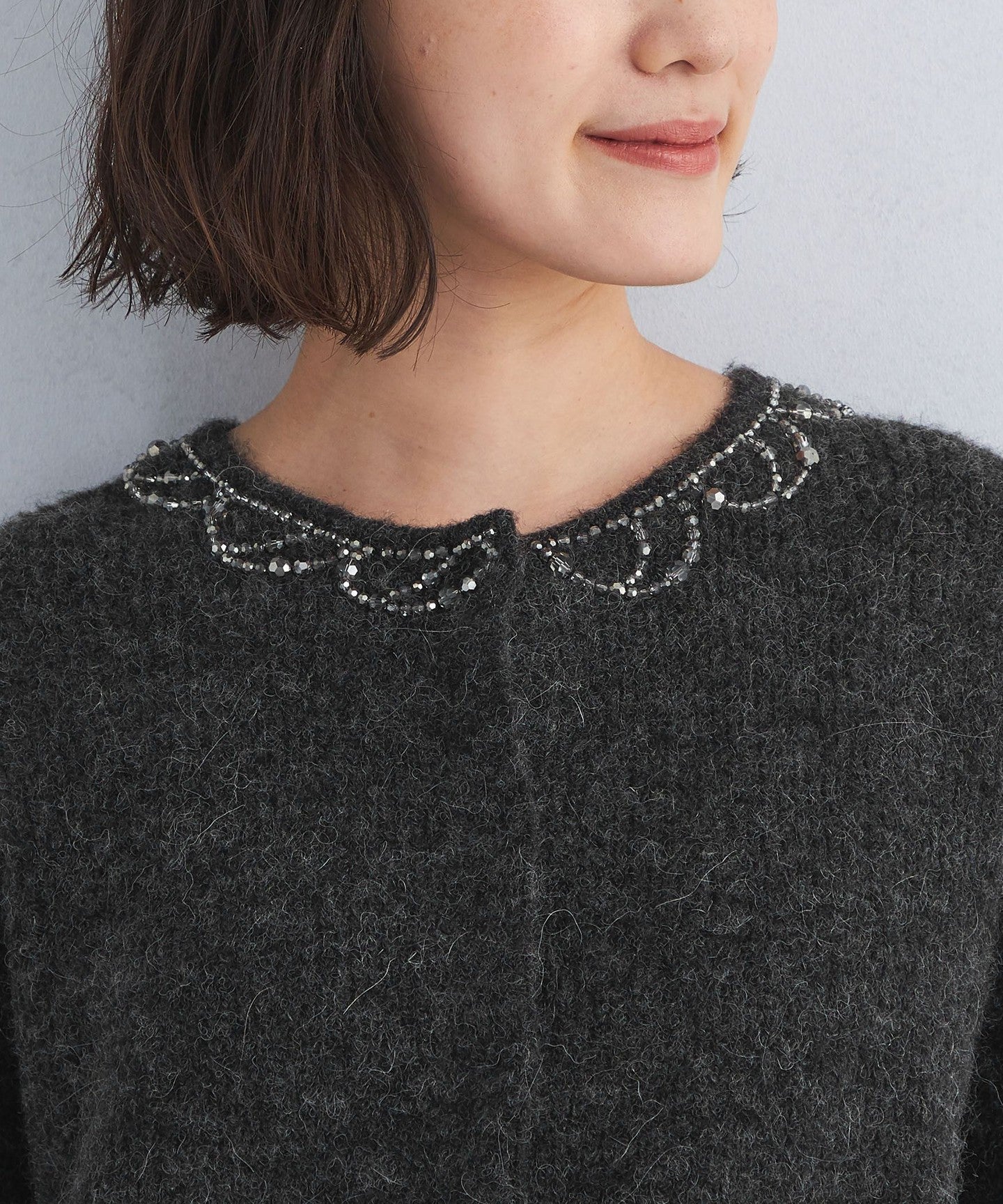 The off-white and black cardigans are decorated with fake pearls at the collar, while the medium gray cardigan is decorated with jewels.