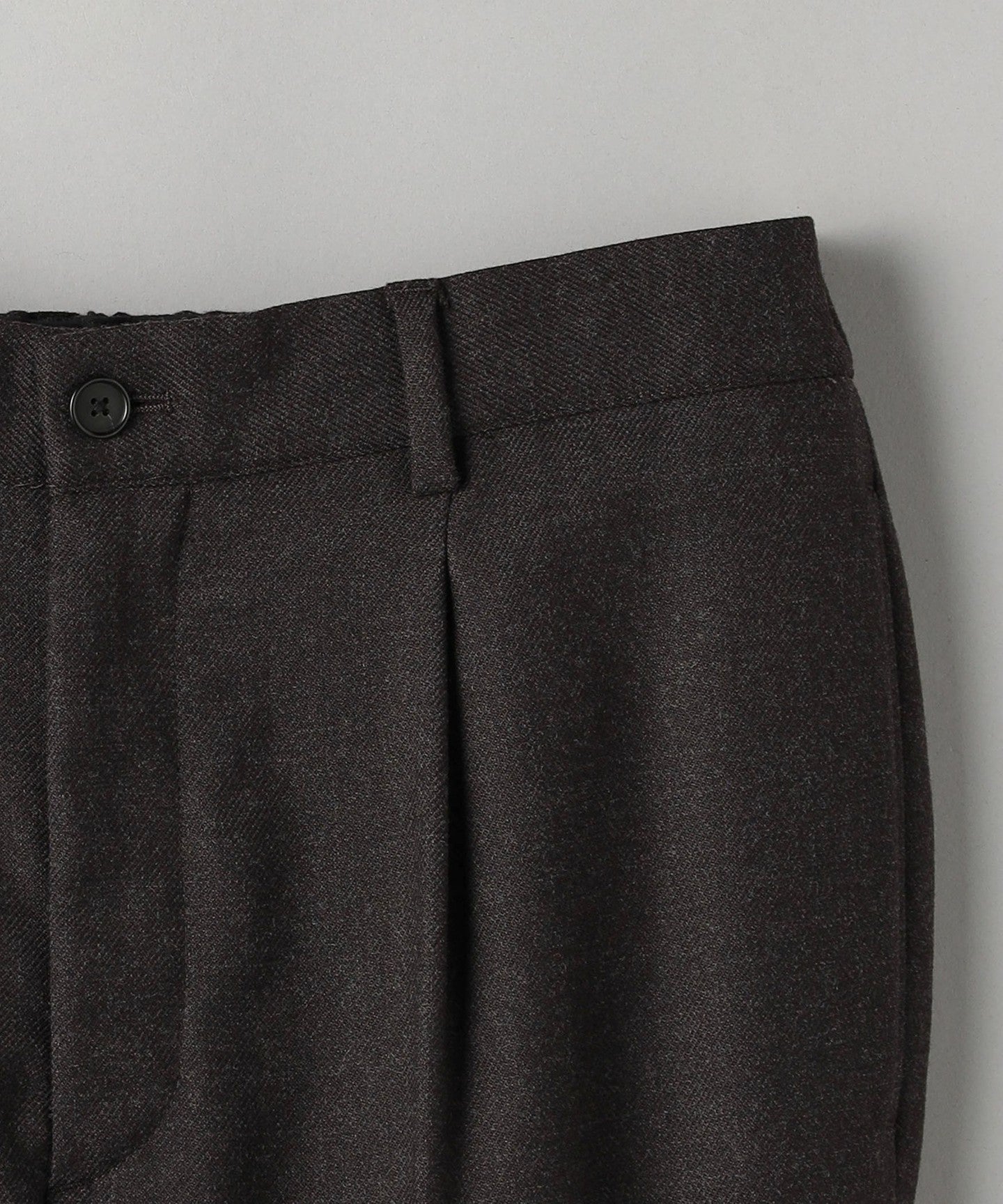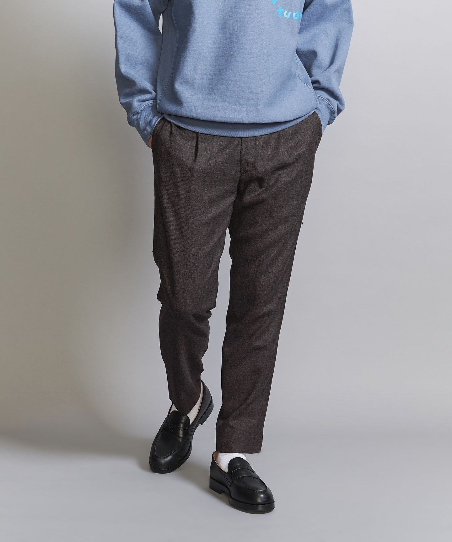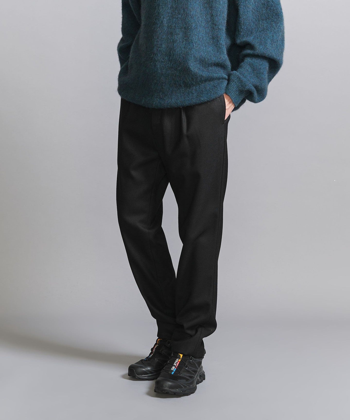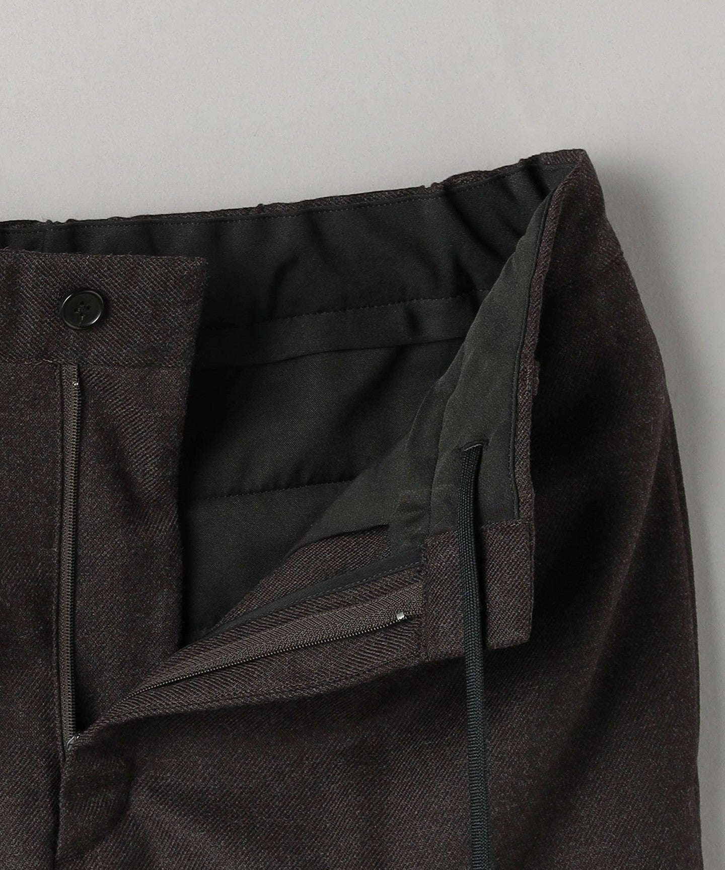 These easy slacks are made of a warm material suitable for the autumn and winter seasons and feature elastic shirring on the back.